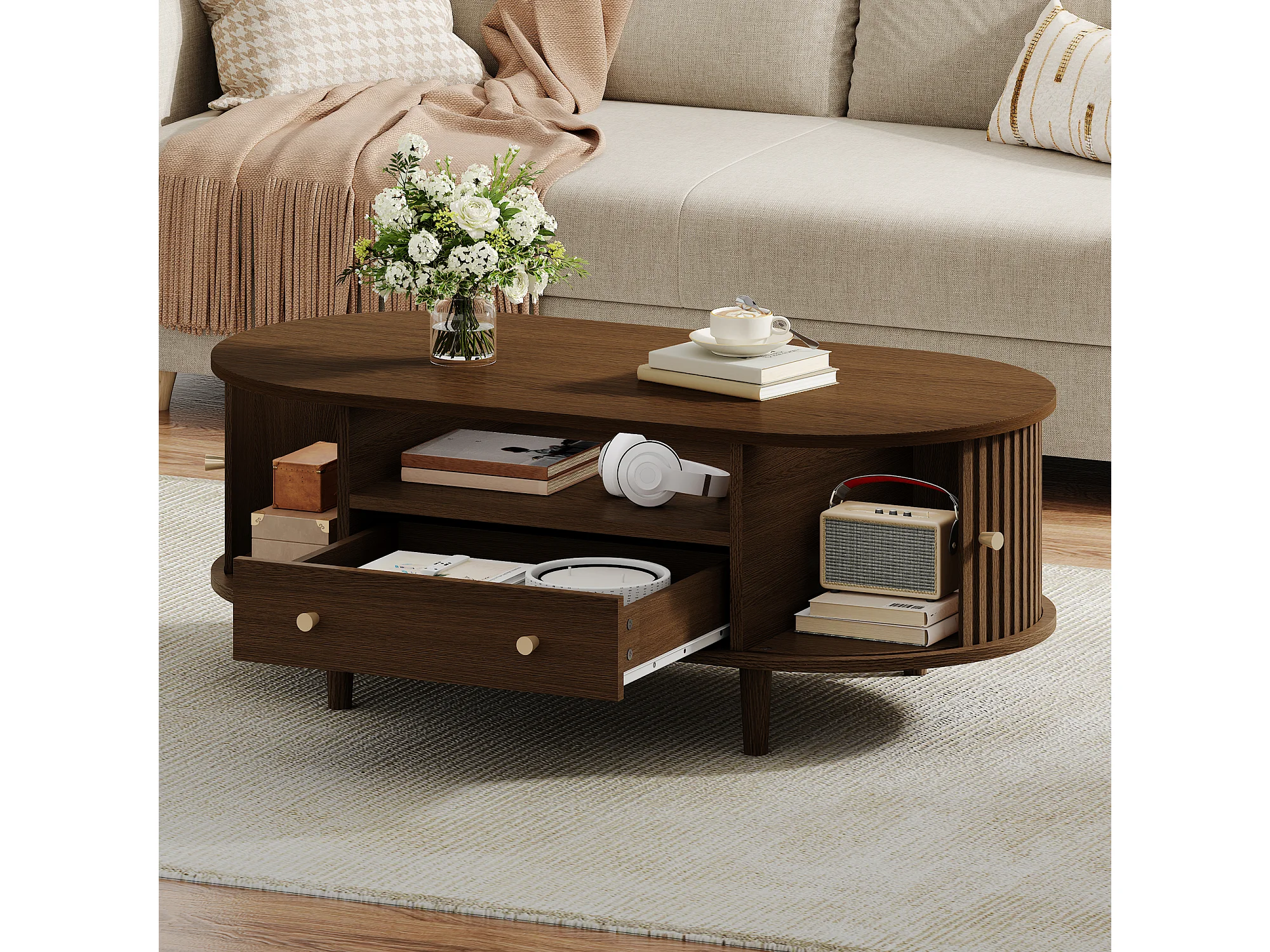 Table basse de salon finition noyer - 100 x 50 x 36 cm - avec 2 tiroirs + porte enroulable - aggloméré - marron