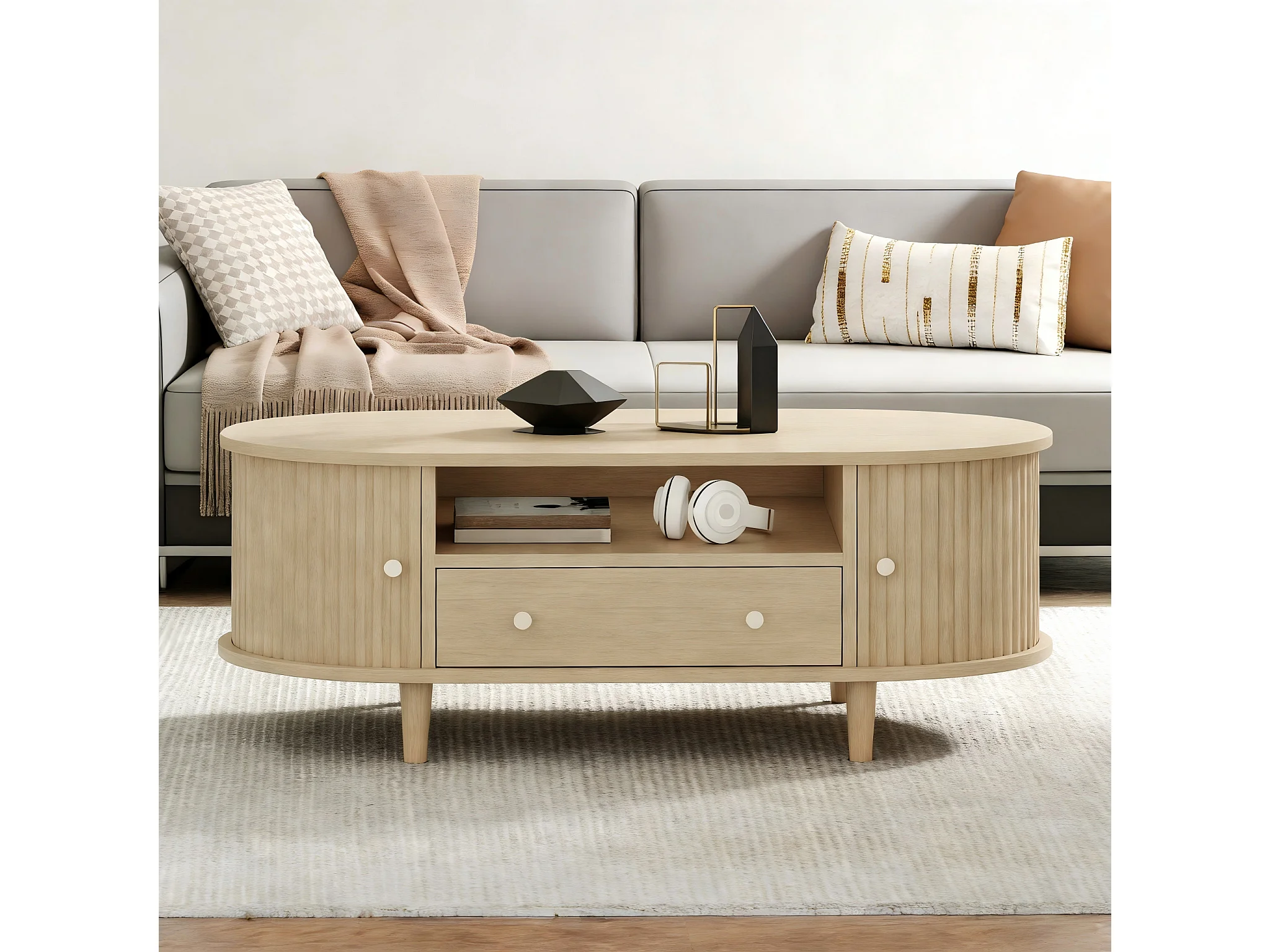 Table basse de salon - 100 x 50 x 36 cm - avec 1 tiroir + portes coulissantes - MDF - naturel