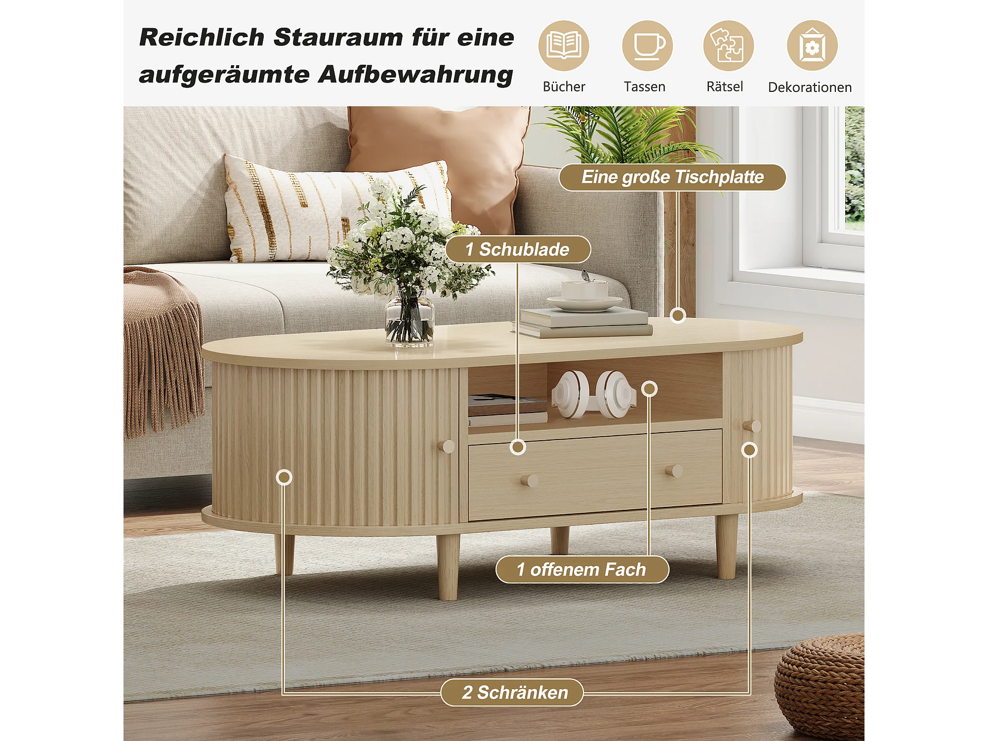 Table basse de salon - 100 x 50 x 36 cm - avec tiroir + rangement ouvert + portes coulissantes - MDF - naturel