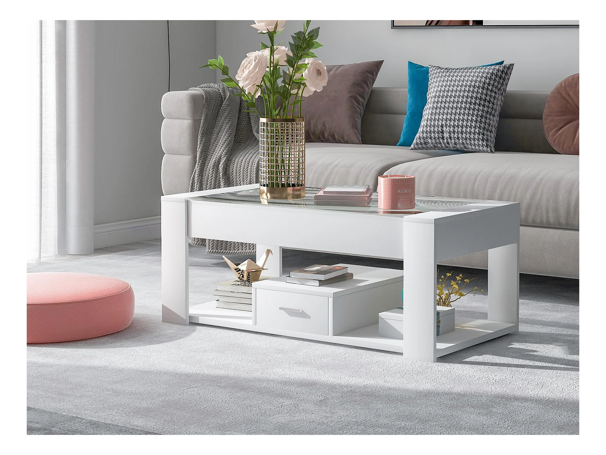 Table basse avec grand tiroir - 100x50x32 cm - LEDs - plateau en verre - Panneaux de particules - Blanc brillant