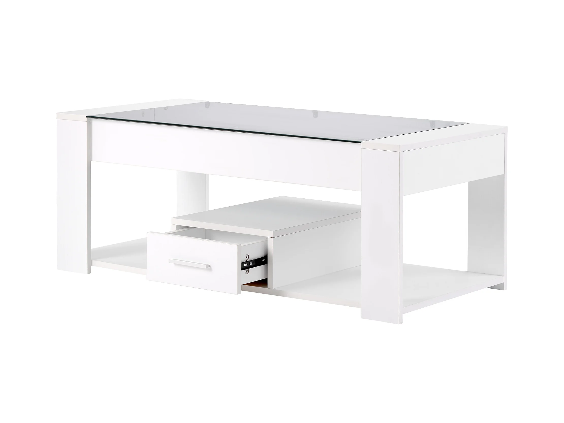 Table basse blanche brillante 95x50x42,5 cm - avec 4 plateaux en verre, 2 tiroirs et 2 compartiments ouverts, meuble bas dans le séjour, table basse