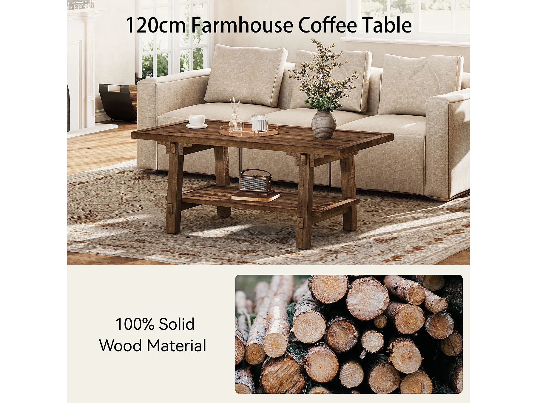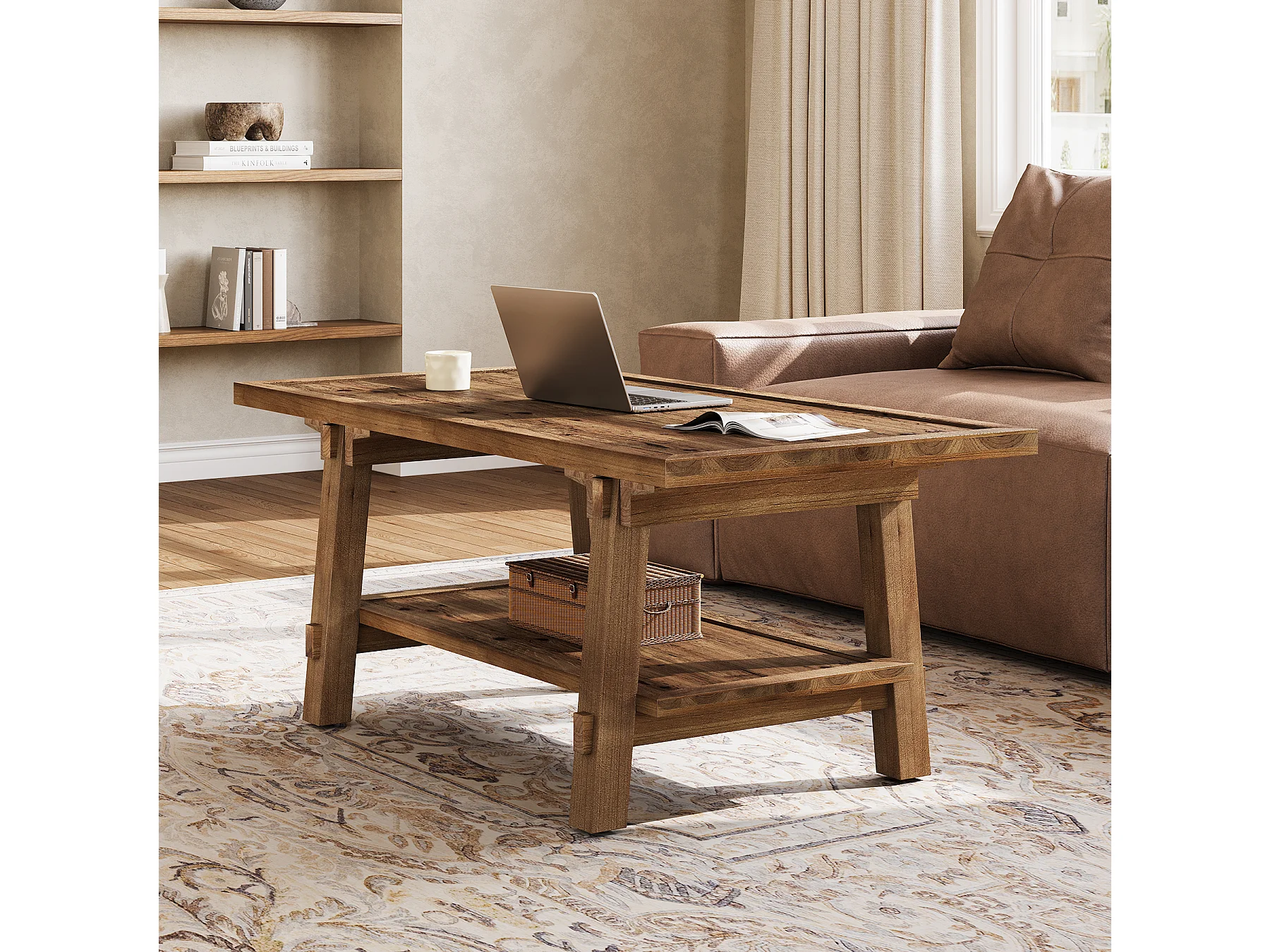Table basse de salon, table basse de style campagnard de 120 cm avec pieds robustes