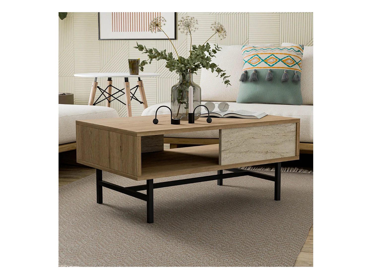 Table basse design bois et travertin avec compartiment TROSA