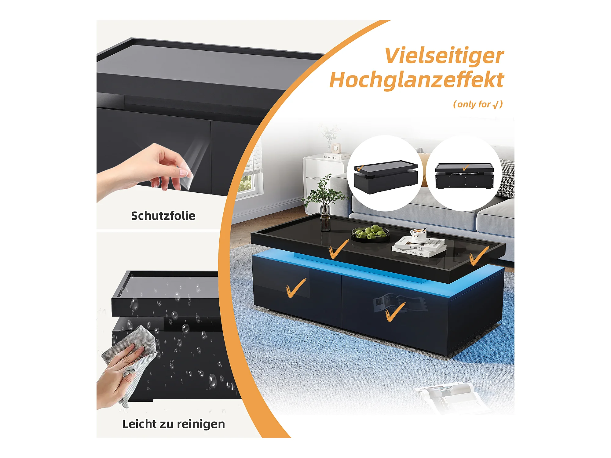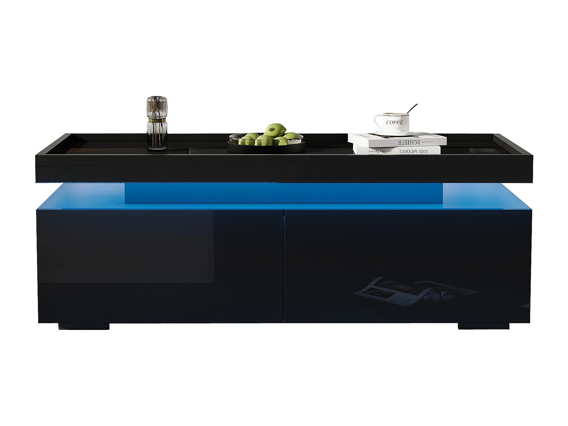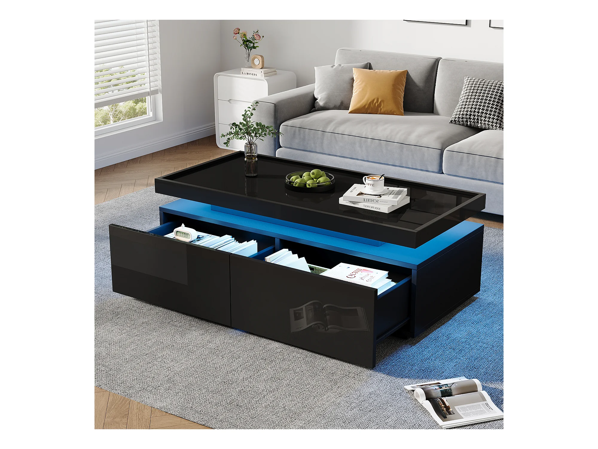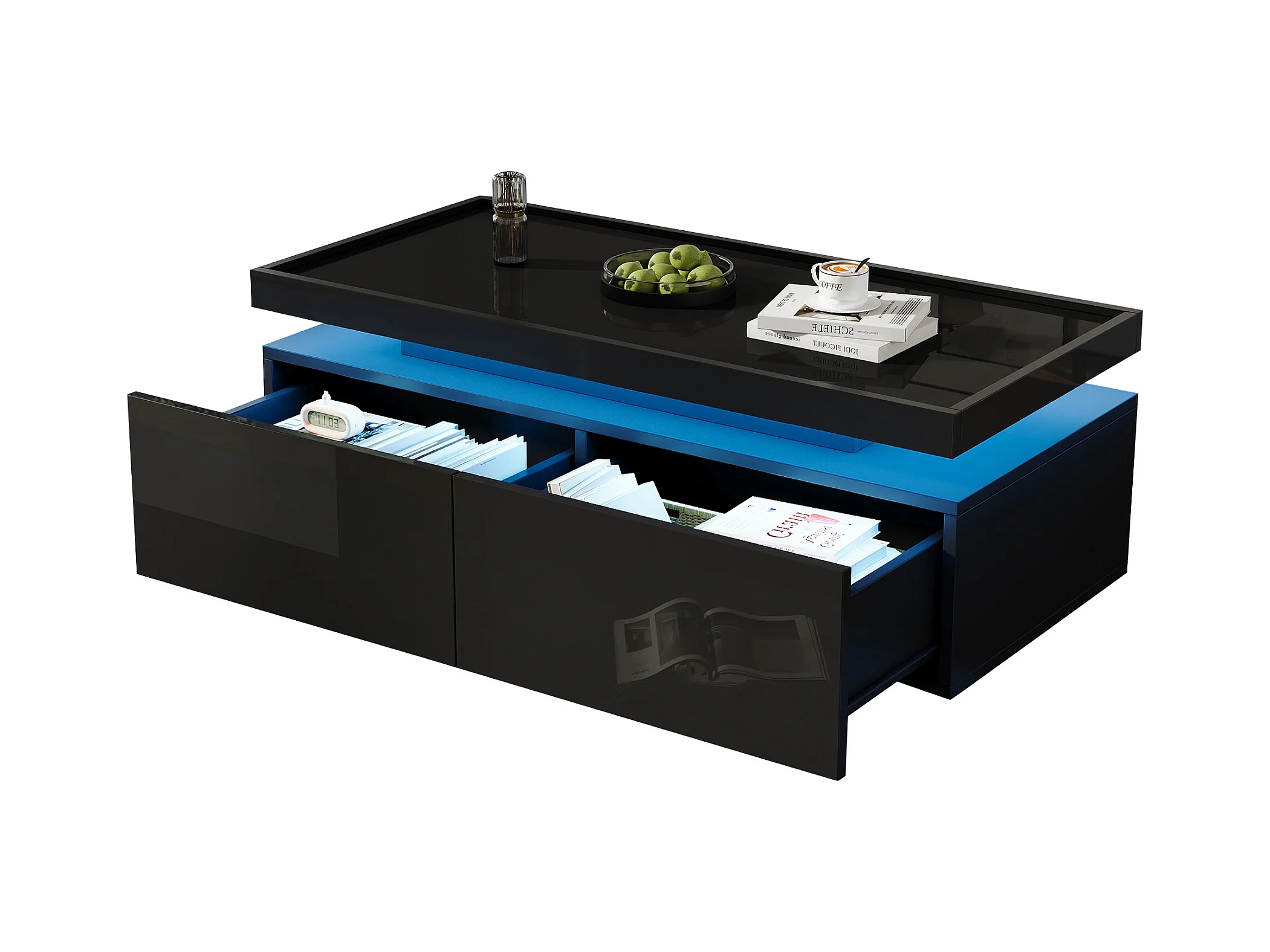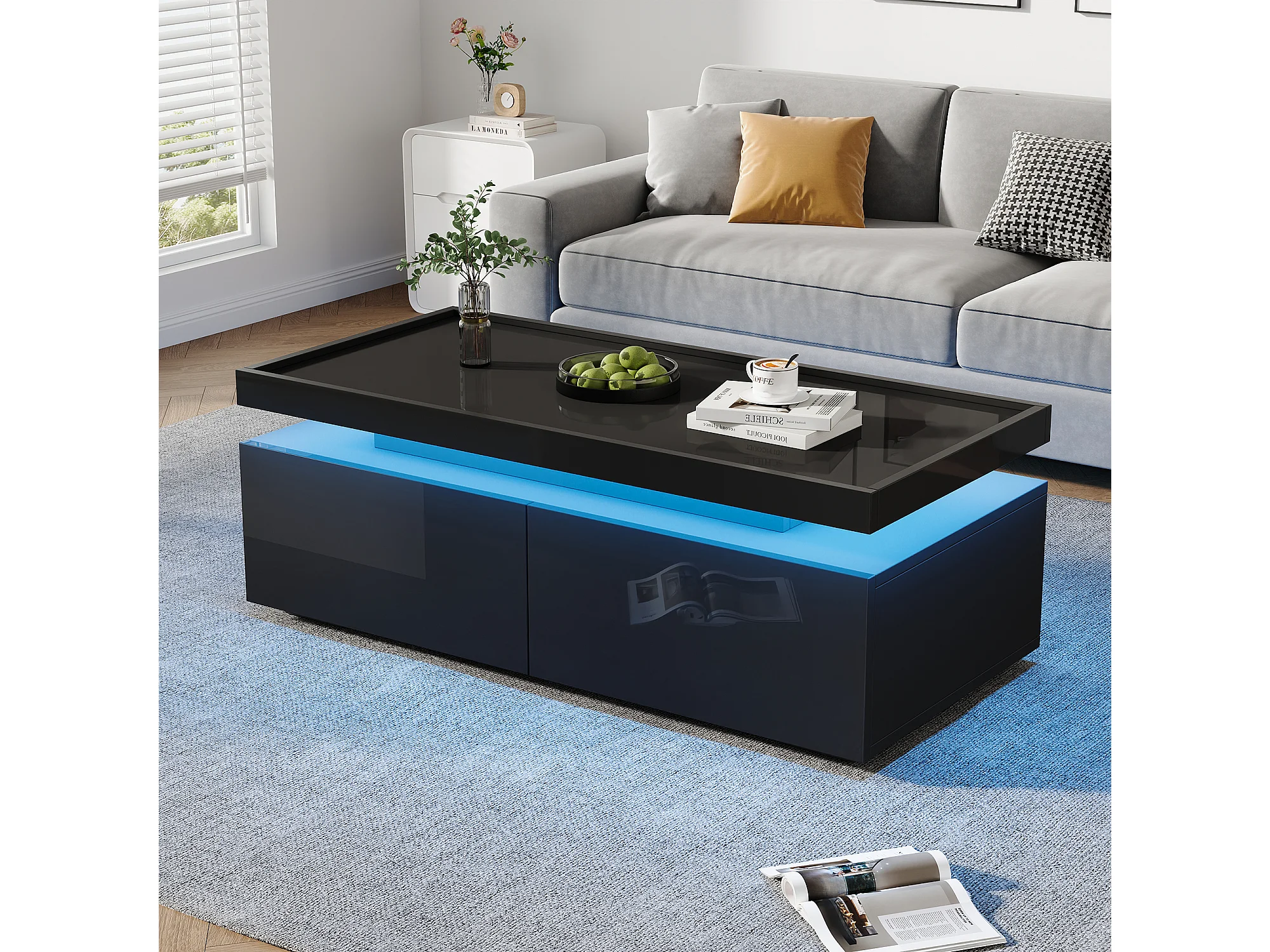 Table basse design moderne avec LED, panneau de particules, noir, 2 tiroirs (95x45x35cm)