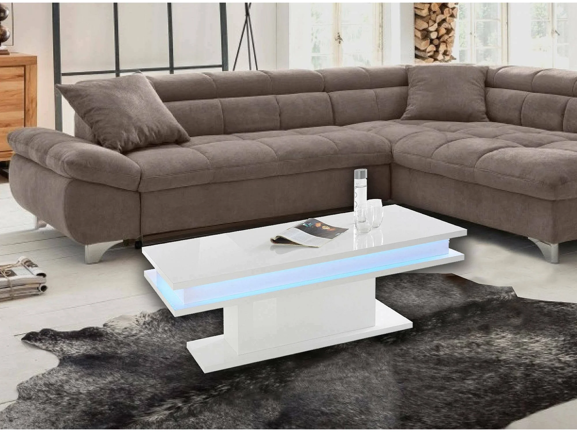 Table basse Dgandin, Table basse, Porte-revues, 100% Made in Italy, 100x55h42 cm, Blanc brillant avec lumière LED