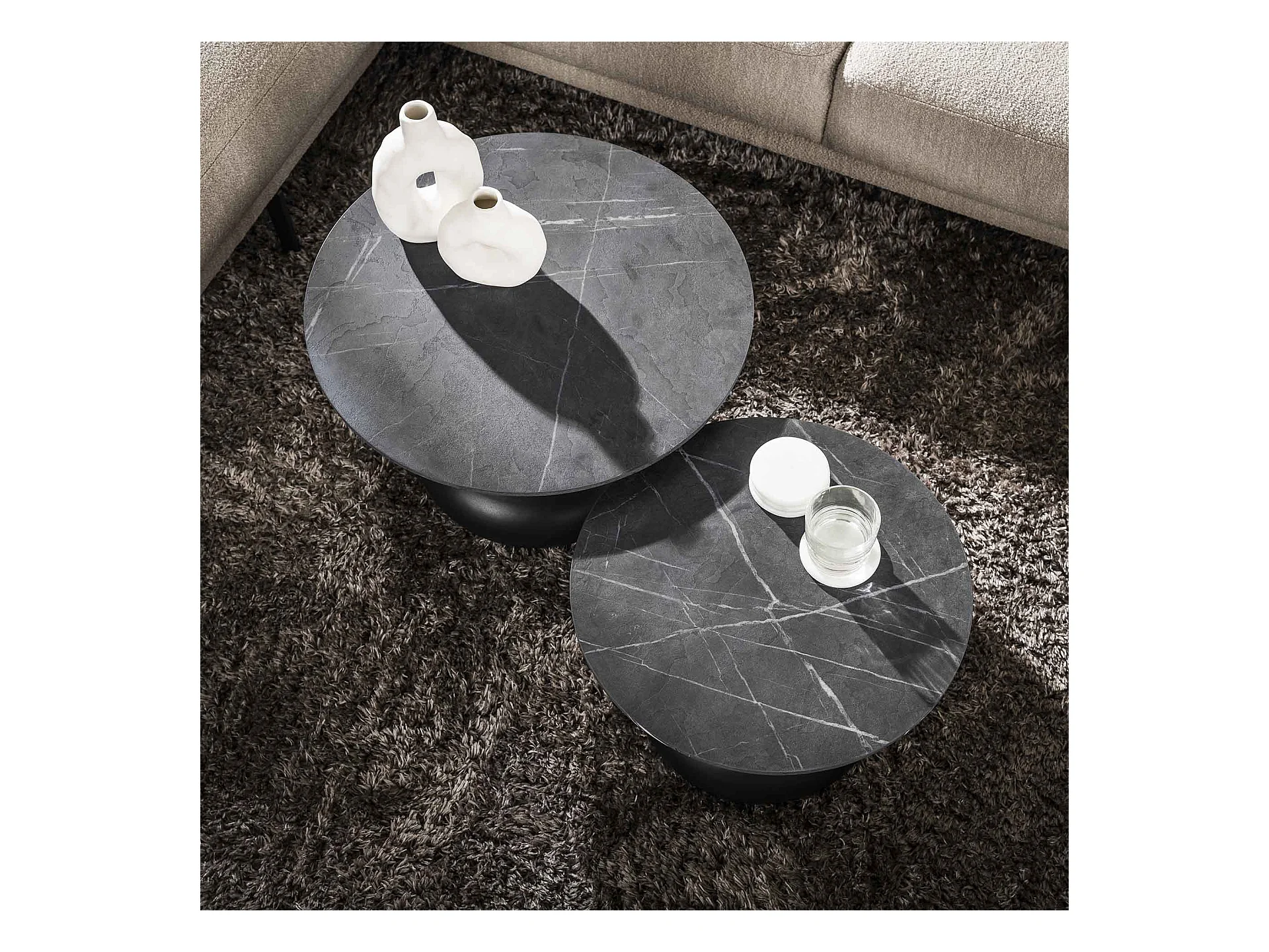 Lot de 2 tables basses gigognes - Tables d'appoint rondes - Métal + bois MDF - Aspect marbre - Noir & blanc