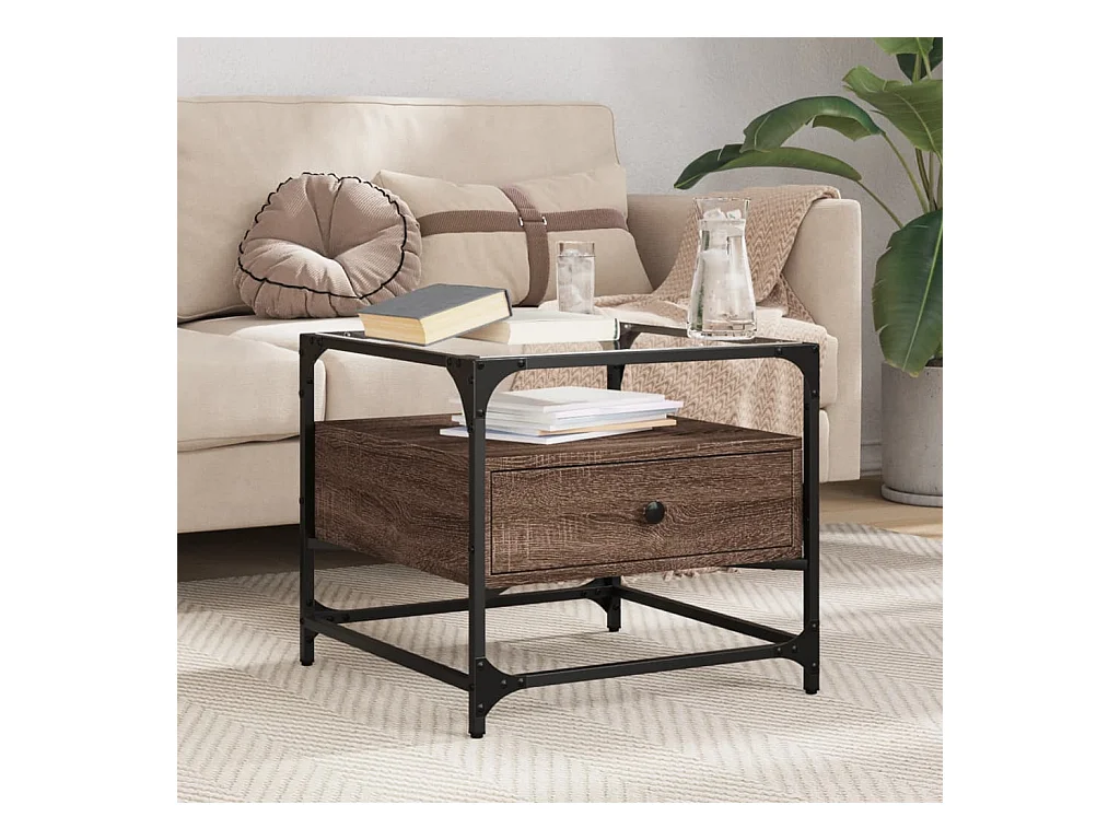 Table basse et dessus en verre chêne marron 50x50x45 cm acier