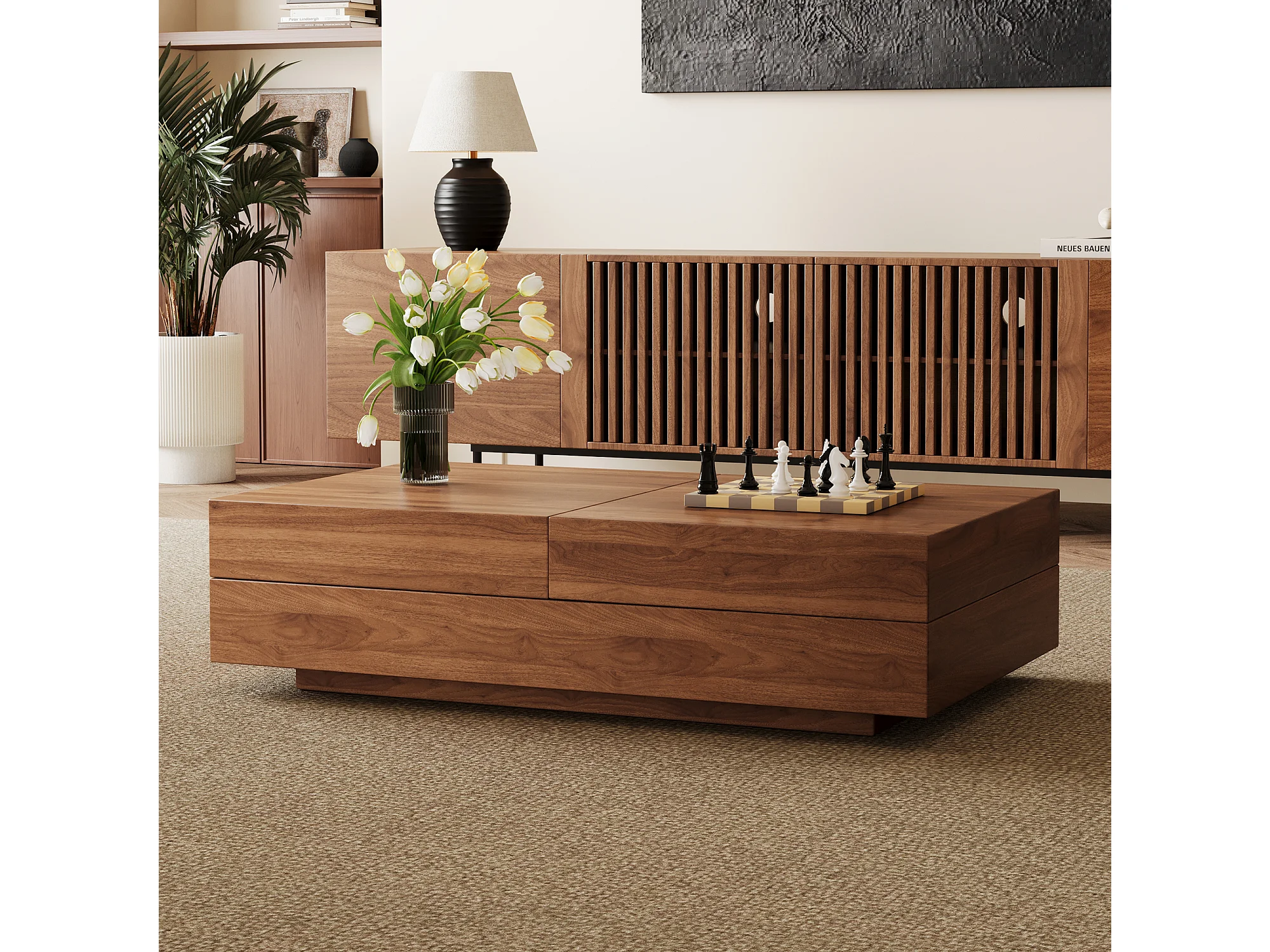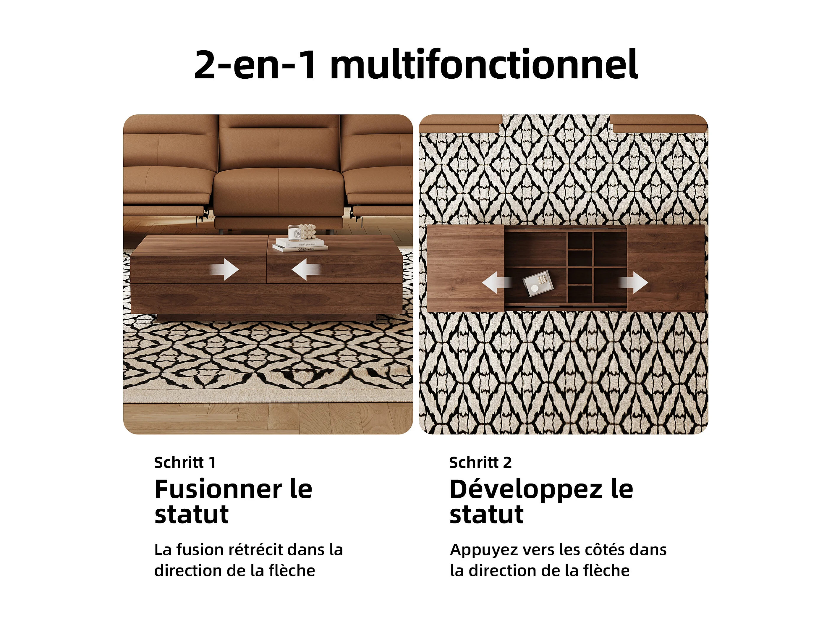 Table Basse Extensible, Design Rectangulaire, 120-208 cm, Rangement Caché, Moderne et Pratique, Noyer
