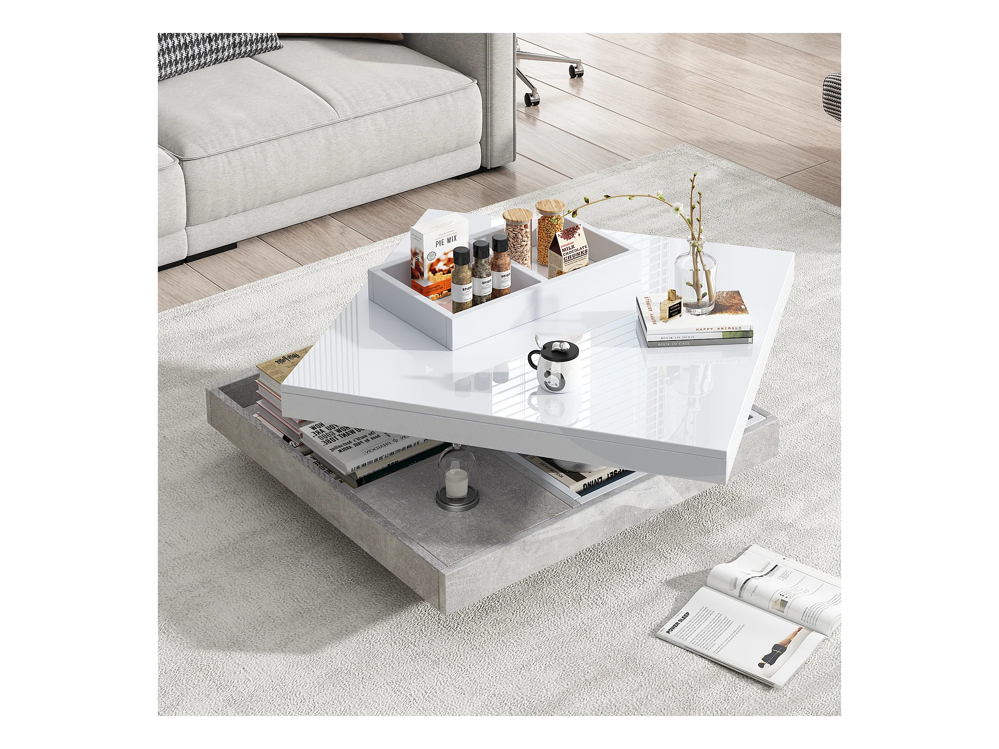 Table basse fonctionnelle avec plateau rotatif 360°, MDF blanc et effet marbre, (70x70x36 cm)