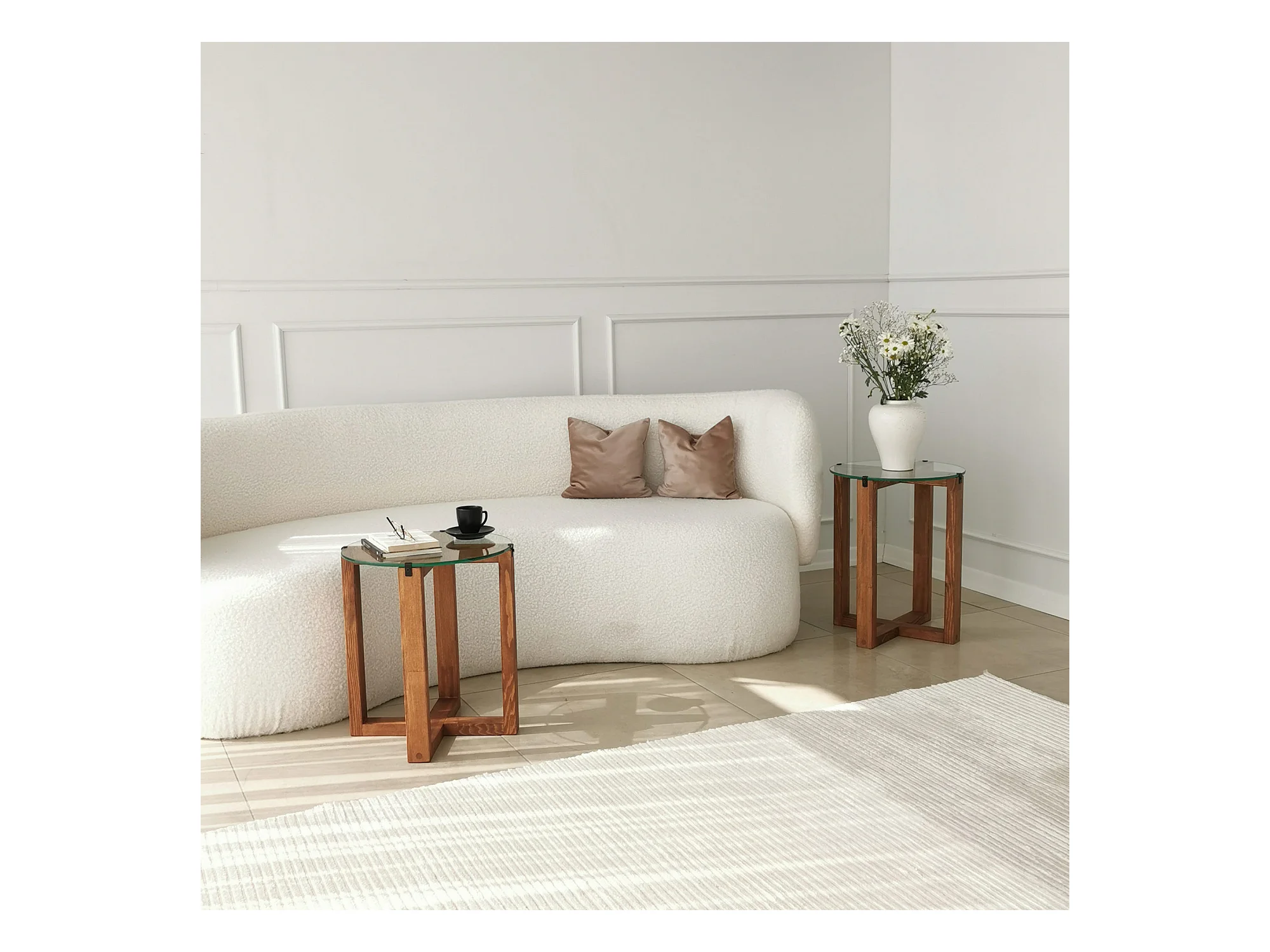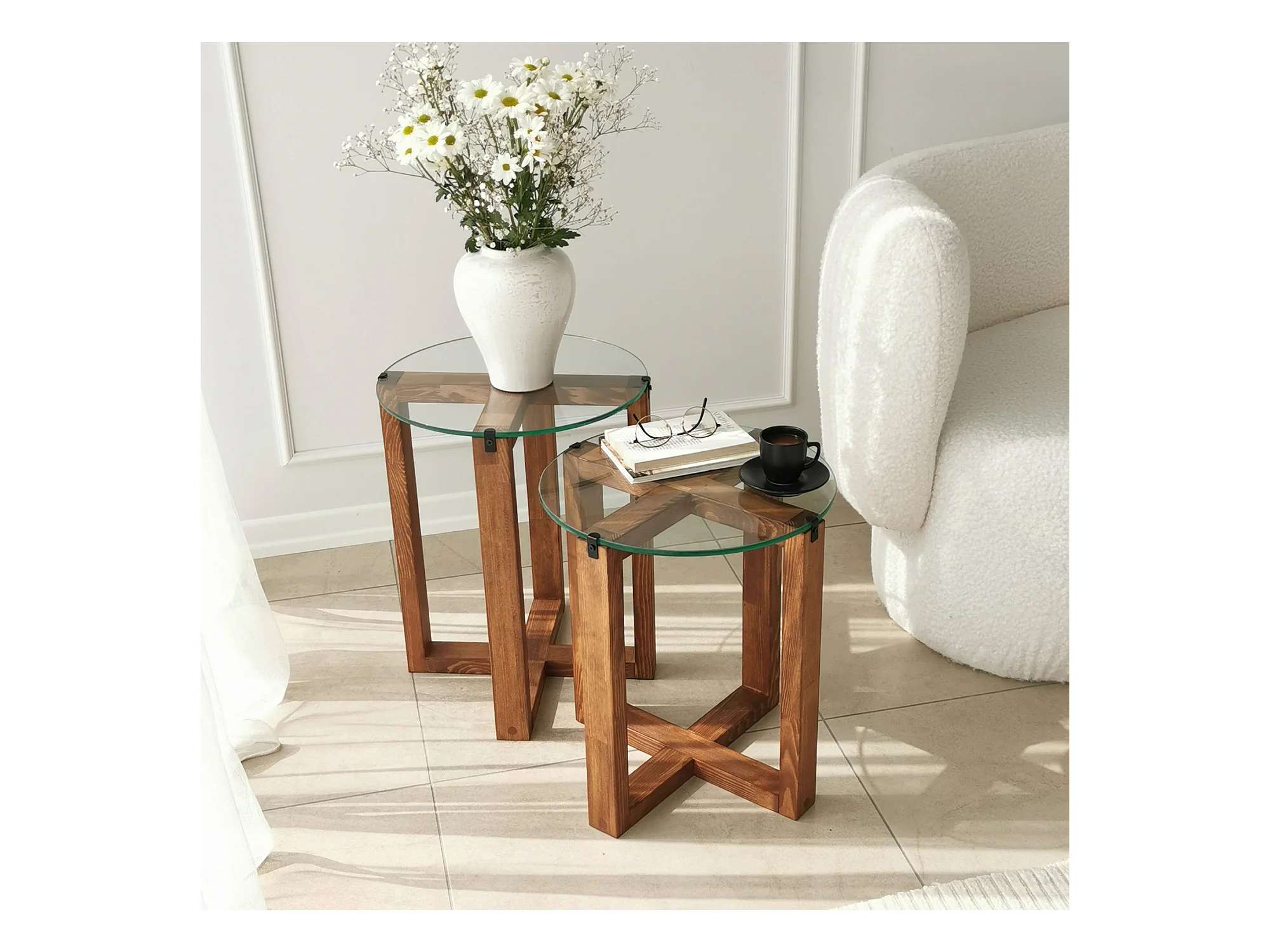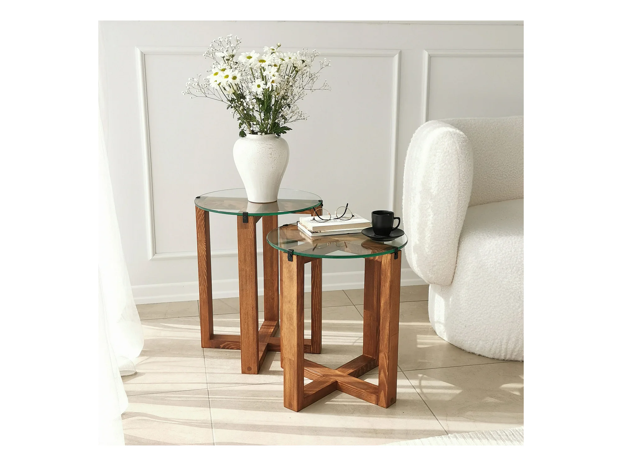 Table basse gigogne bois noyer mélaminé et verre trempé Mouka - Lot de 2