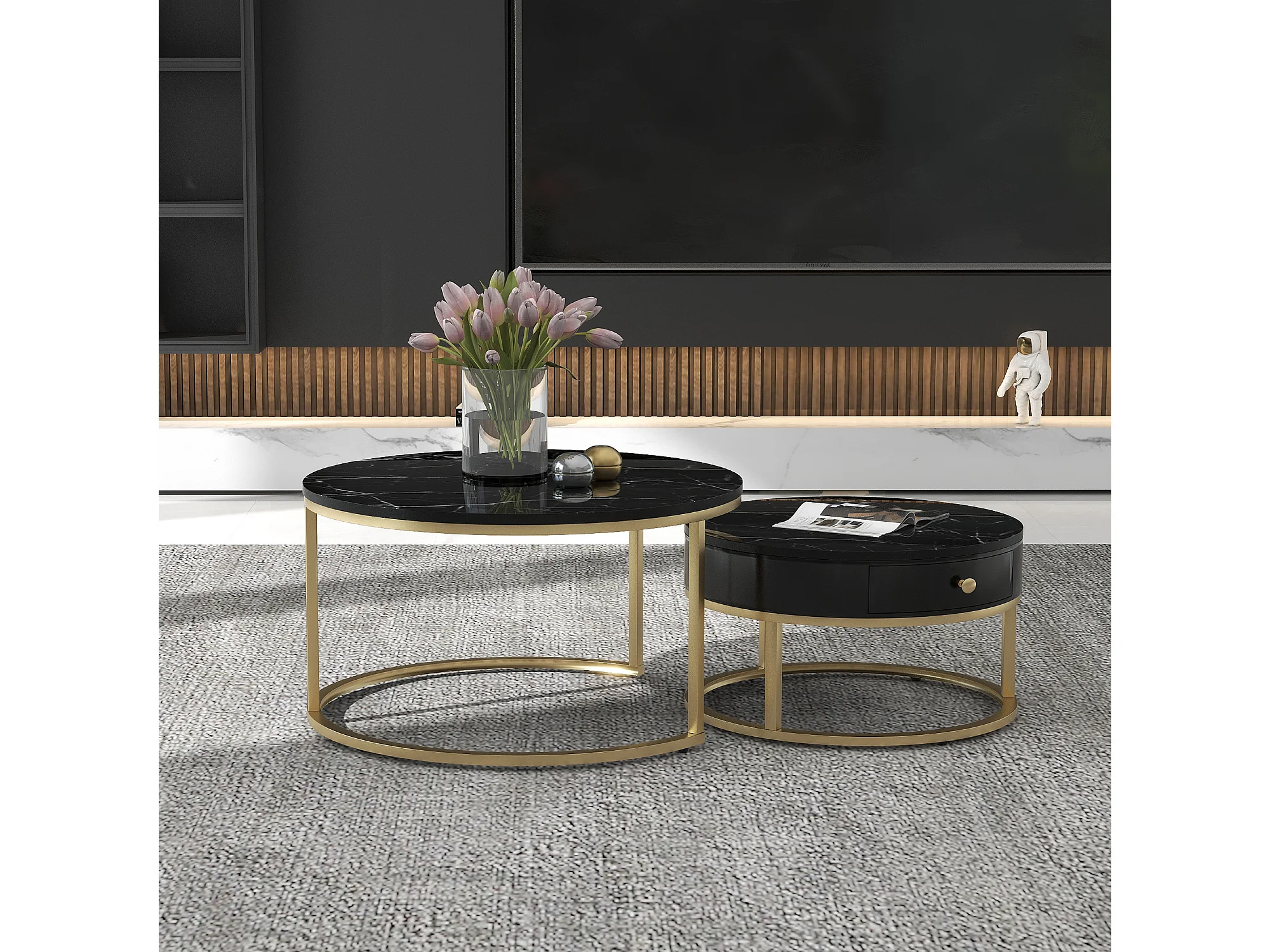 Table basse gigogne moderne, plateau marbré brillant, MDF, cadre noir (70x70x48cm et 50x50x43.5cm)