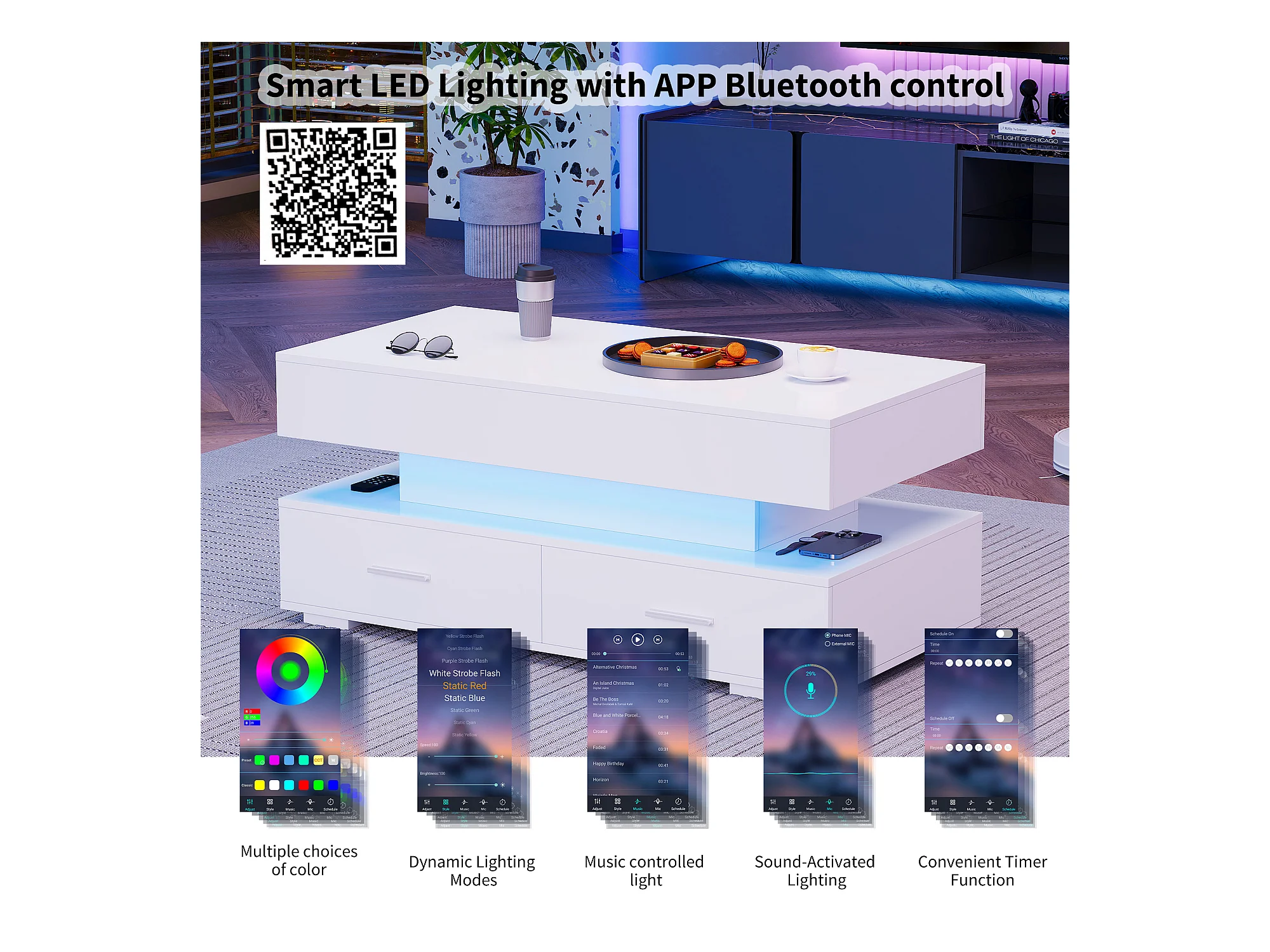 Table basse LED avec plateau relevable, 4 tiroirs, design moderne, blanc, (100x50x45 cm)
