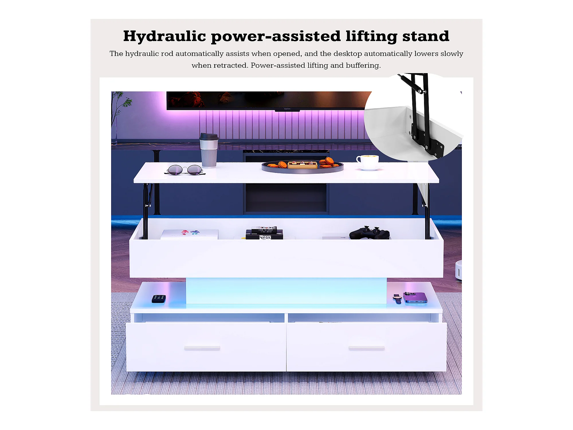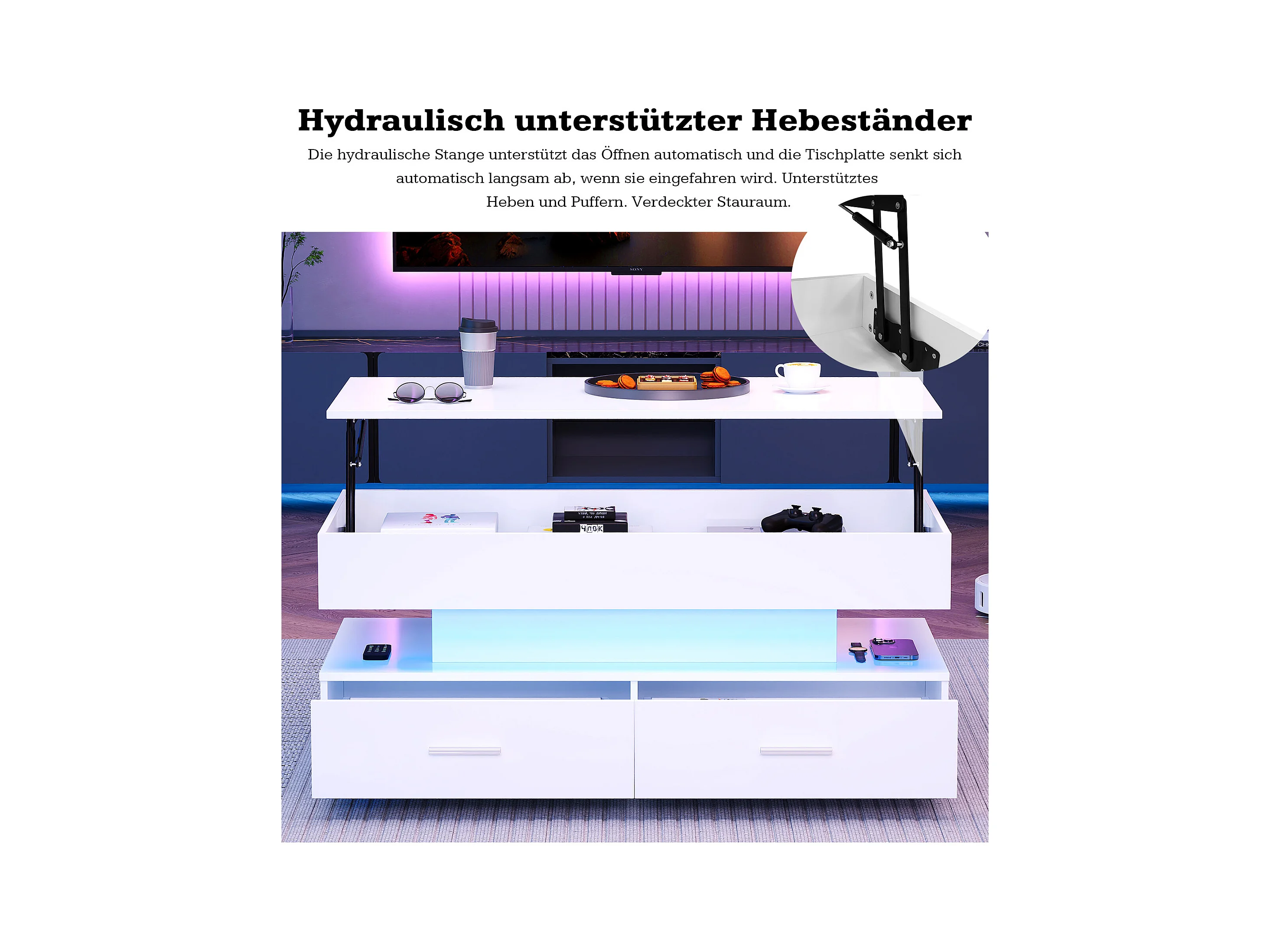 Table basse hydraulique avec réglage de hauteur, LED, 2 tiroirs, stockage ouvert, blanc (100 x 50 x 44 cm)
