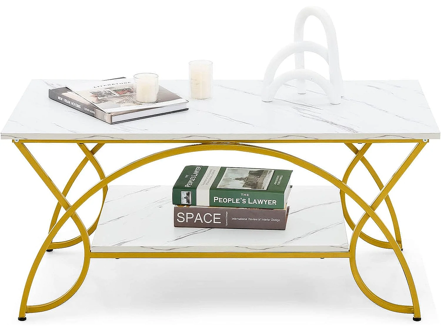 Table d'appoint Ronde Moderne à 2 Niveaux avec Cadre en Forme de C, Petite Table d'appoint Basse, Blanc/doré (1)