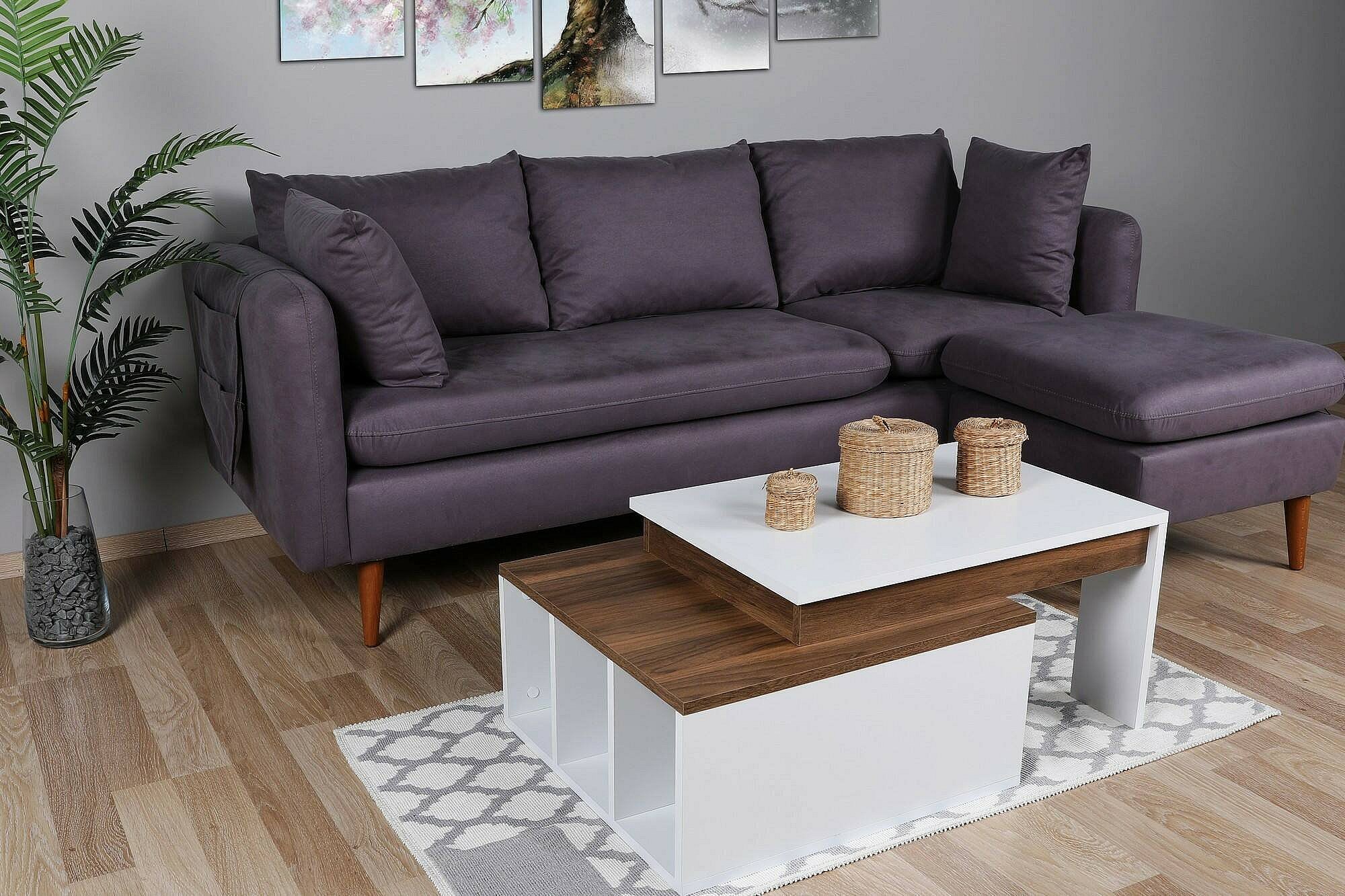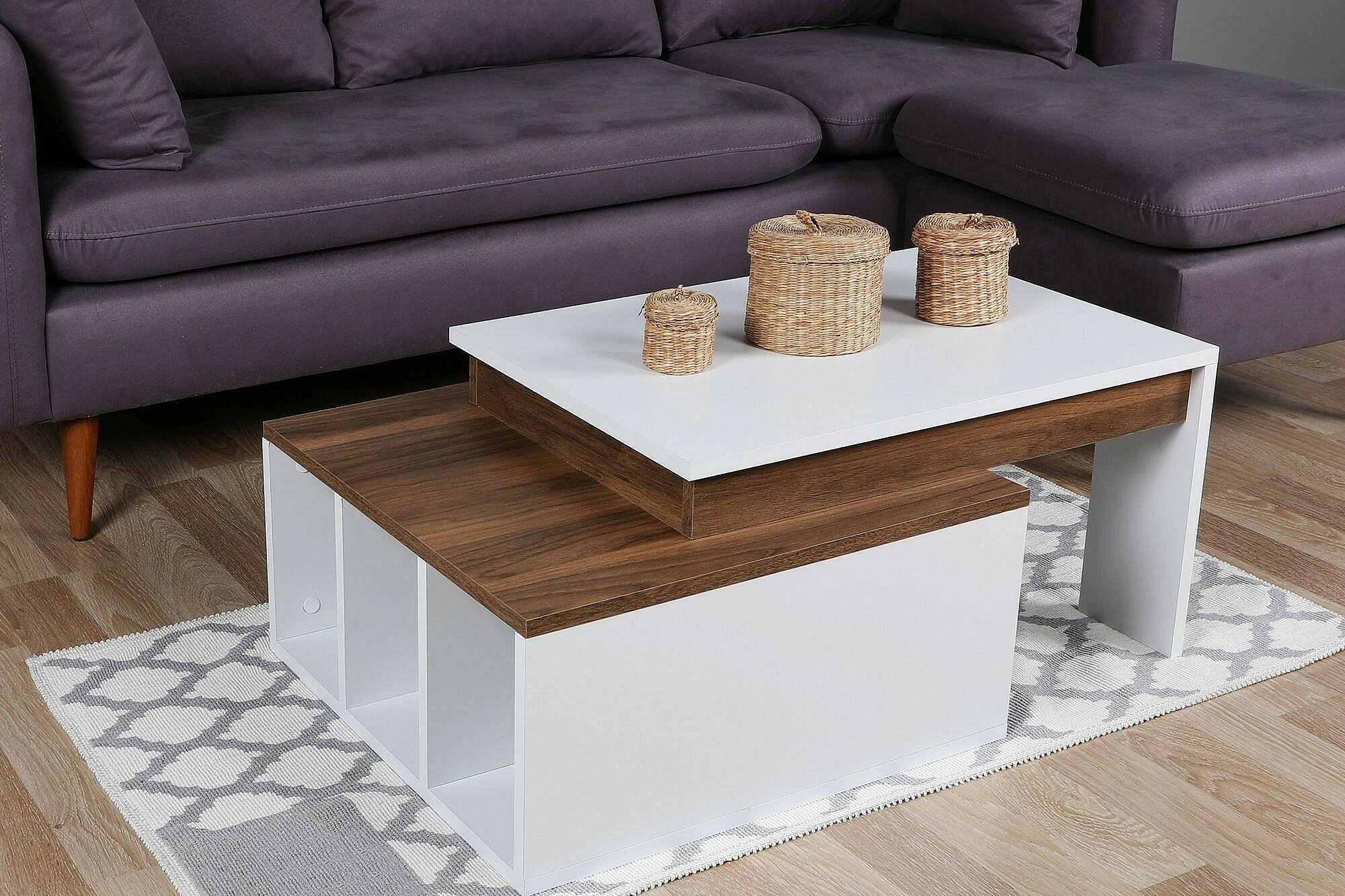 Table basse Jabhat, Table basse, Porte-revues pour canapé, Etagère de salon, 90x60h37 cm, Blanc et Noyer