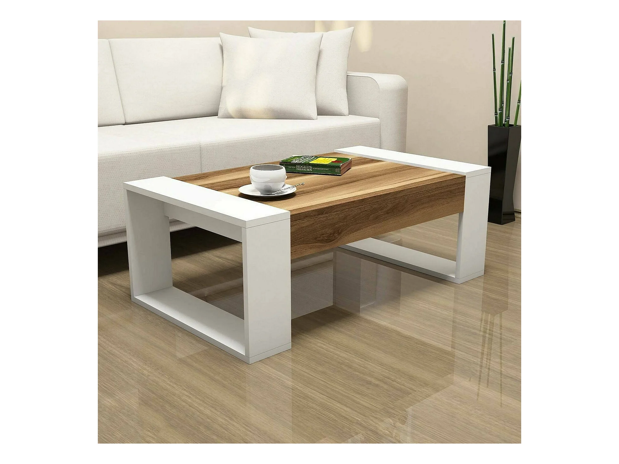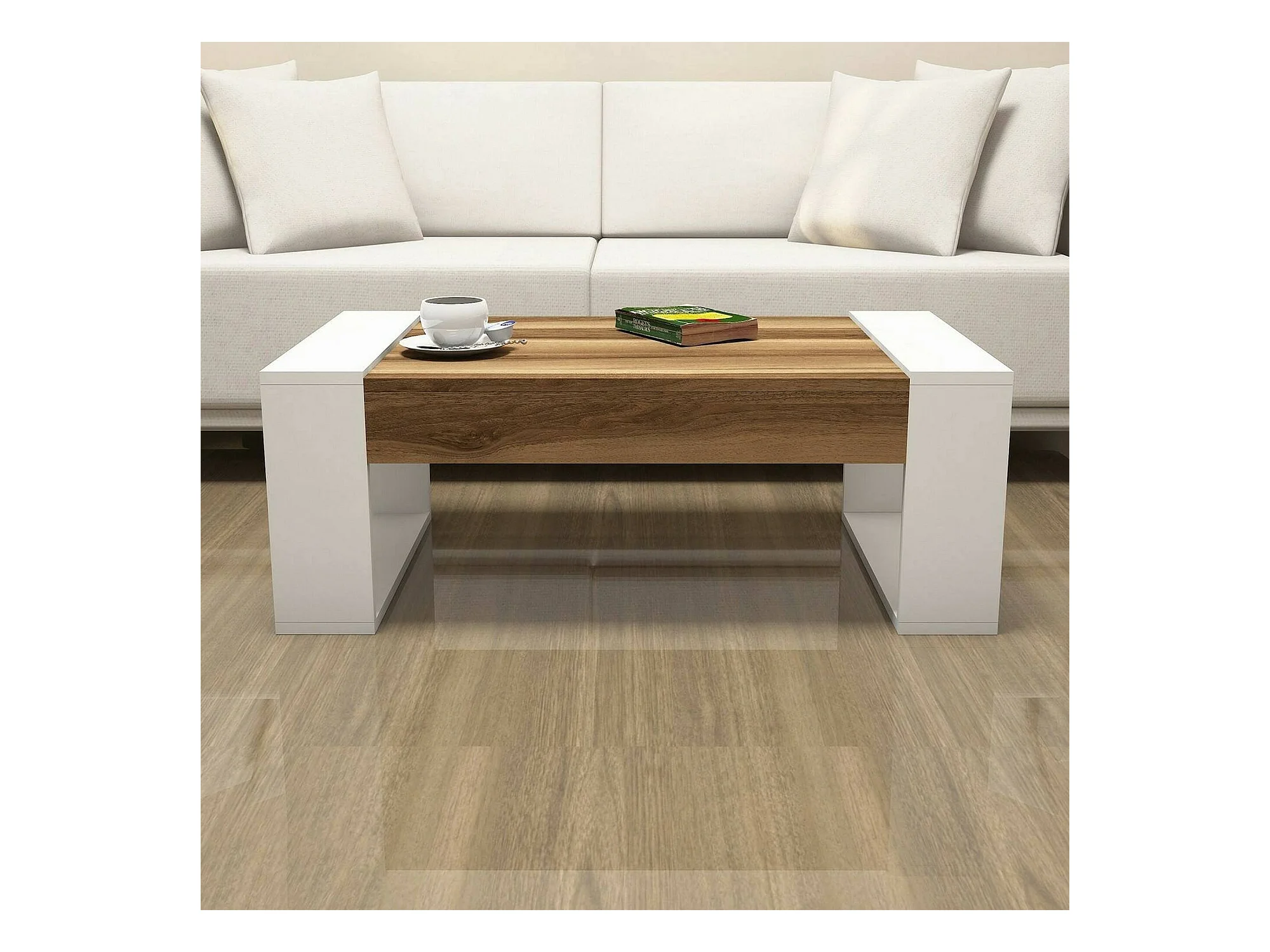 Table basse Kekouan, Table basse, Porte-revues pour canapé, Etagère de salon, 102x60h38 cm, Noyer et Blanc