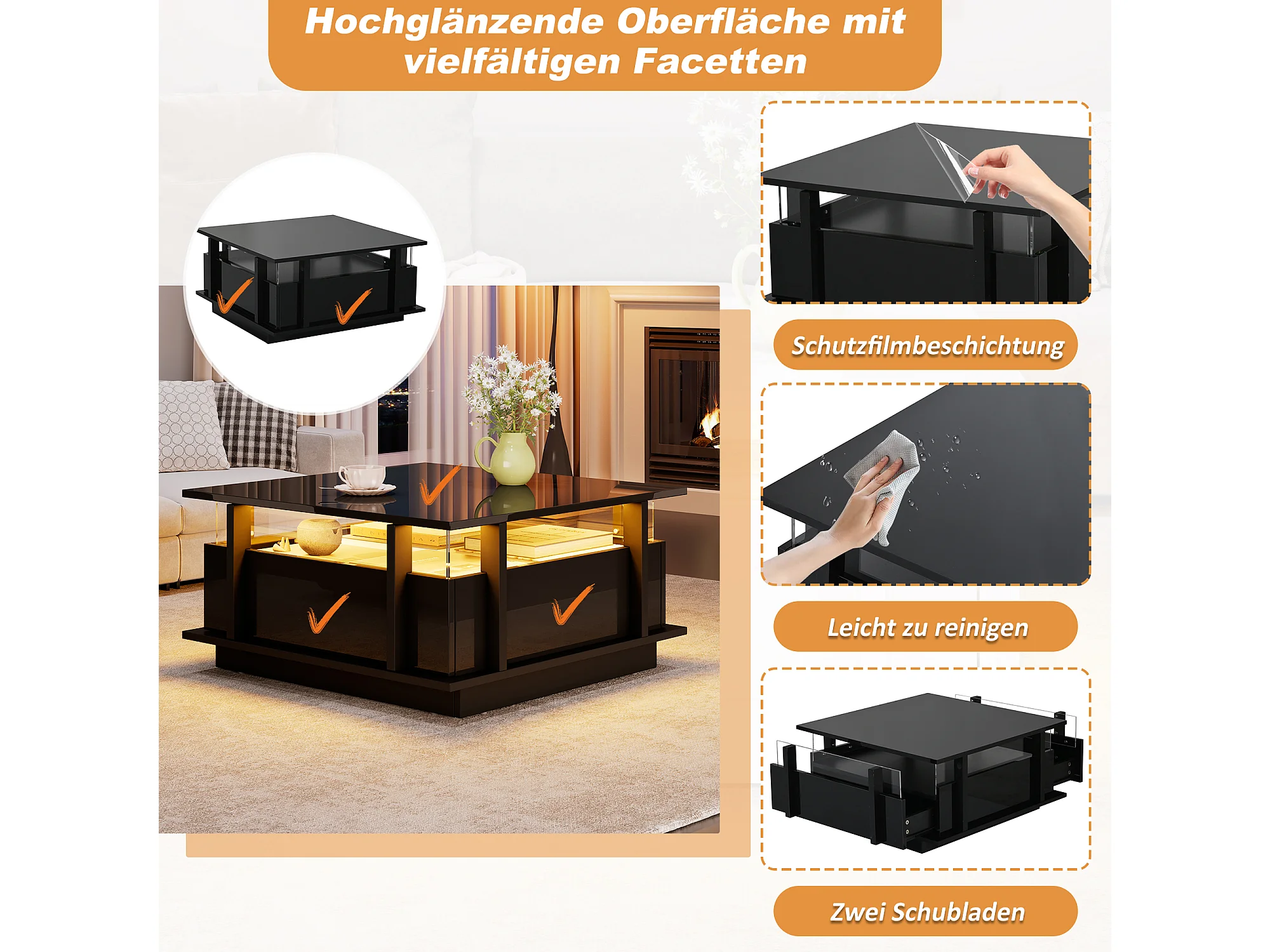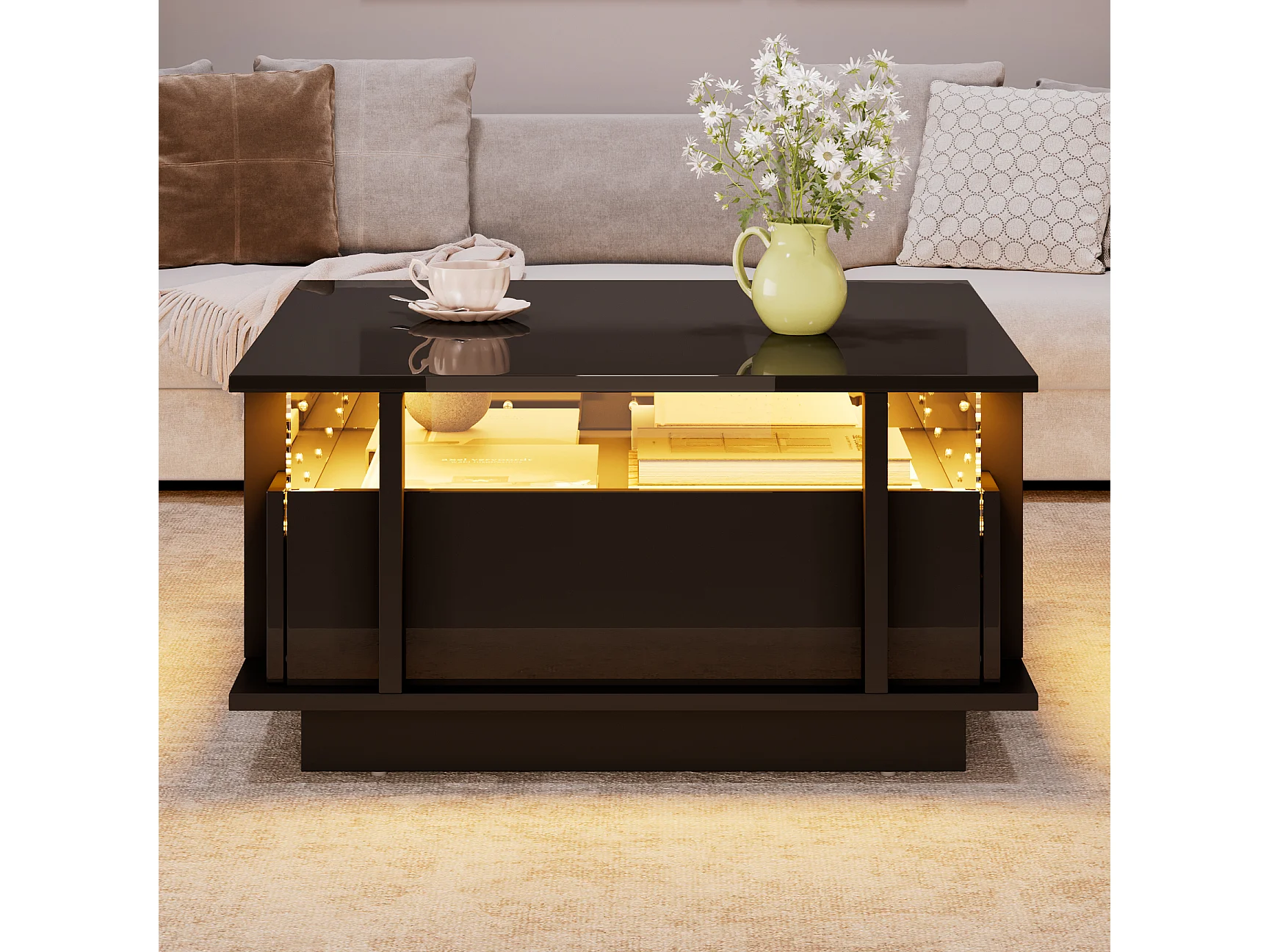Table basse brillante - 70 x 70 x 40 cm - avec Leds + 4 tiroirs - Aggloméré - noir
