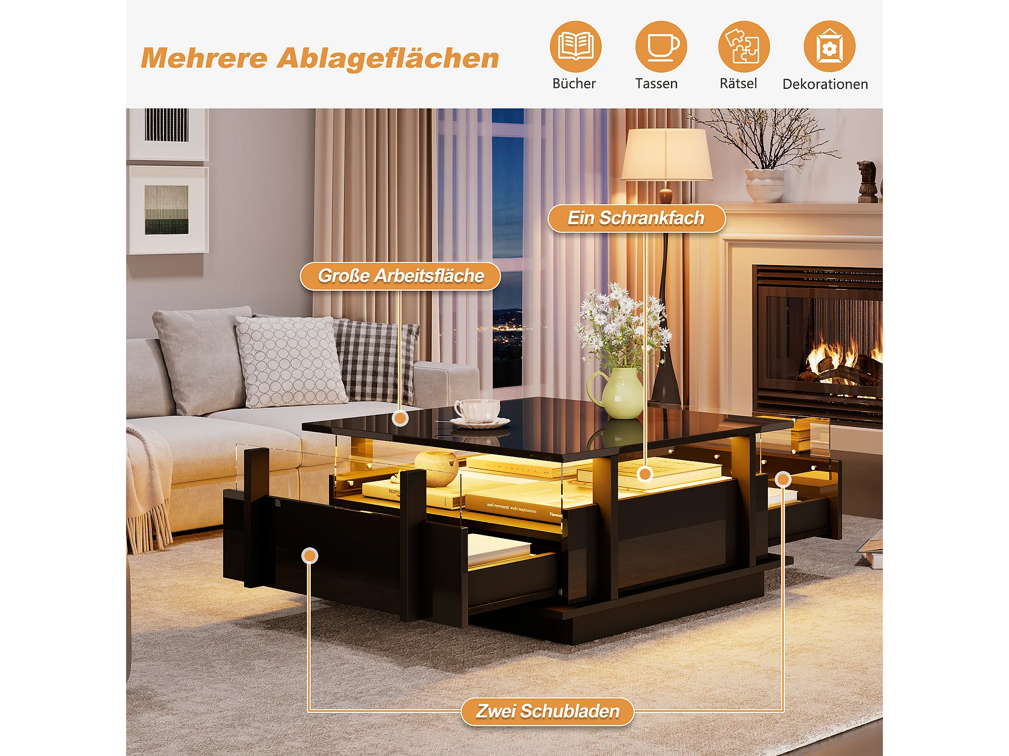 Table basse moderne avec 2 tiroirs et espace transparent - 70 x 70 x 41 cm - LEDs - Panneaux de particules - Noir brillant
