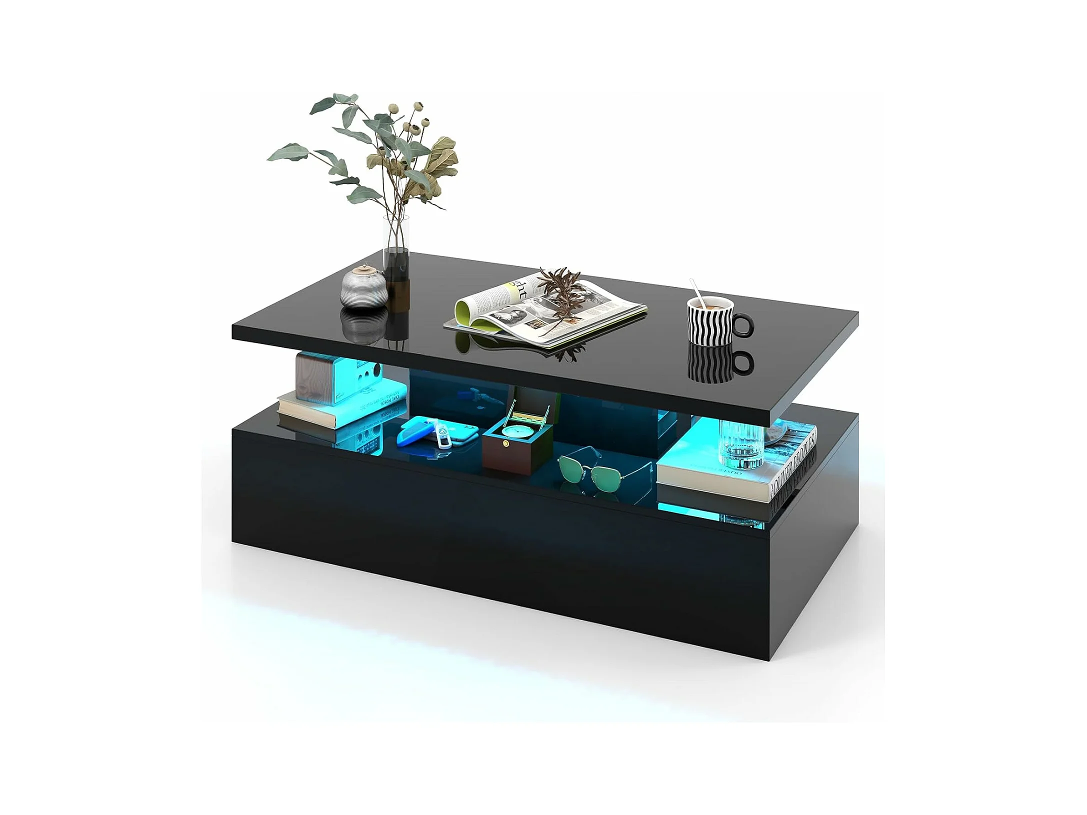 Table basse noir avec plateau réglable en hauteur - Table basse avec éclairage LED et 1 tiroir - rangement ouvert