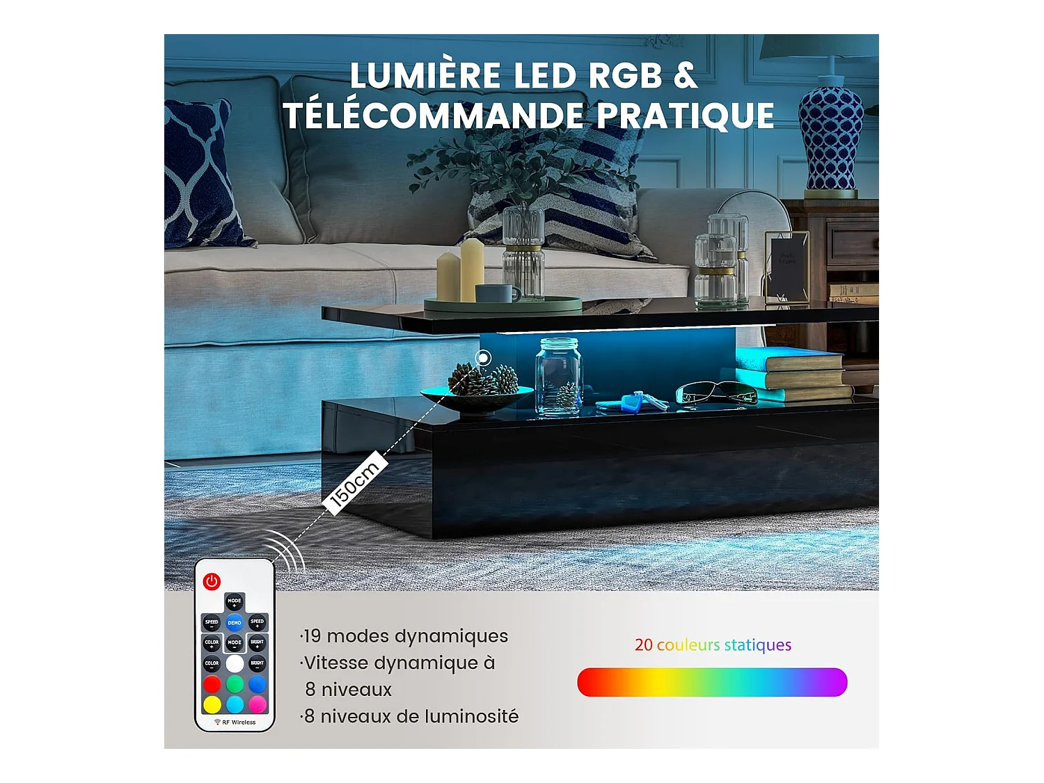 Table basse led, 20 lumières réglables avce télécommande, 19 modes dynamiques, noire
