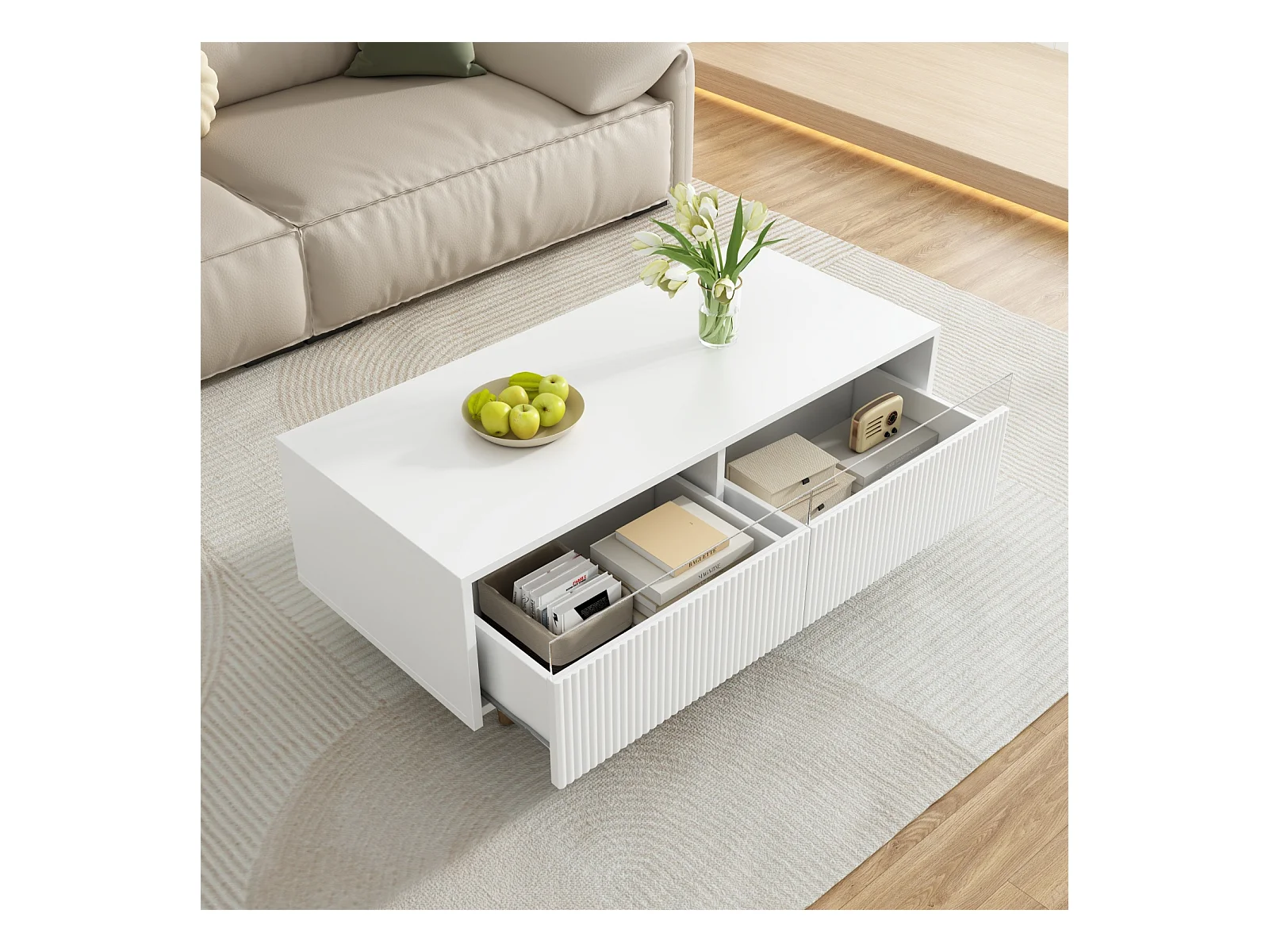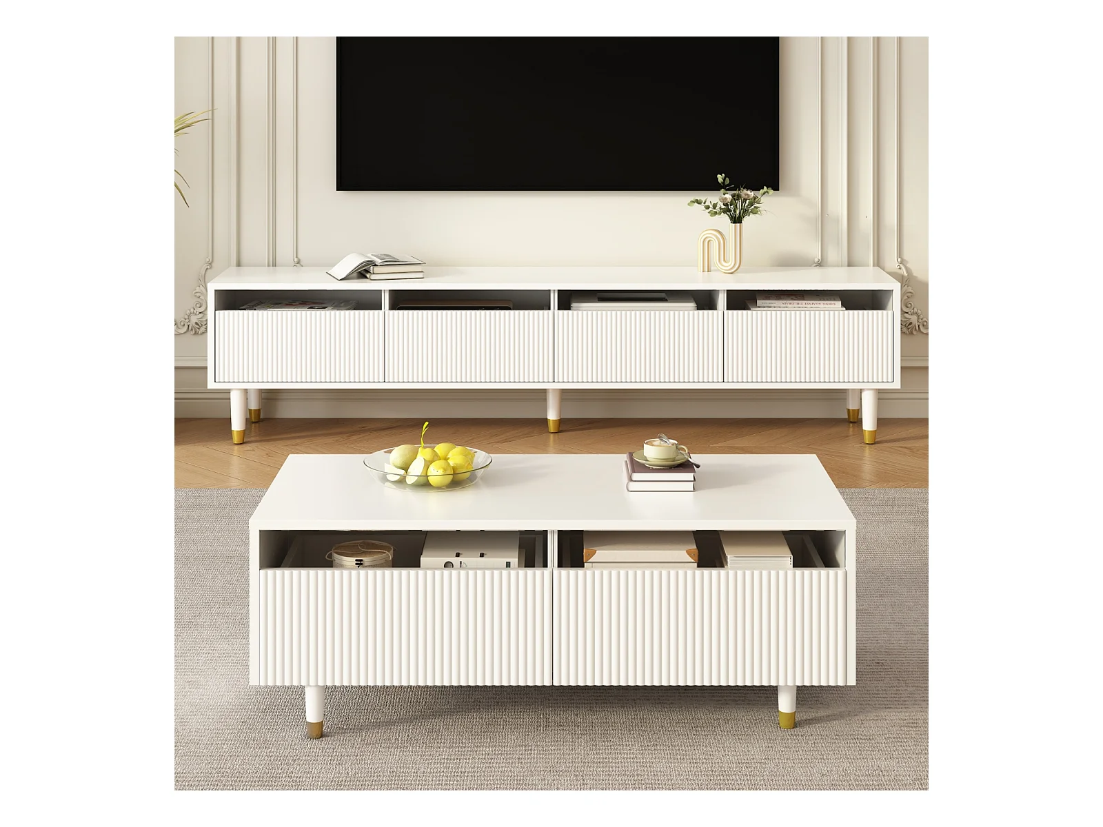 Ensemble meuble TV-table basse avec tiroirs et angles arrondis. Un design léger et luxueux pour le salon.