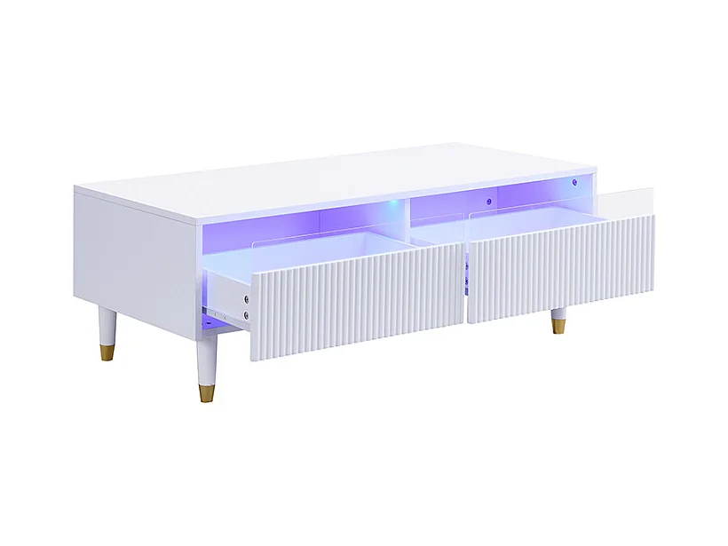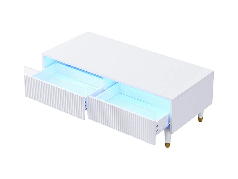 Table basse LED avec plateau ondulé, pieds dorés, 2 tiroirs et éclairage LED RVB. Meuble TV assorti disponible.