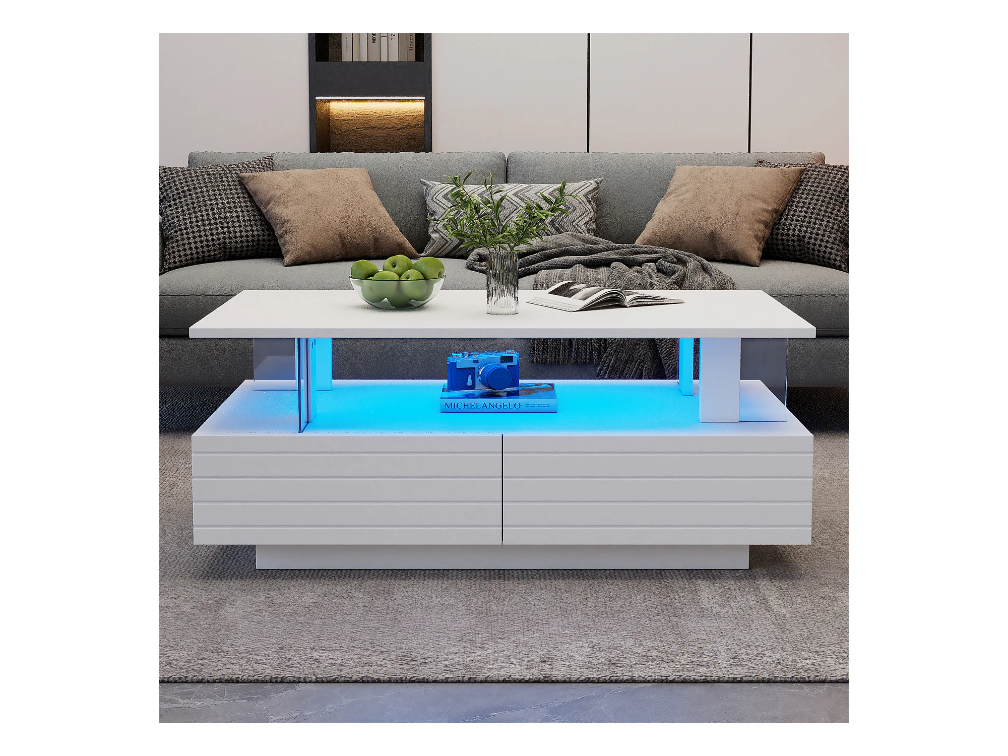 Table basse avec 2 tiroirs, finition haute brillance, 2 niveaux de rangement et lumière LED, blanc (100x50x38.5 cm)