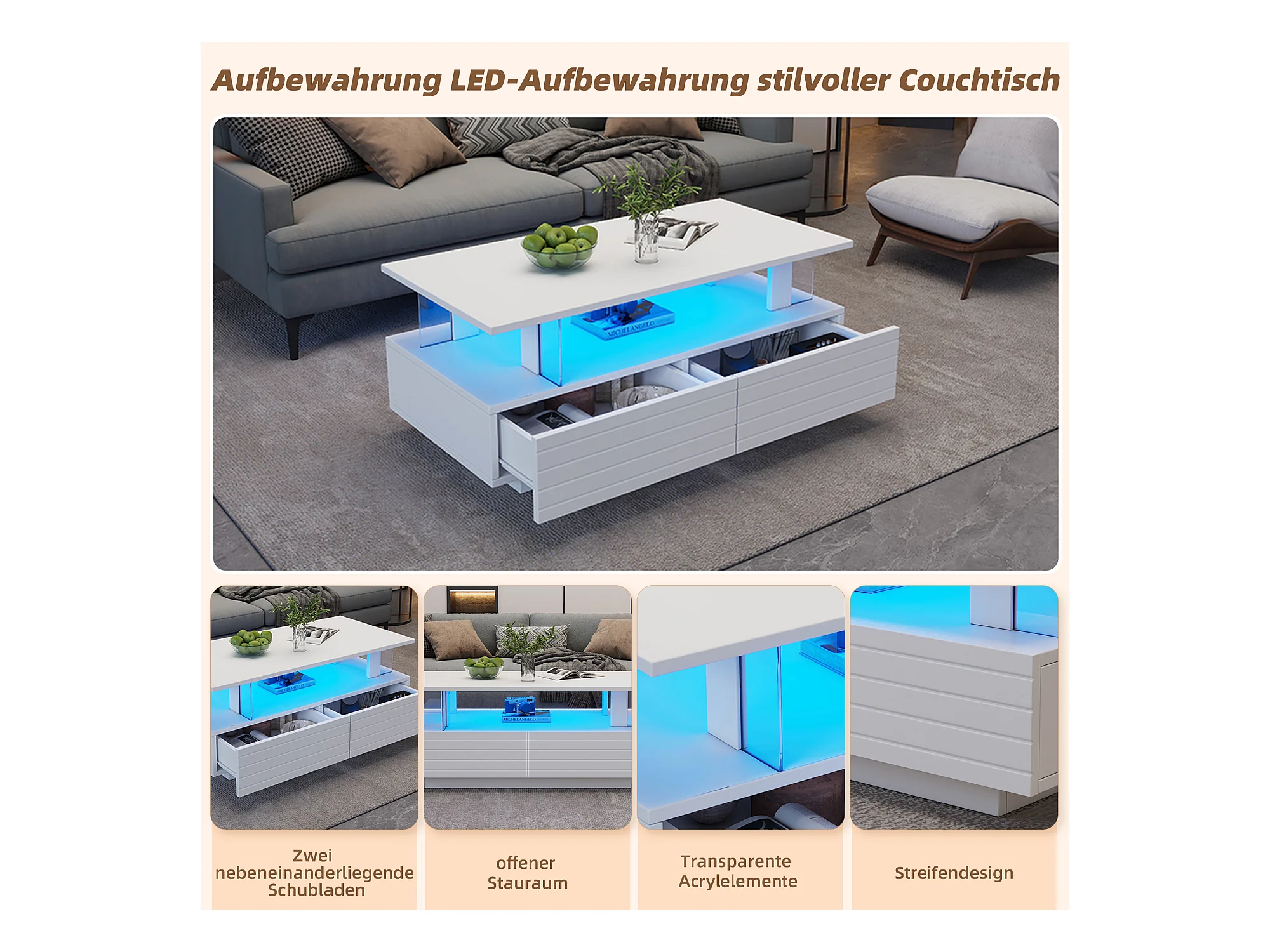Table basse réglable avec espace de rangement caché, LED, tablette avec tiroir, design moderne, blanc (100x50x40 cm)