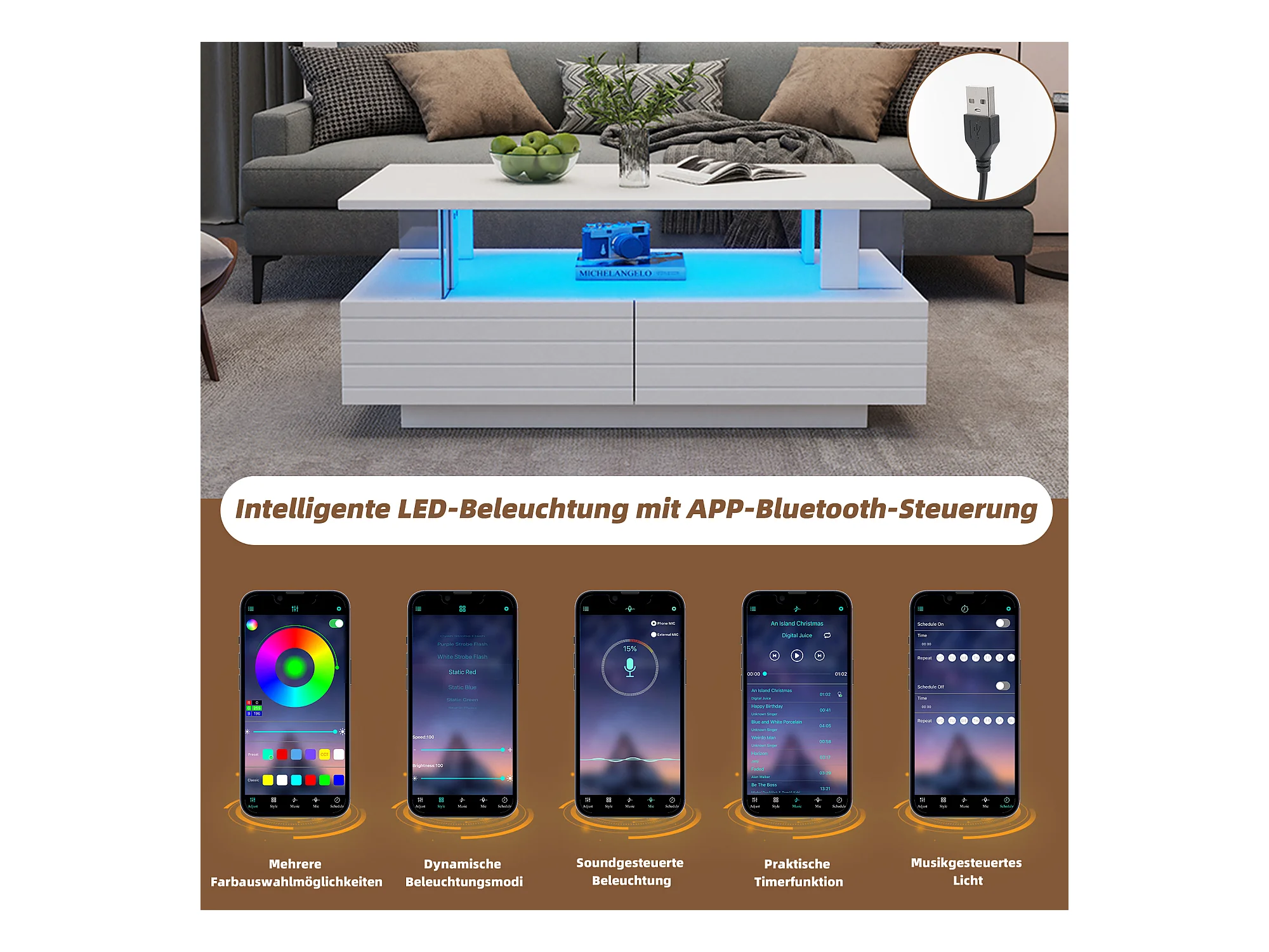Table basse LED blanche avec rangement, table basse acrylique, design moderne avec contrôle Bluetooth via application mobile, 100x50x42 cm