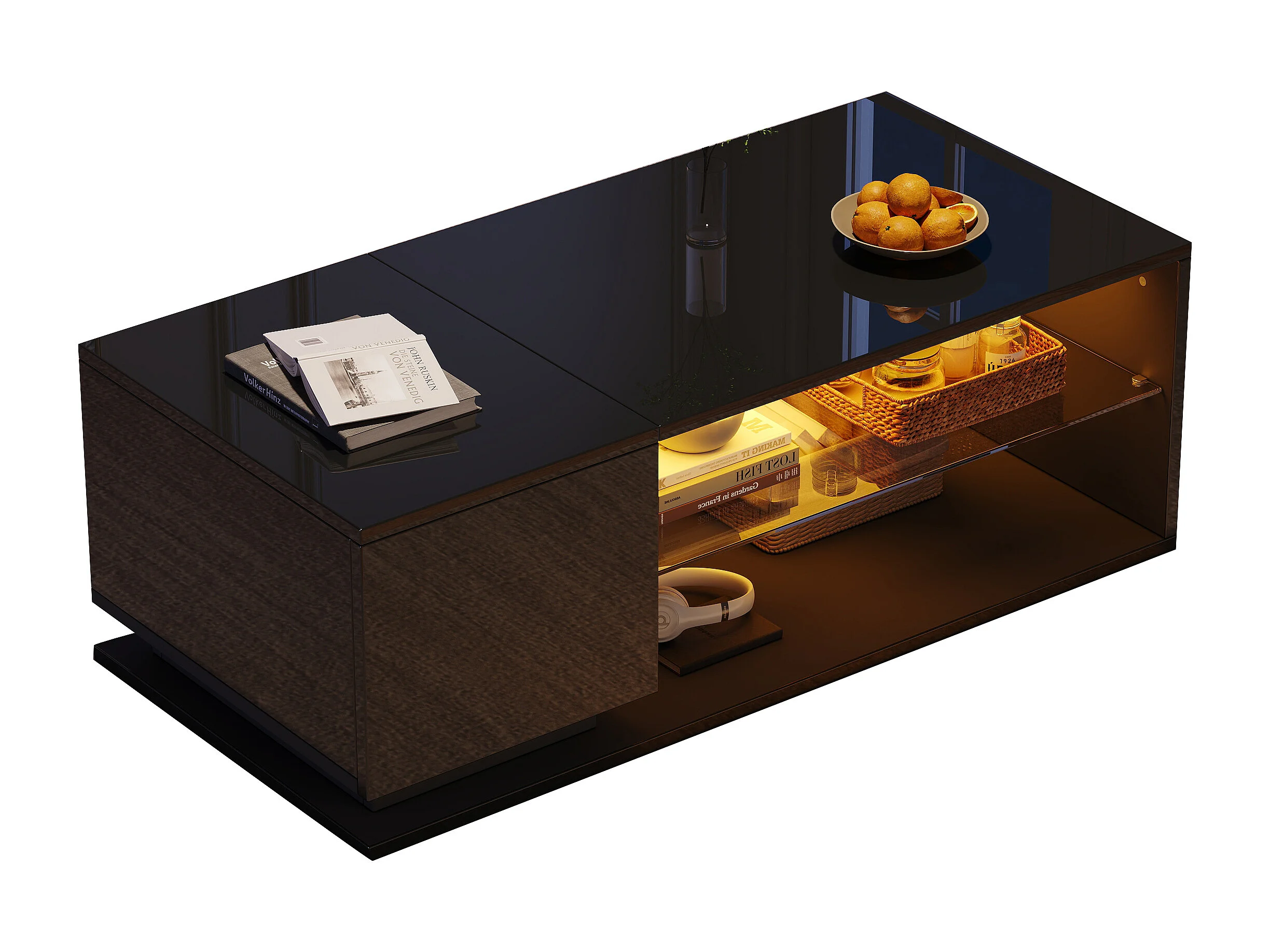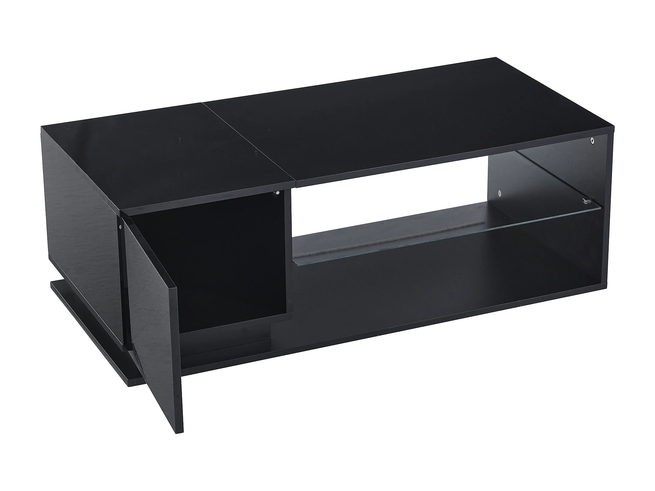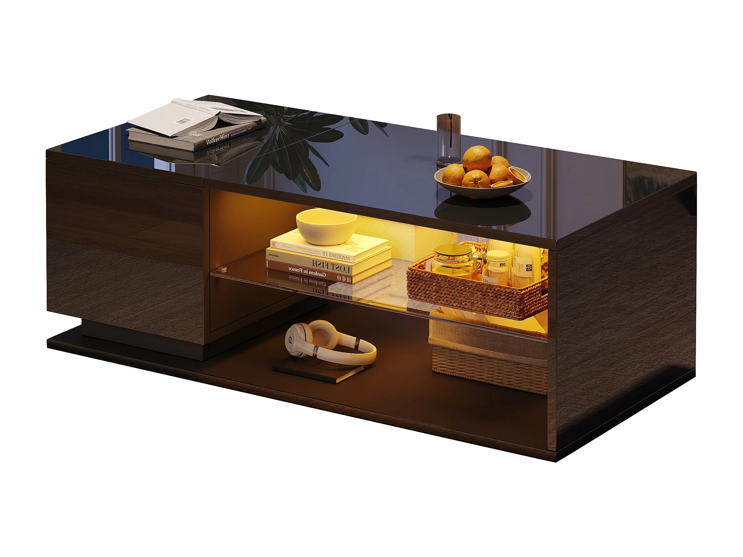 Table basse LED moderne avec rangement, panneau de particules et verre trempé, noir, luminosité réglable par application (105x50x36cm)
