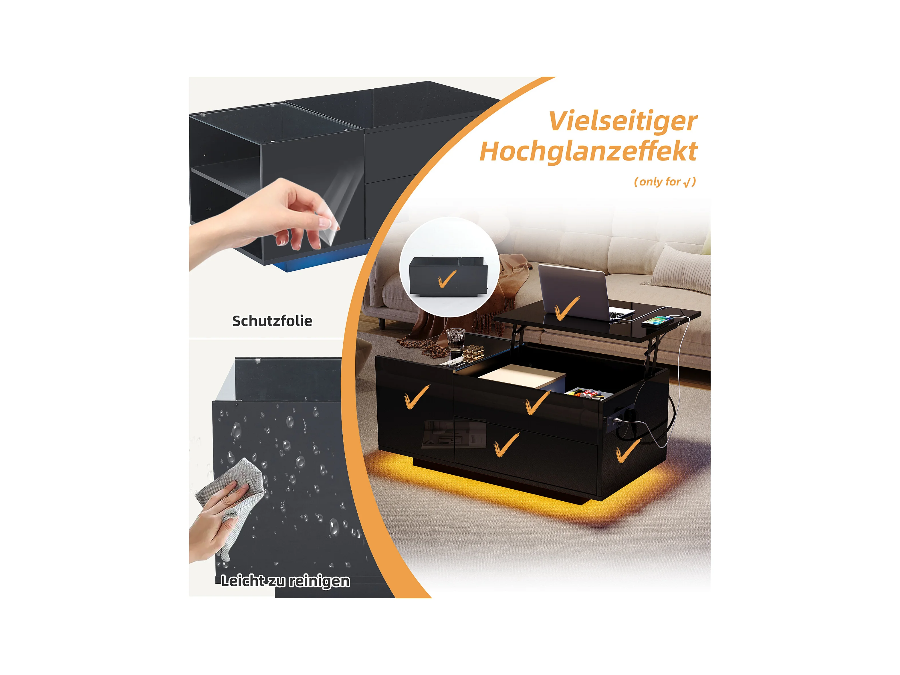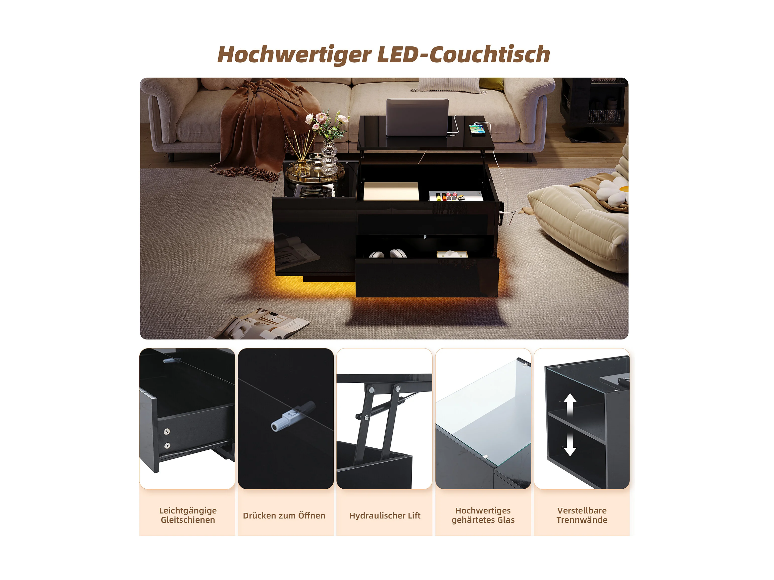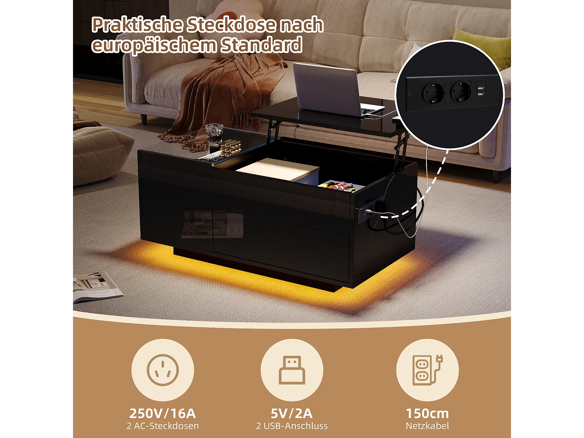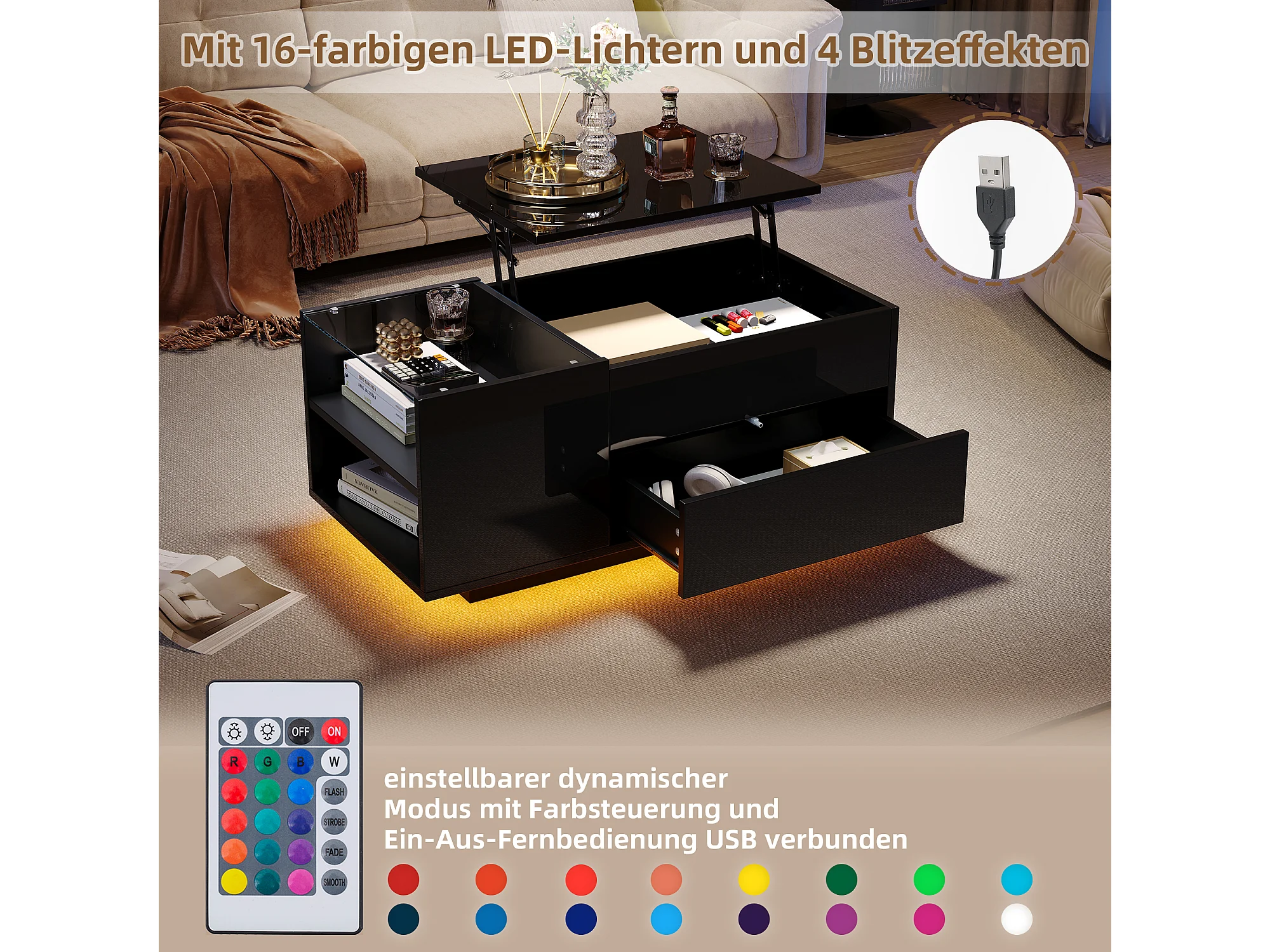 Table basse LED noire avec fonction de rangement, panneau de particules + verre trempé, contrôle via application mobile (95x48x42 cm)