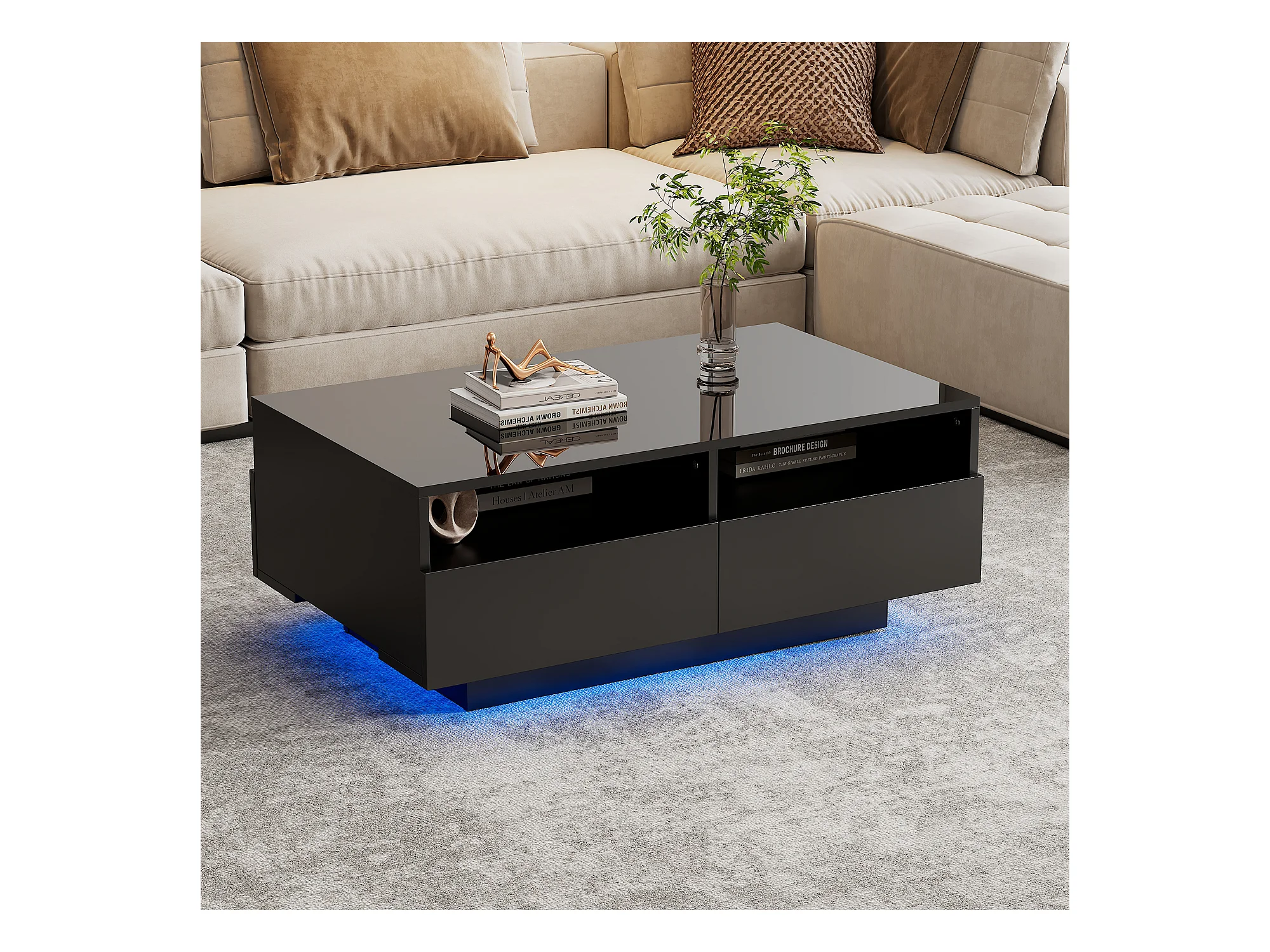 Table basse LED noire brillante avec 4 tiroirs, panneaux de particules et éclairage RGB (90x55x35cm)