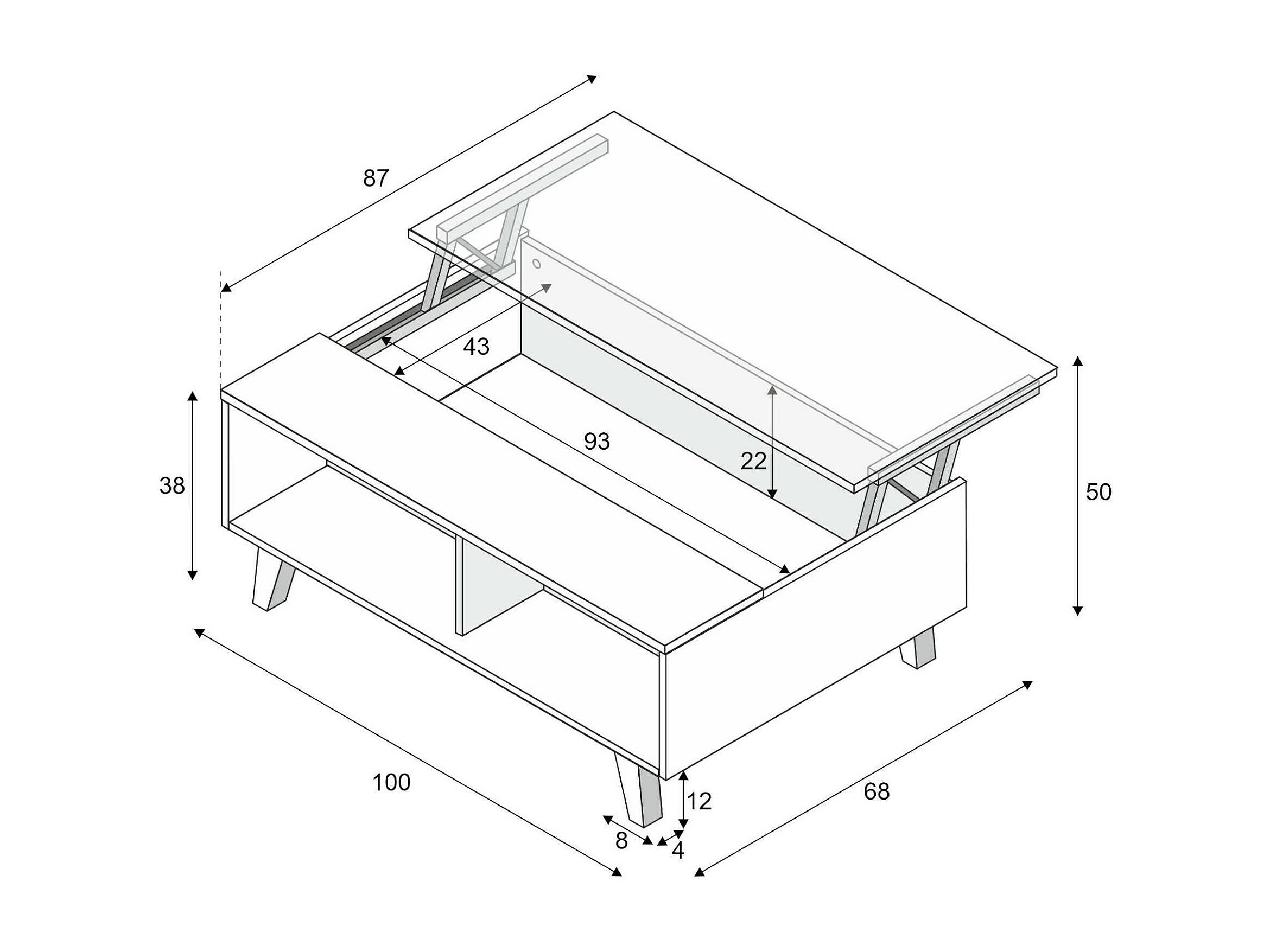 Table basse Dgattus, Table basse avec plateau élévateur, Table basse de salon, 100x68h38 cm, Blanc brillant et chêne