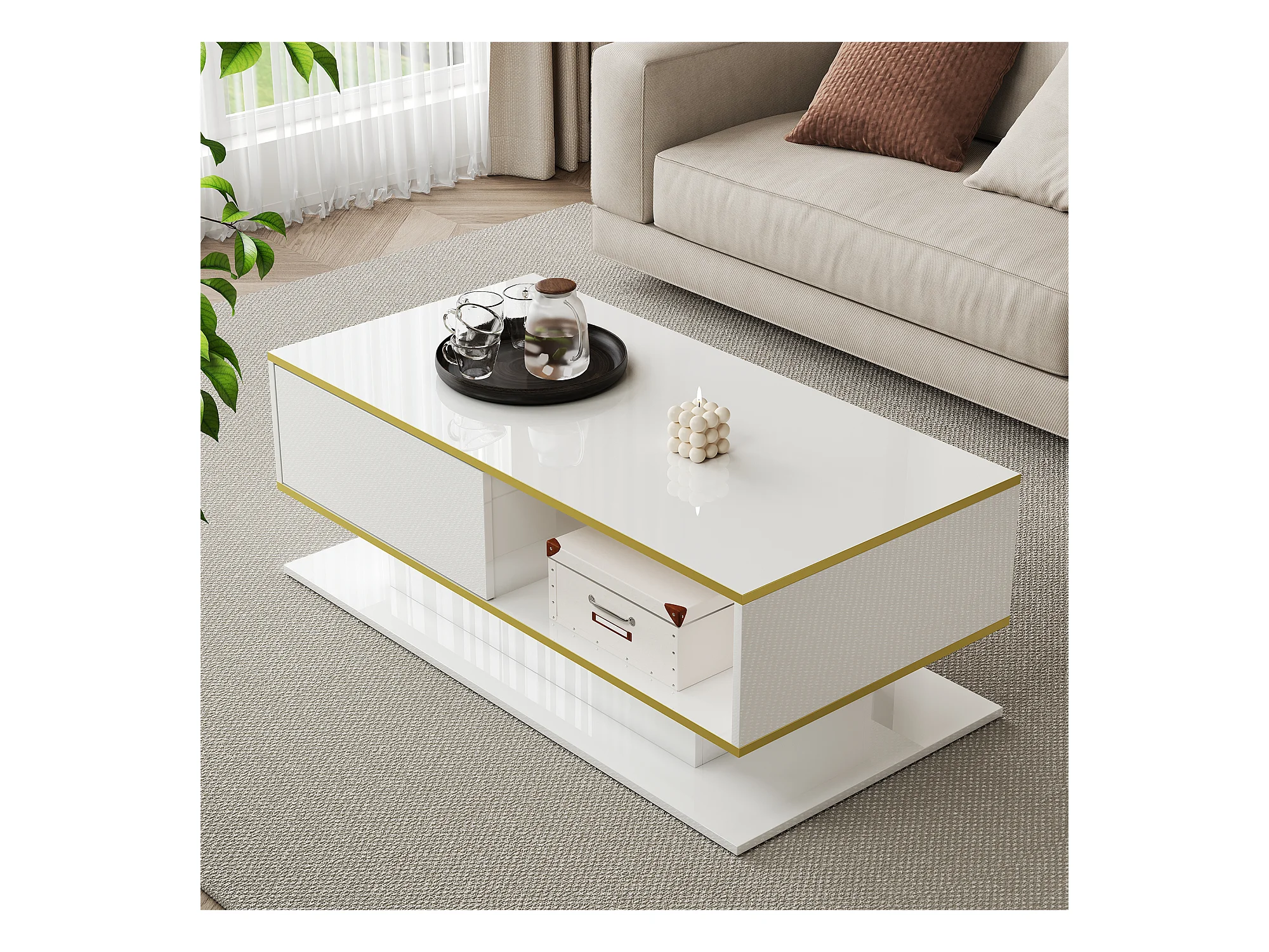 Table basse brillante - 100 x 50 x 40 cm - avec Leds + 2 portes + 1 tiroir - aggloméré - blanc