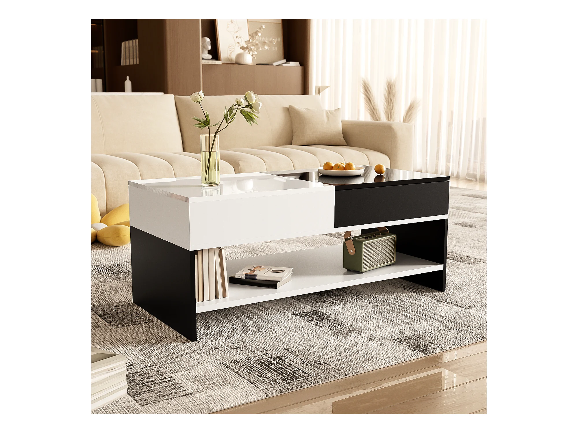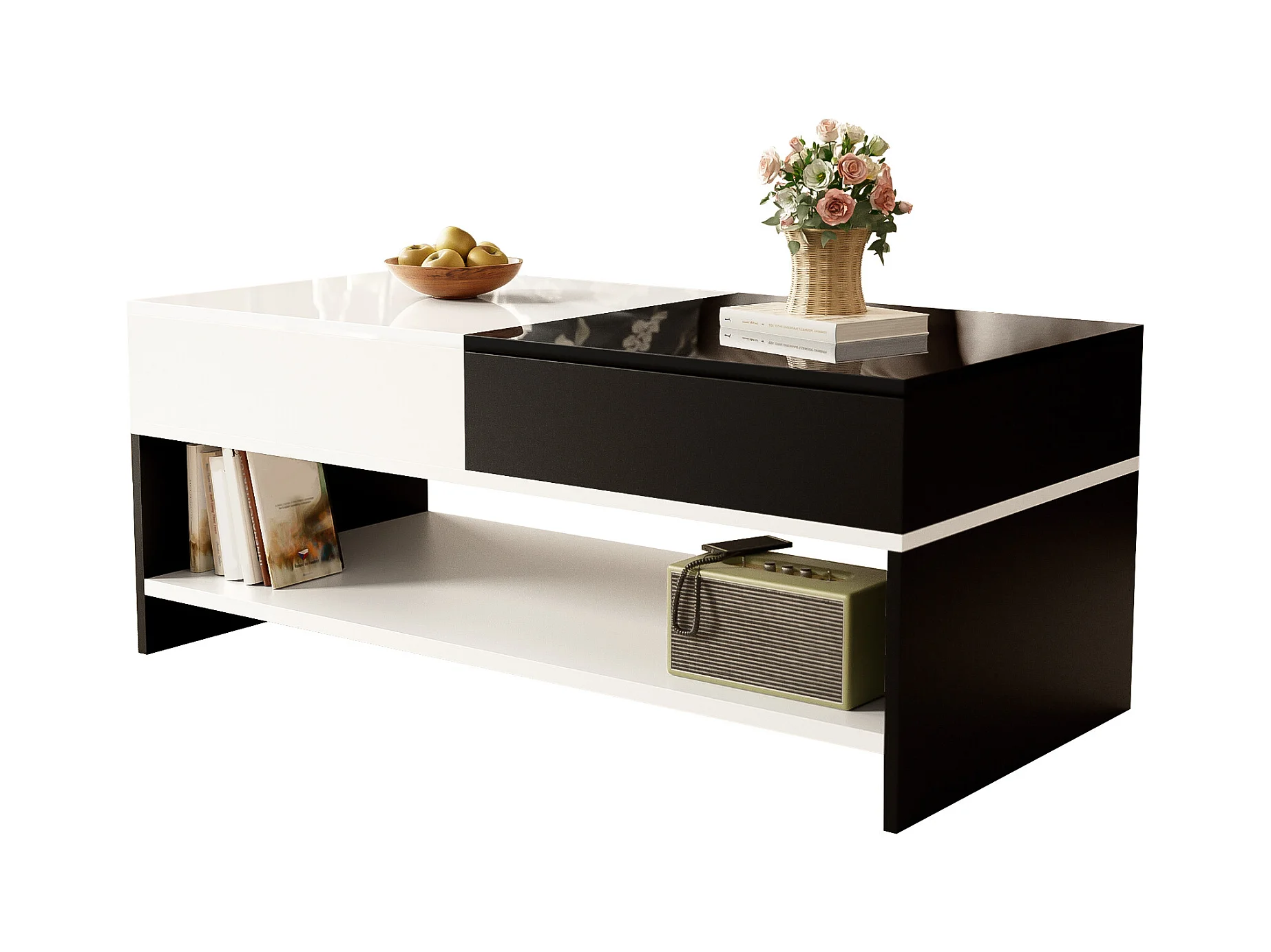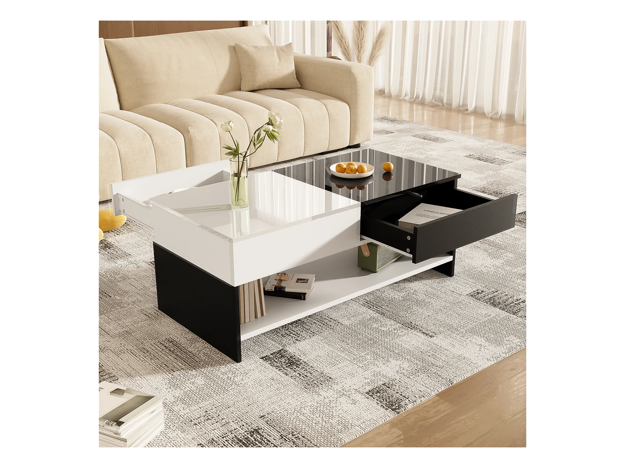 Table basse moderne avec 2 tiroirs, design noir et blanc, surface haute brillance, (100x48x40 cm)