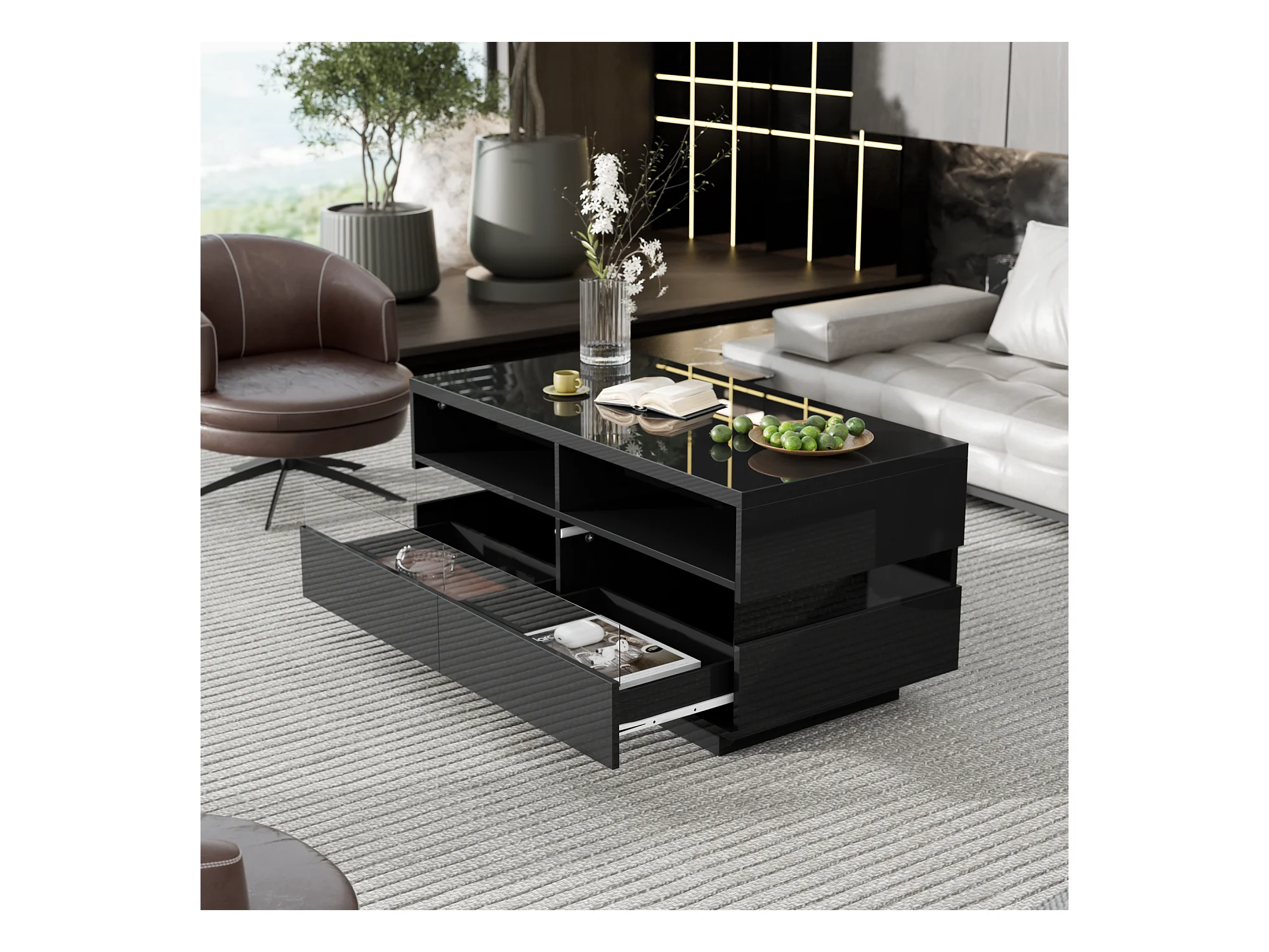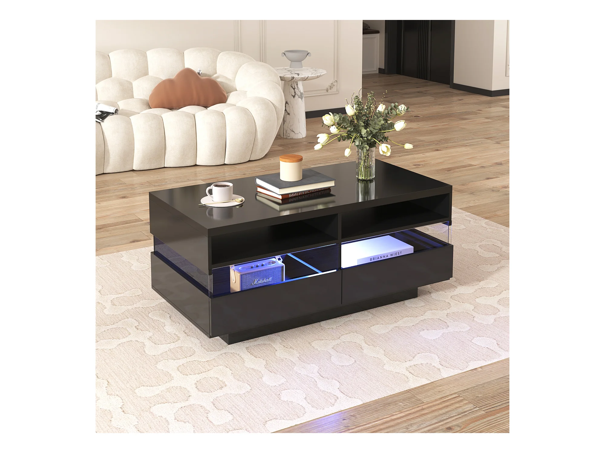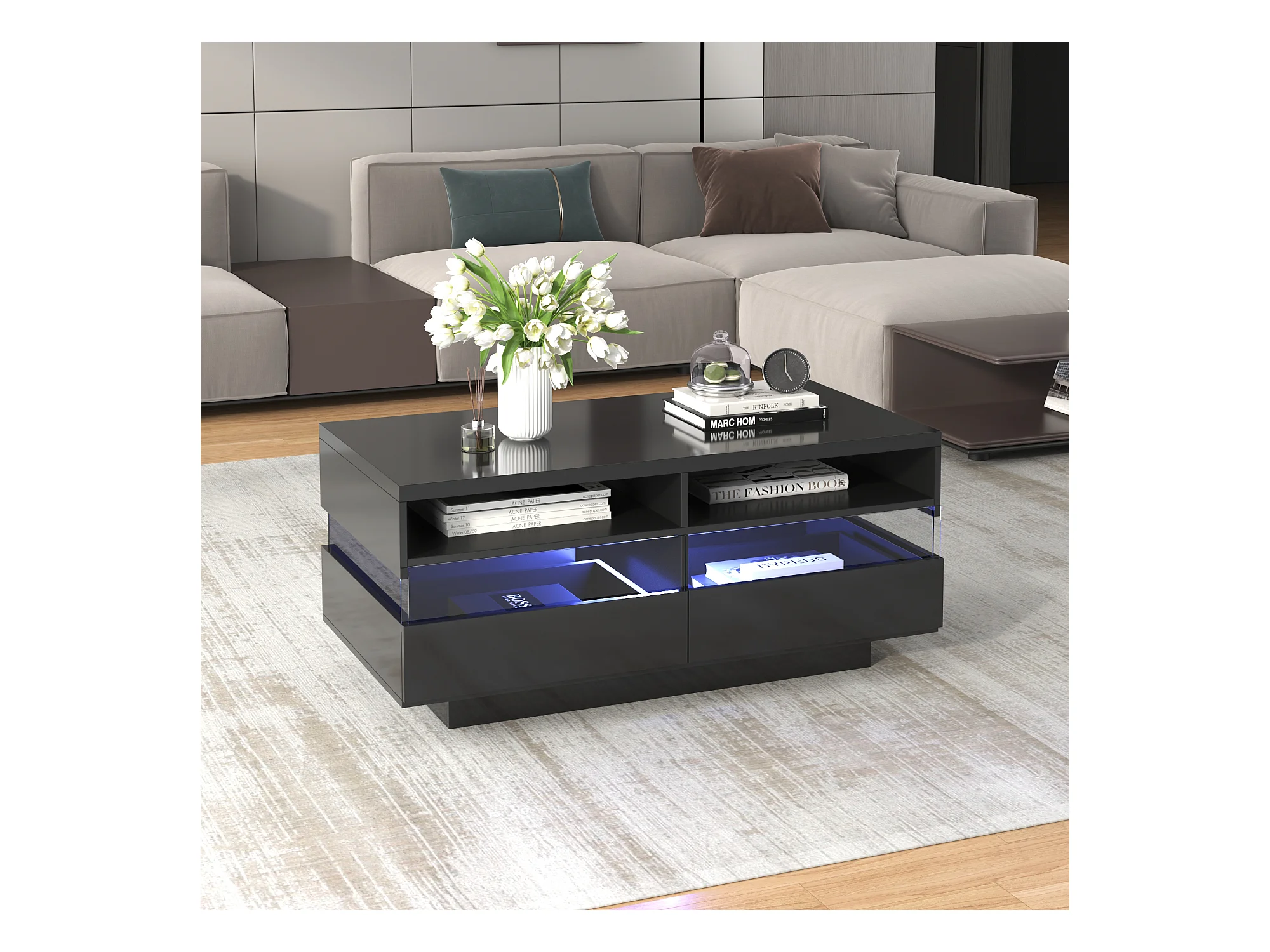 Table basse moderne avec 2 tiroirs et 2 compartiments, haute brillance, LEDs, bois panneaux de particules, noir