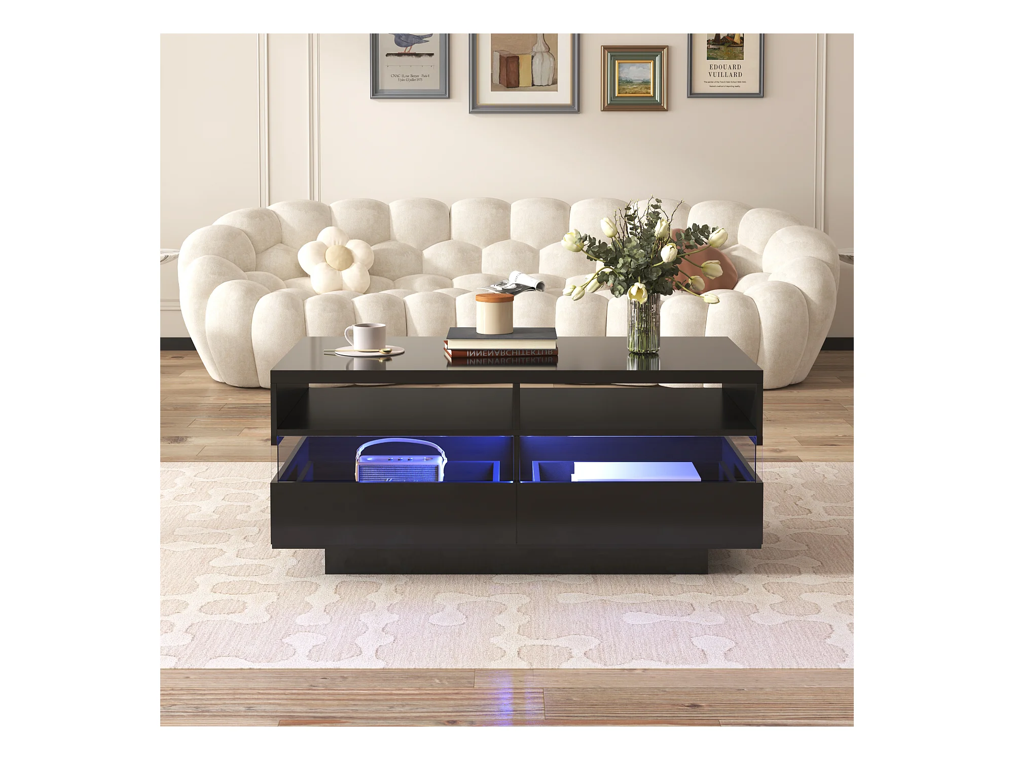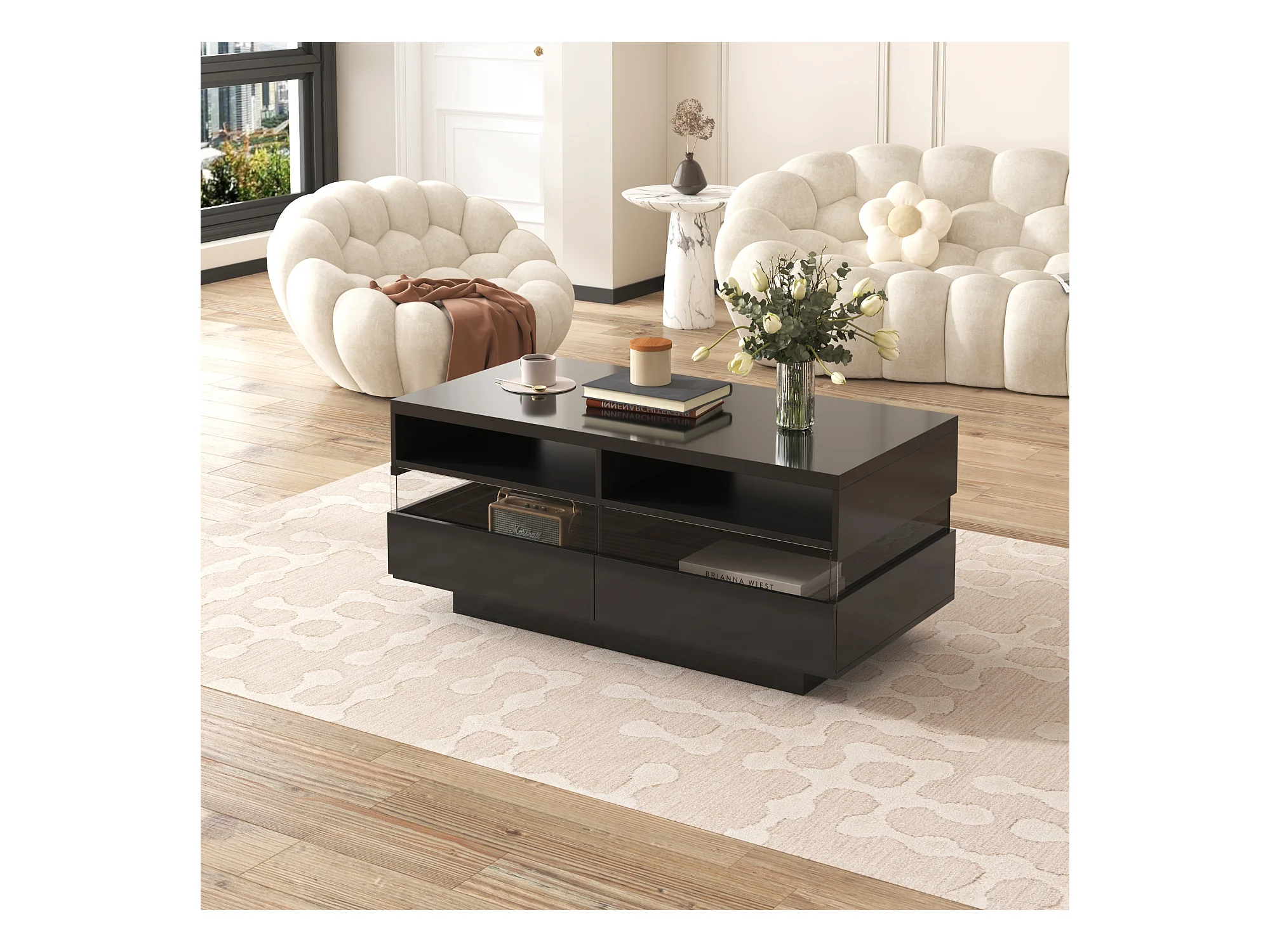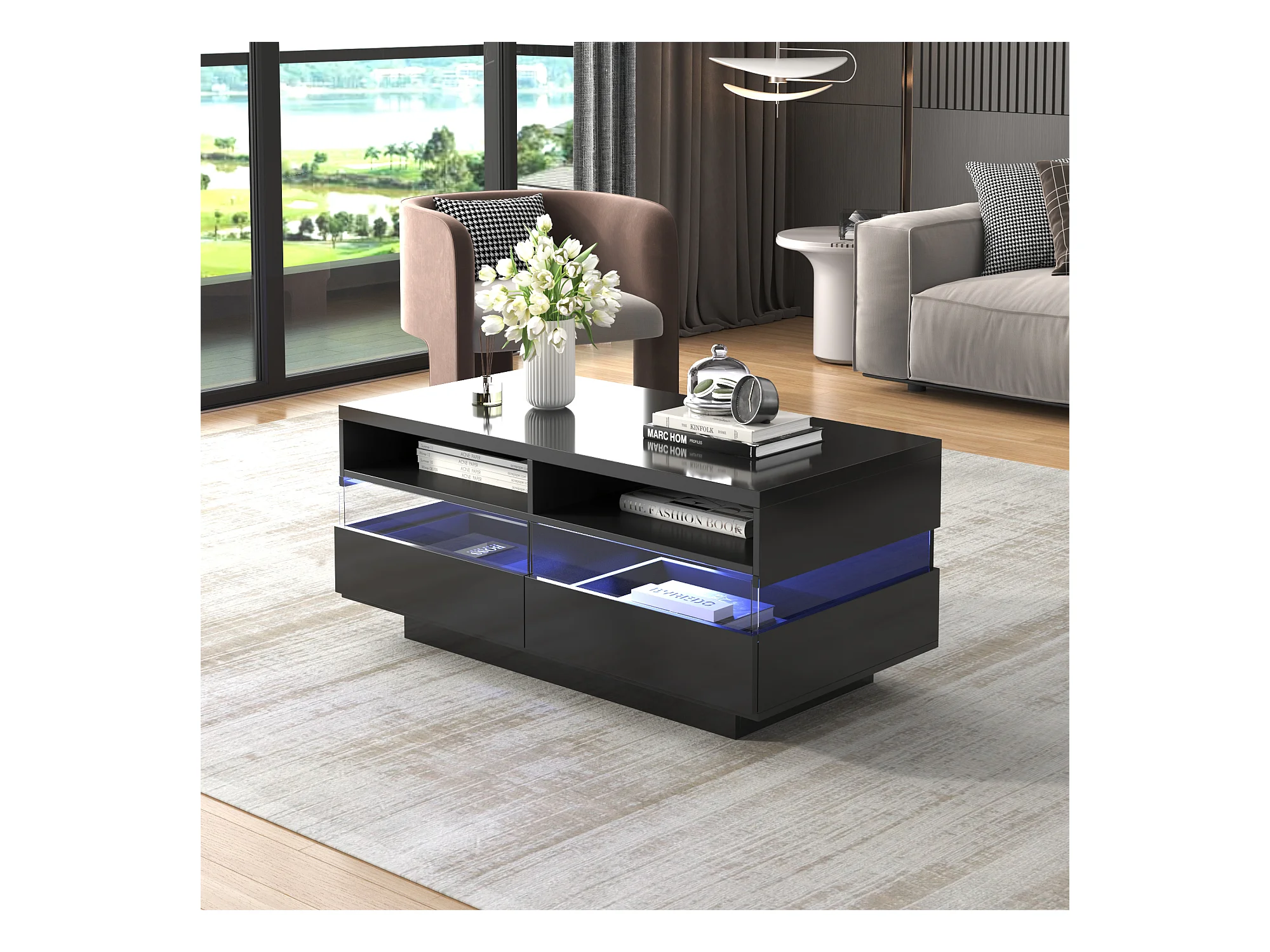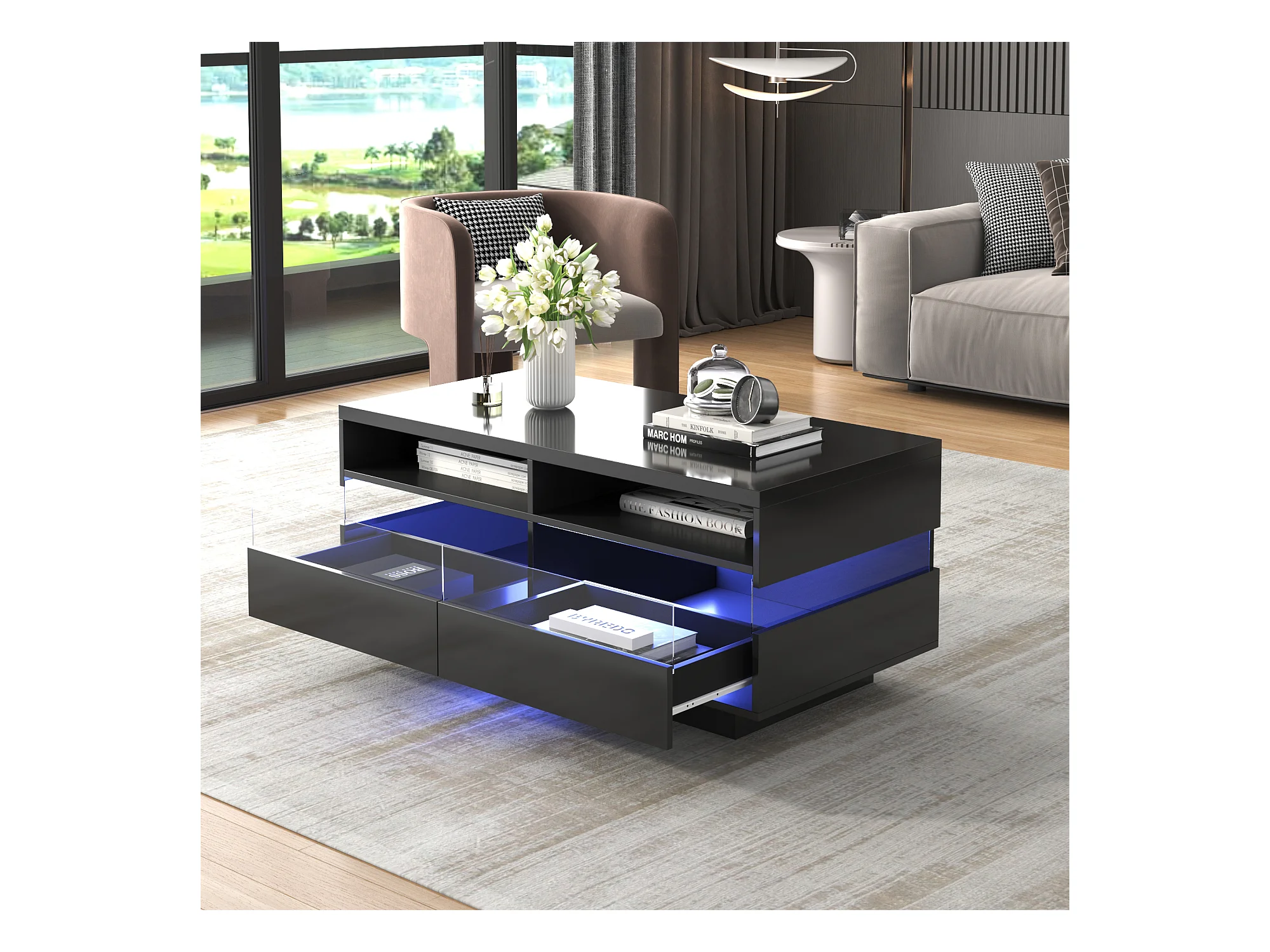 Table basse moderne avec 2 tiroirs et 2 compartiments, haute brillance, LEDs, bois panneaux de particules, noir