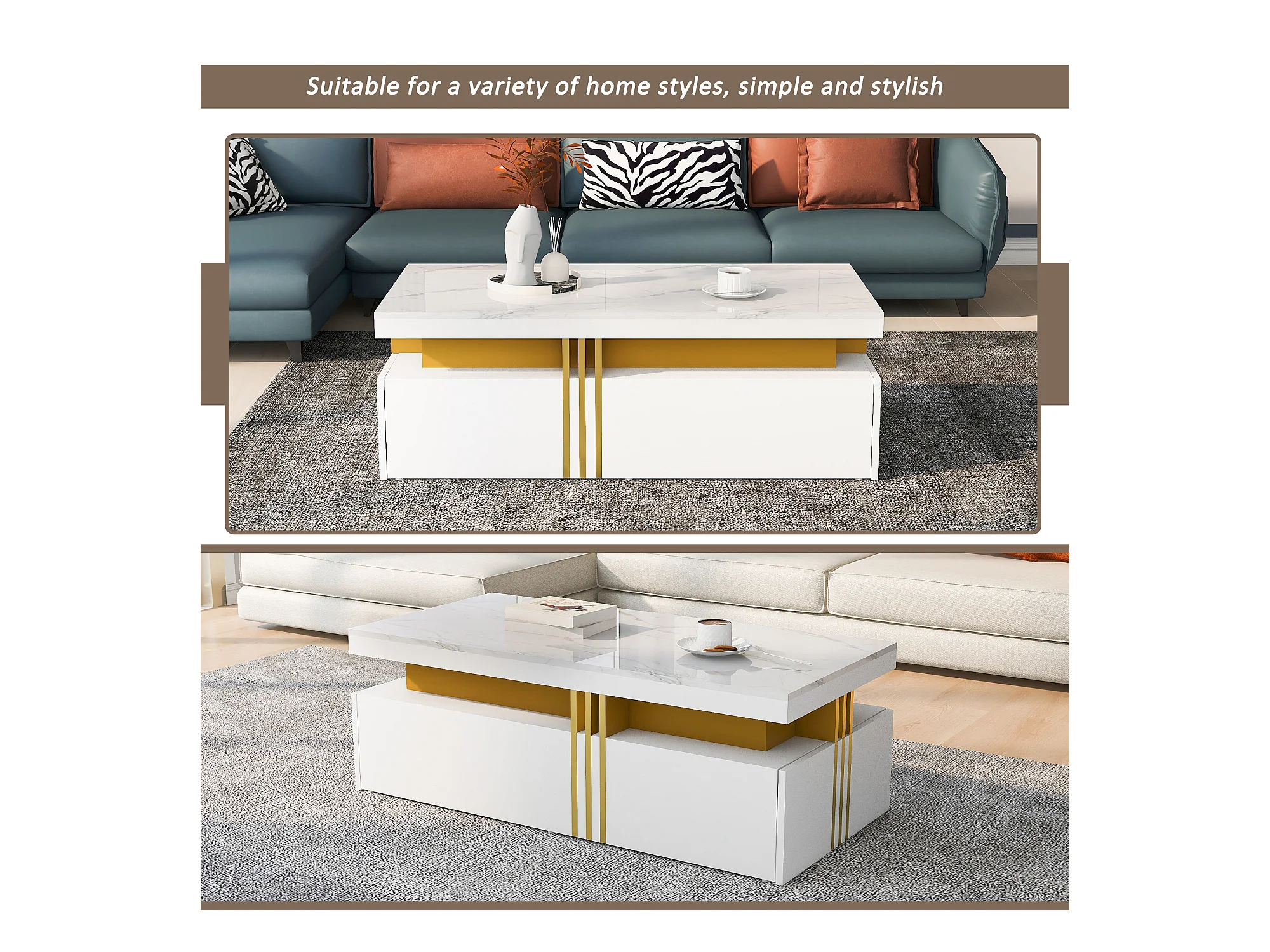 Table basse moderne avec 2 tiroirs, surface haute brillance, plateau marbré, MDF, blanc (100x50x40 cm)
