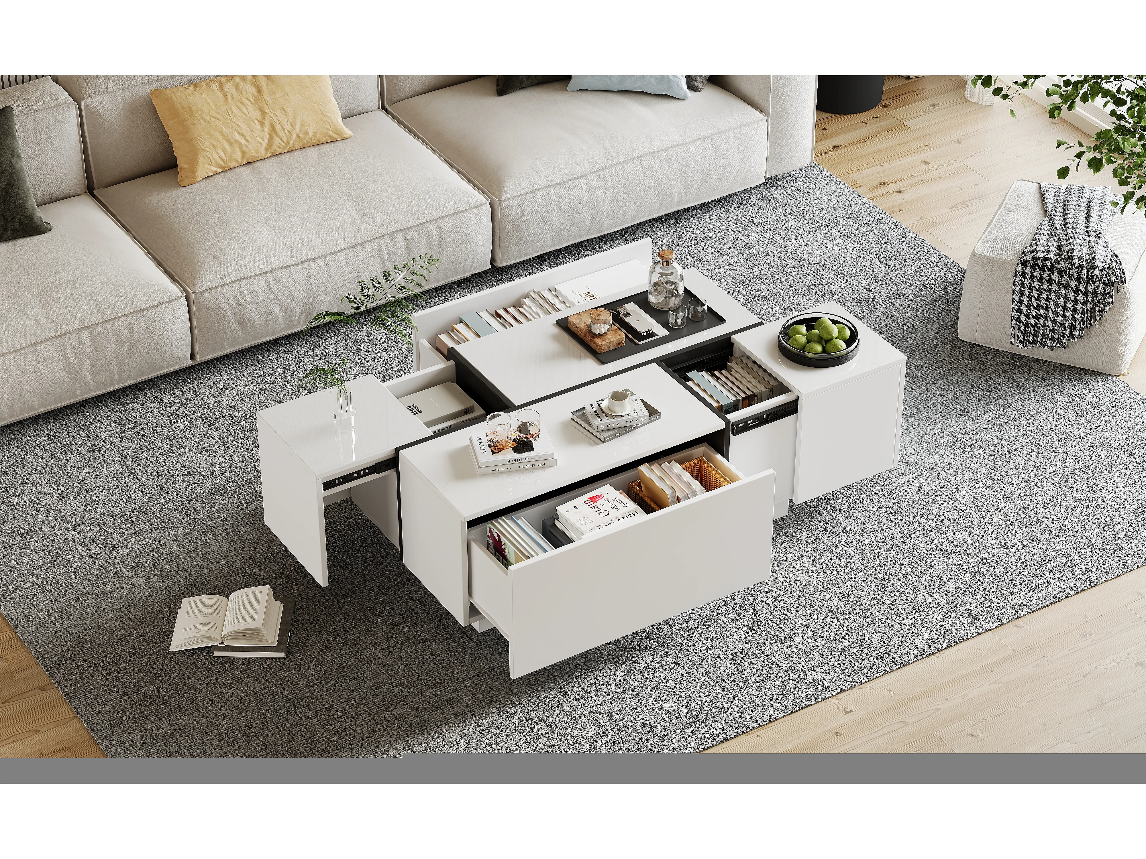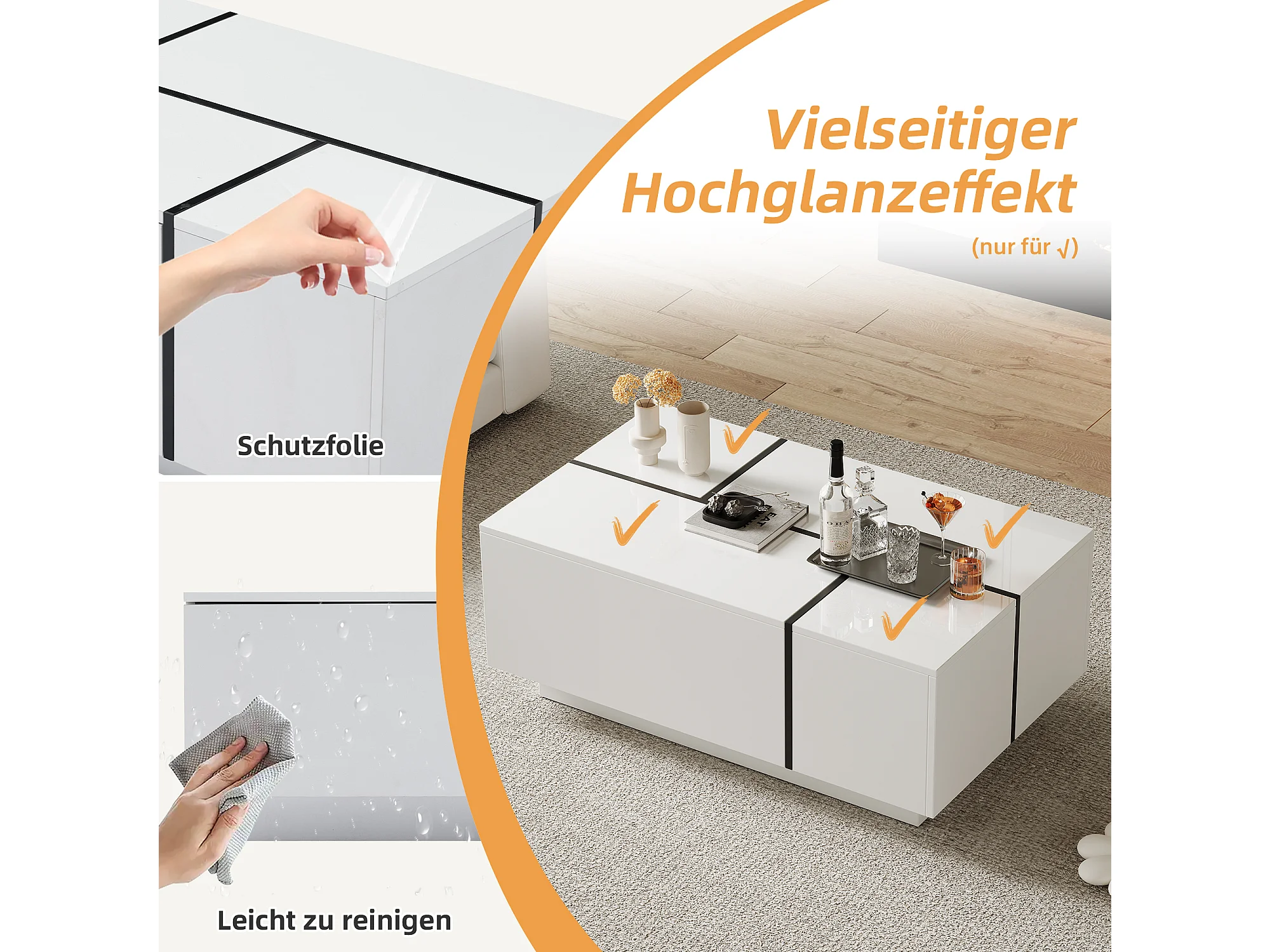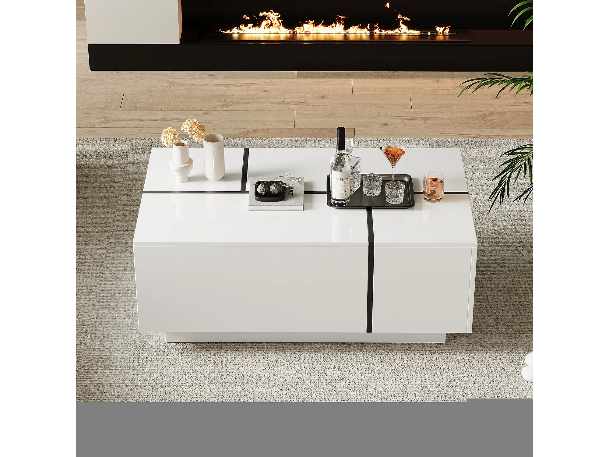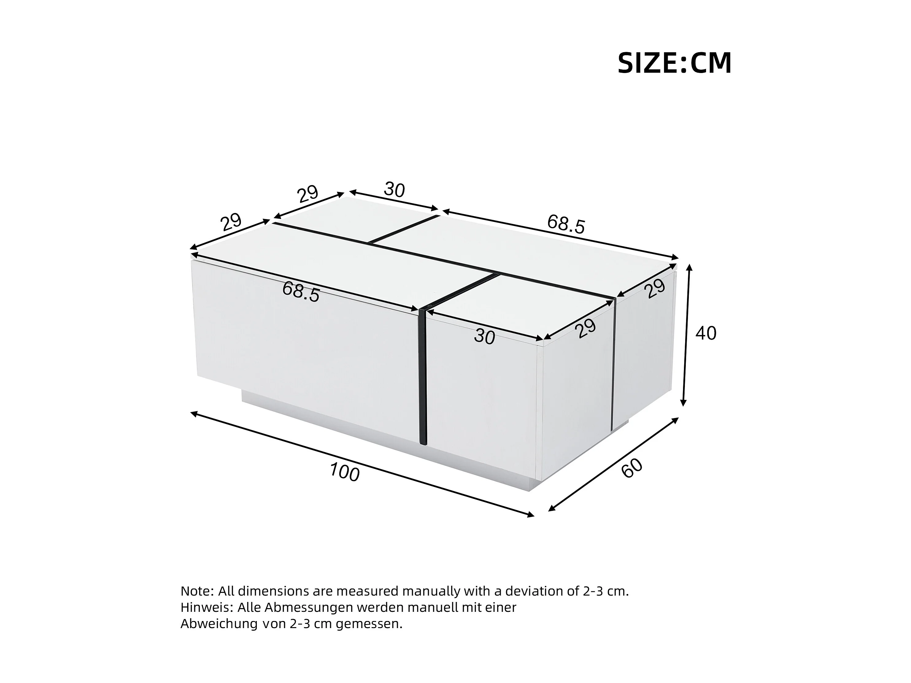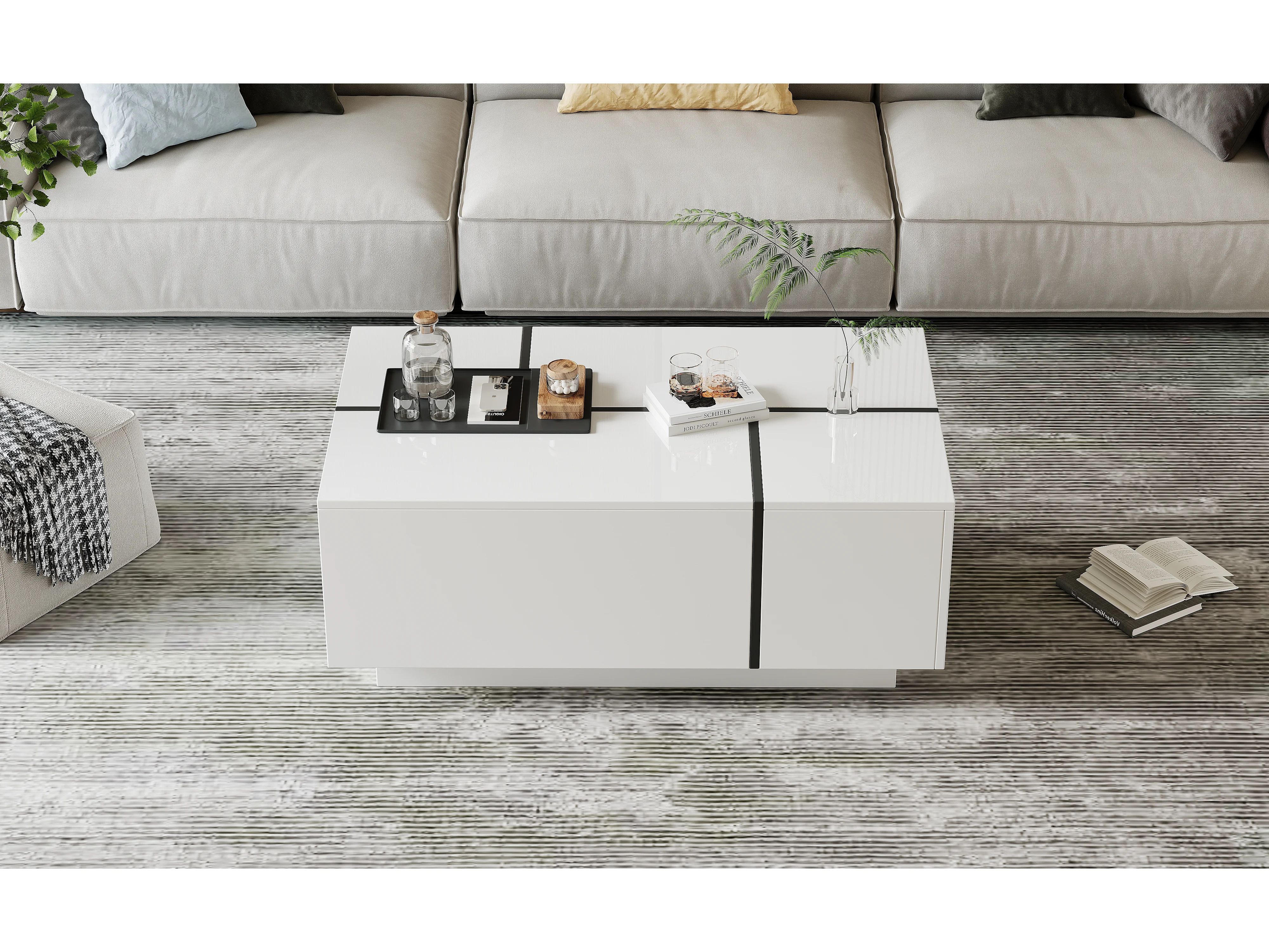 Table basse moderne avec 4 tiroirs, design patchwork hautement brillant, MDF, blanc et noir, (100x60x40 cm)