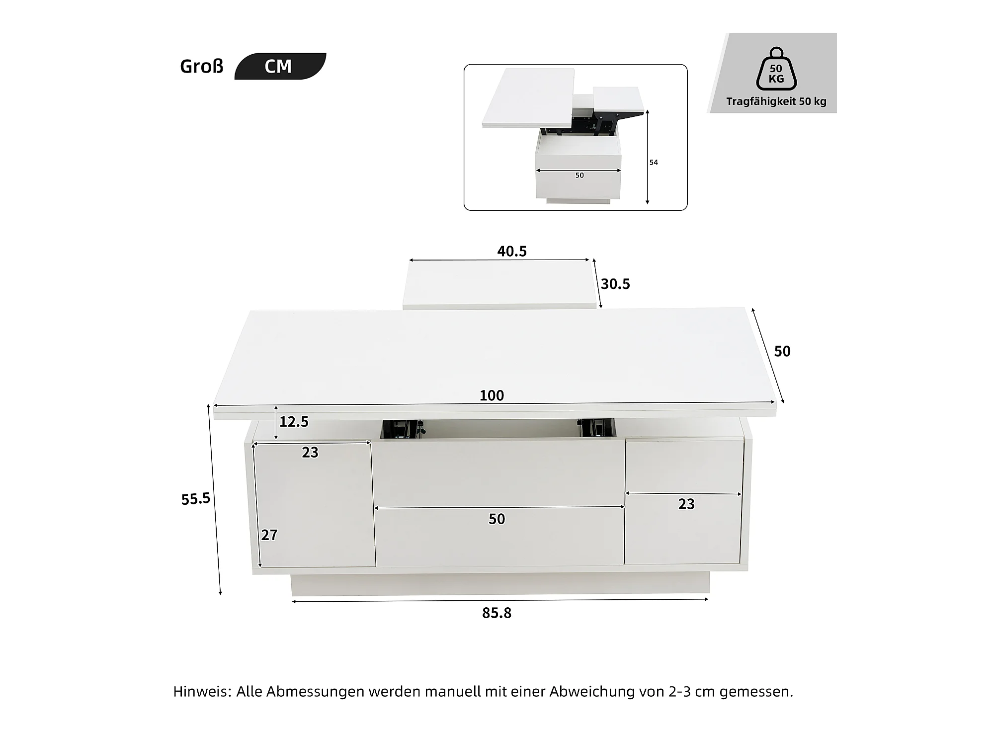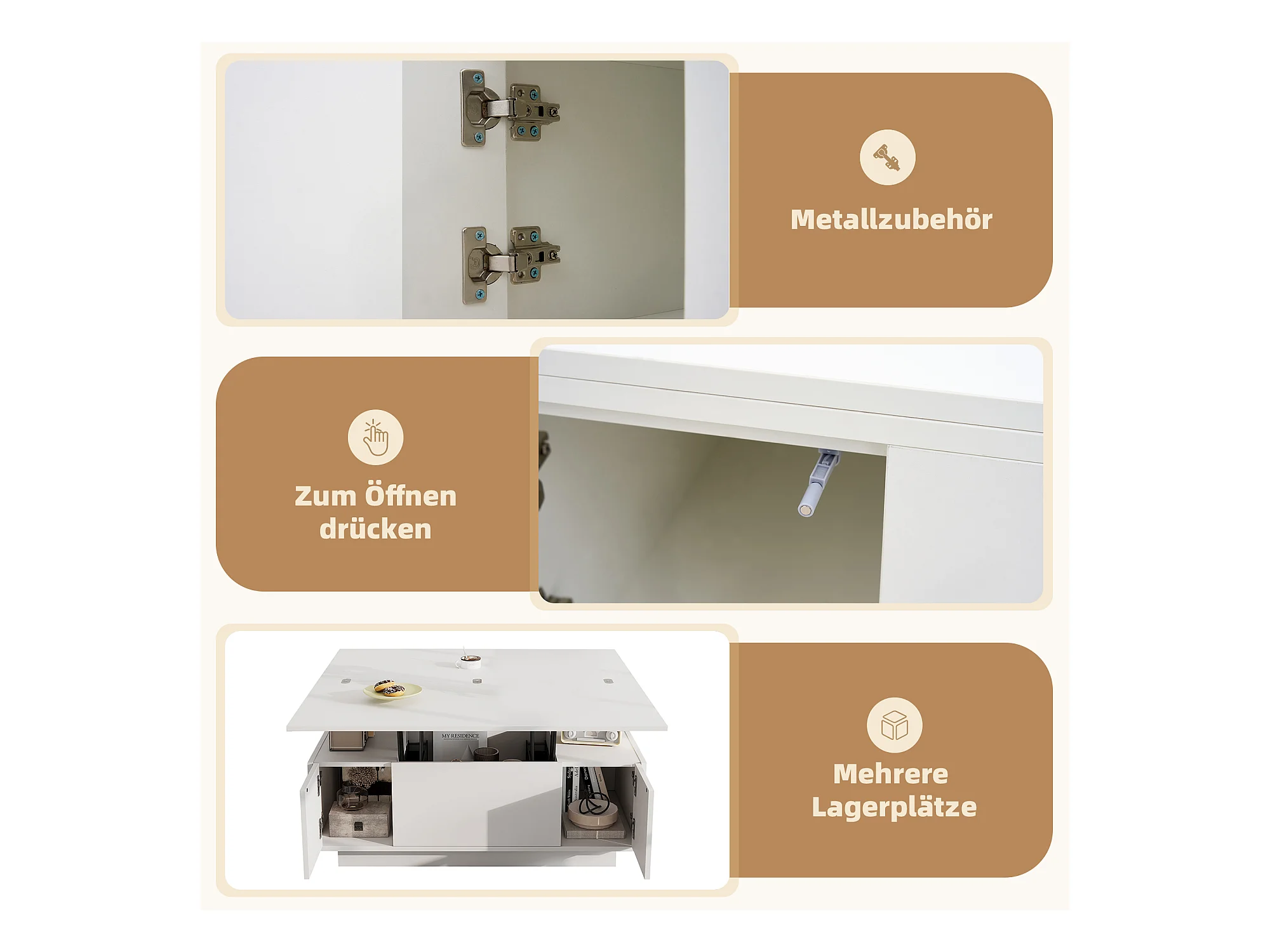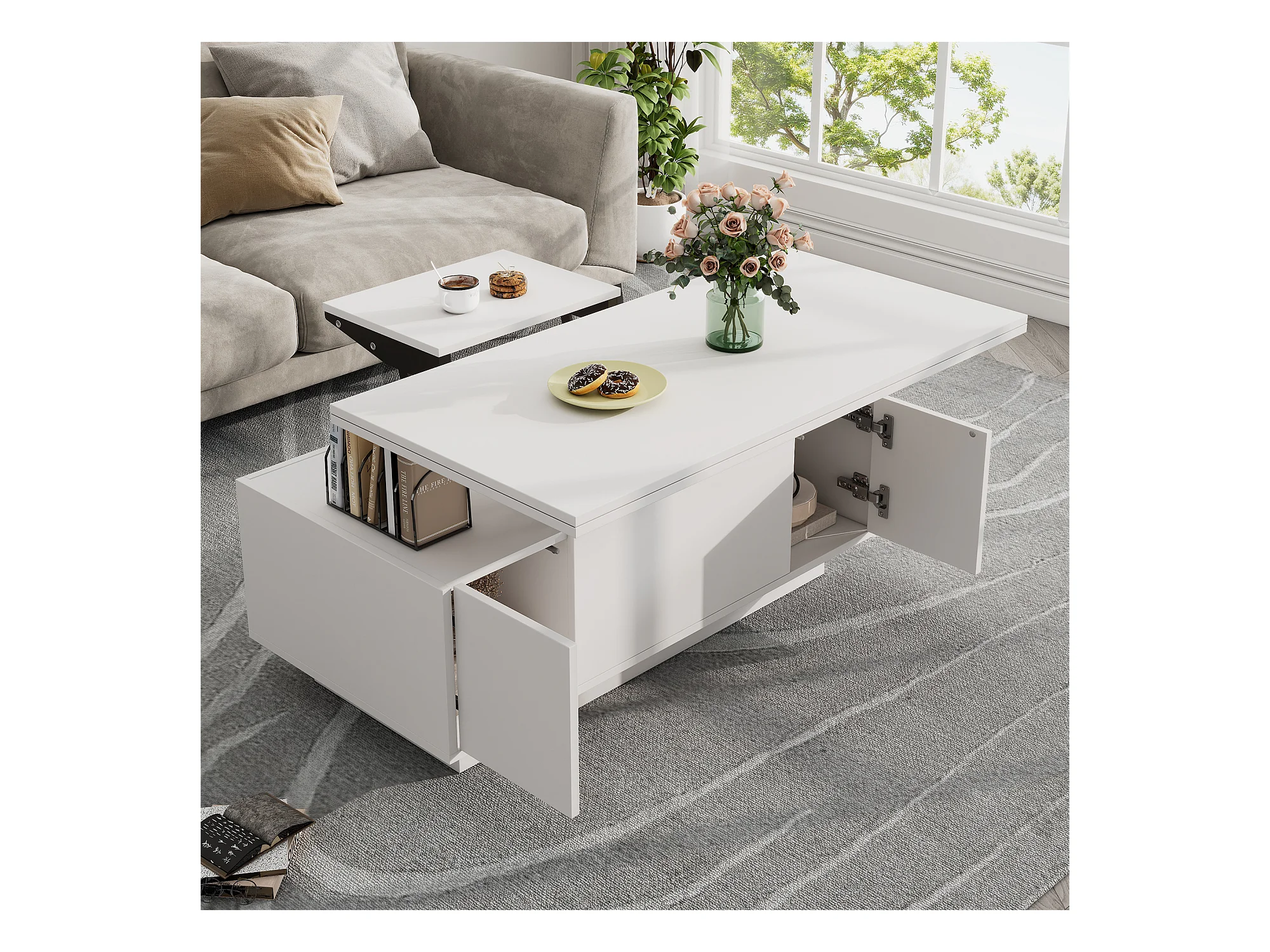Table basse moderne avec double mécanisme de levage, rangement caché, bois aggloméré, blanc (100x50x43 cm)