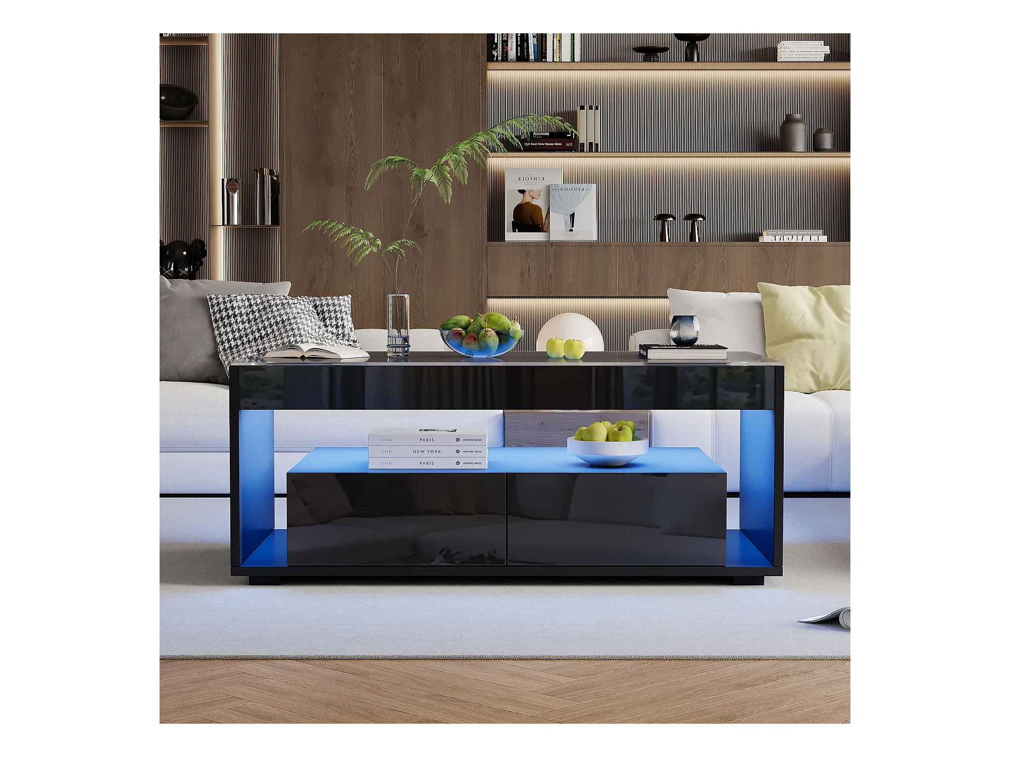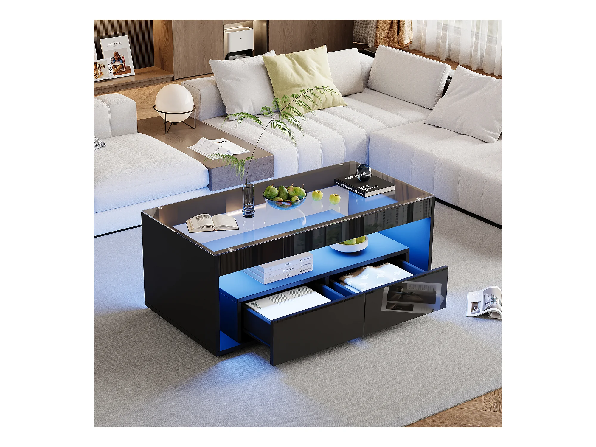Table basse moderne avec éclairage LED 16 couleurs, 2 tiroirs spacieux, verre trempé et panneau de particules, noir (110x50x40cm)
