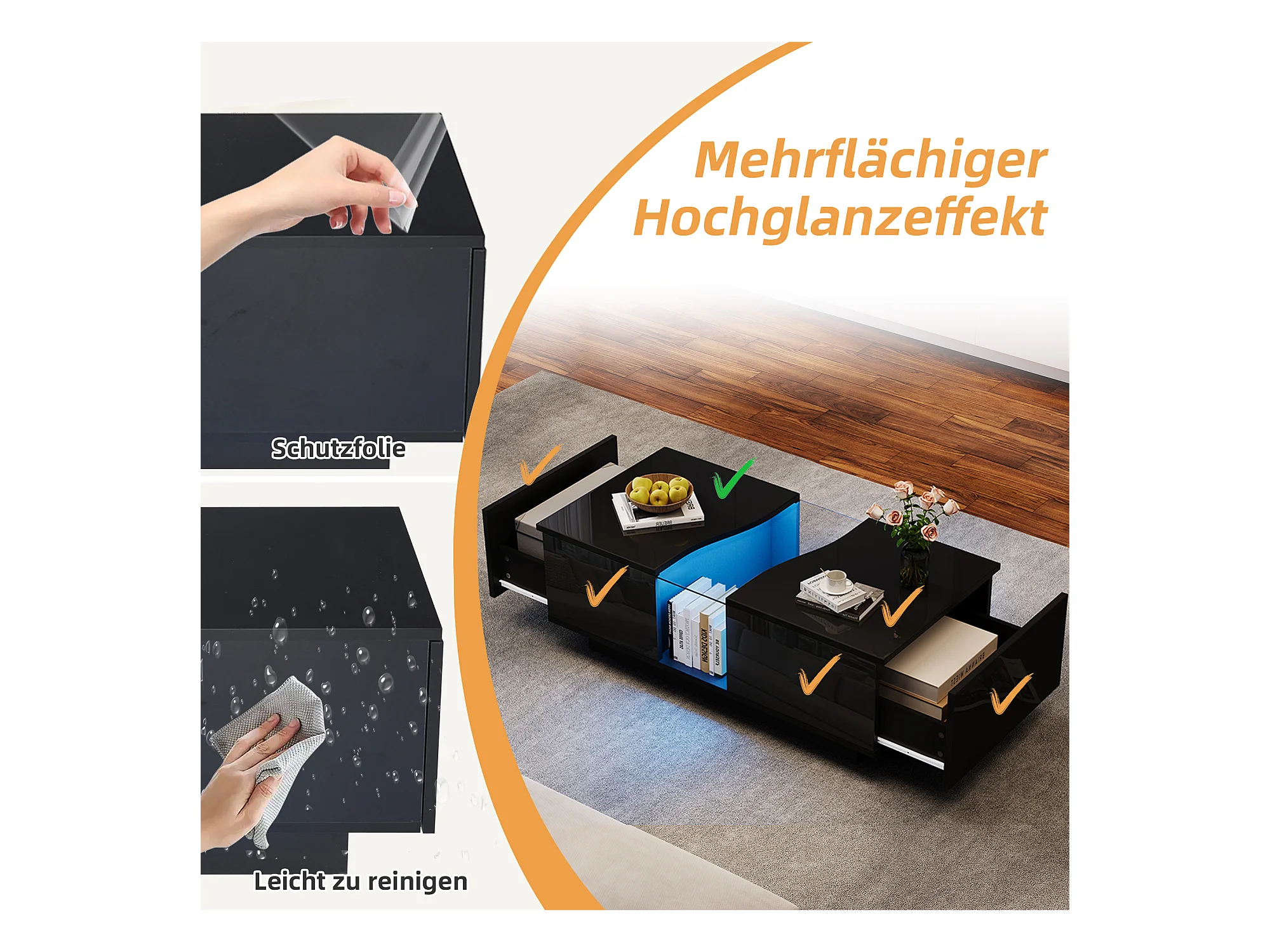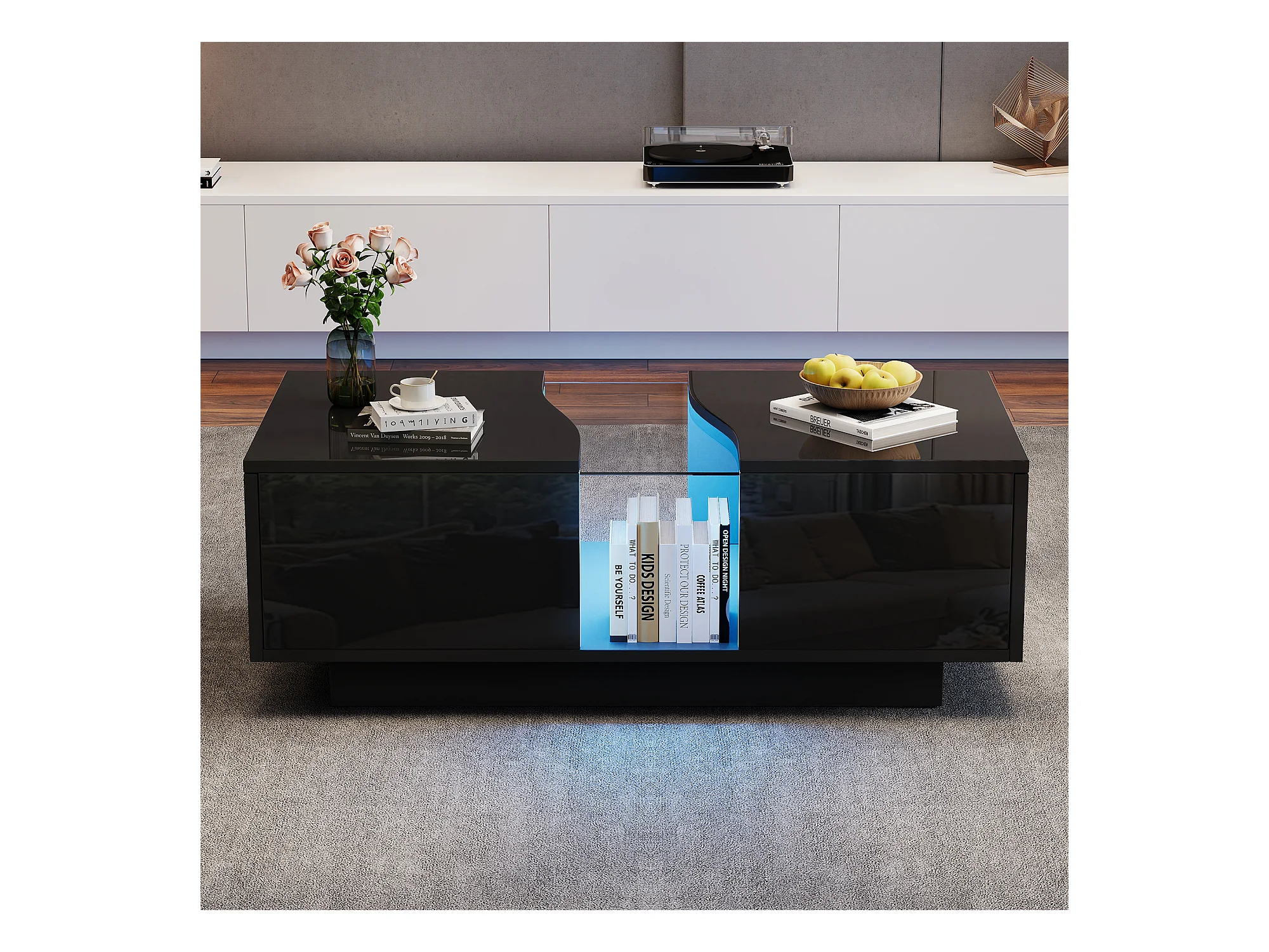 Table basse moderne avec éclairage LED, 2 tiroirs et plateau acrylique, MDF noir brillant (100x50x35cm)