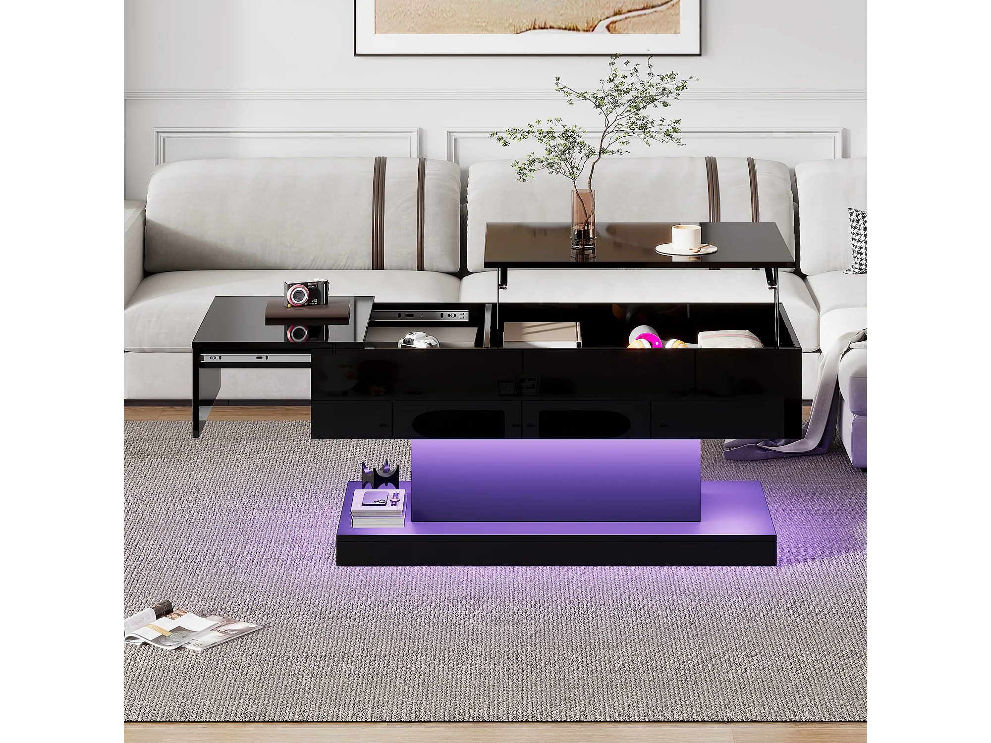 Table basse moderne avec LED, plateau hautement brillant, avec 2 tiroirs et design hydraulique (100x50x45 cm)