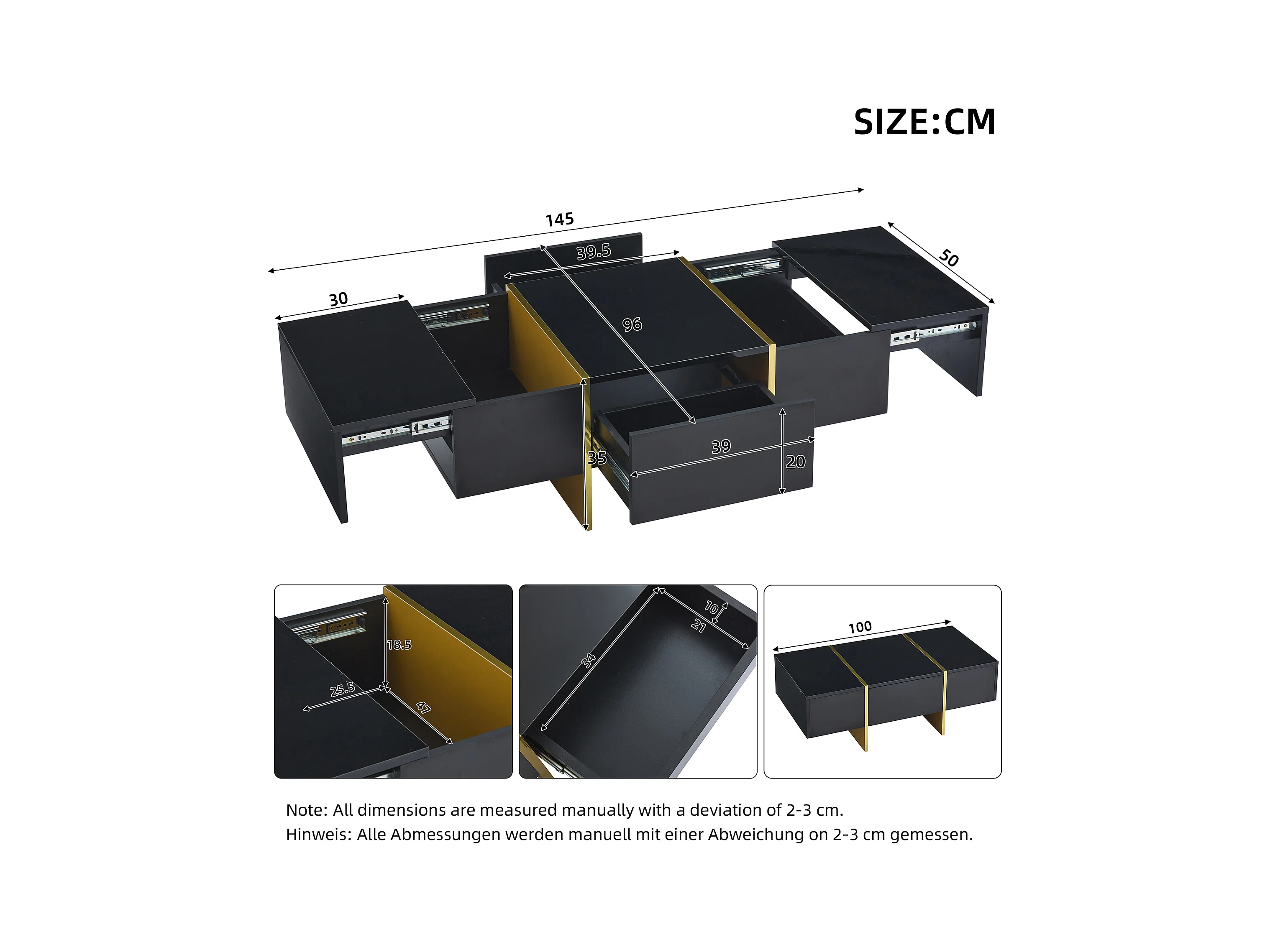 Table basse noire laquée avec éclairage LED et rangement caché, panneau de particules, (100x50x35 cm)