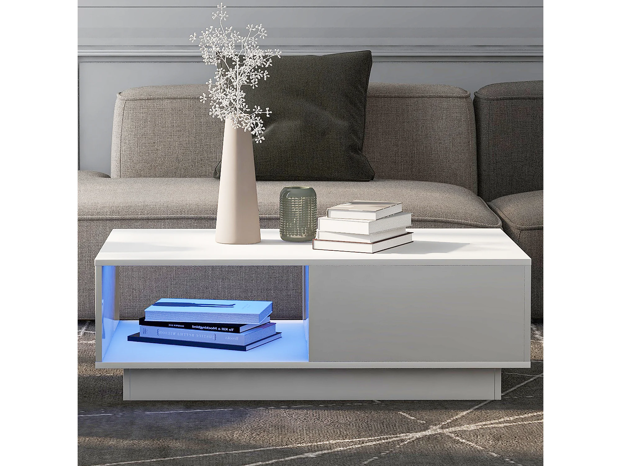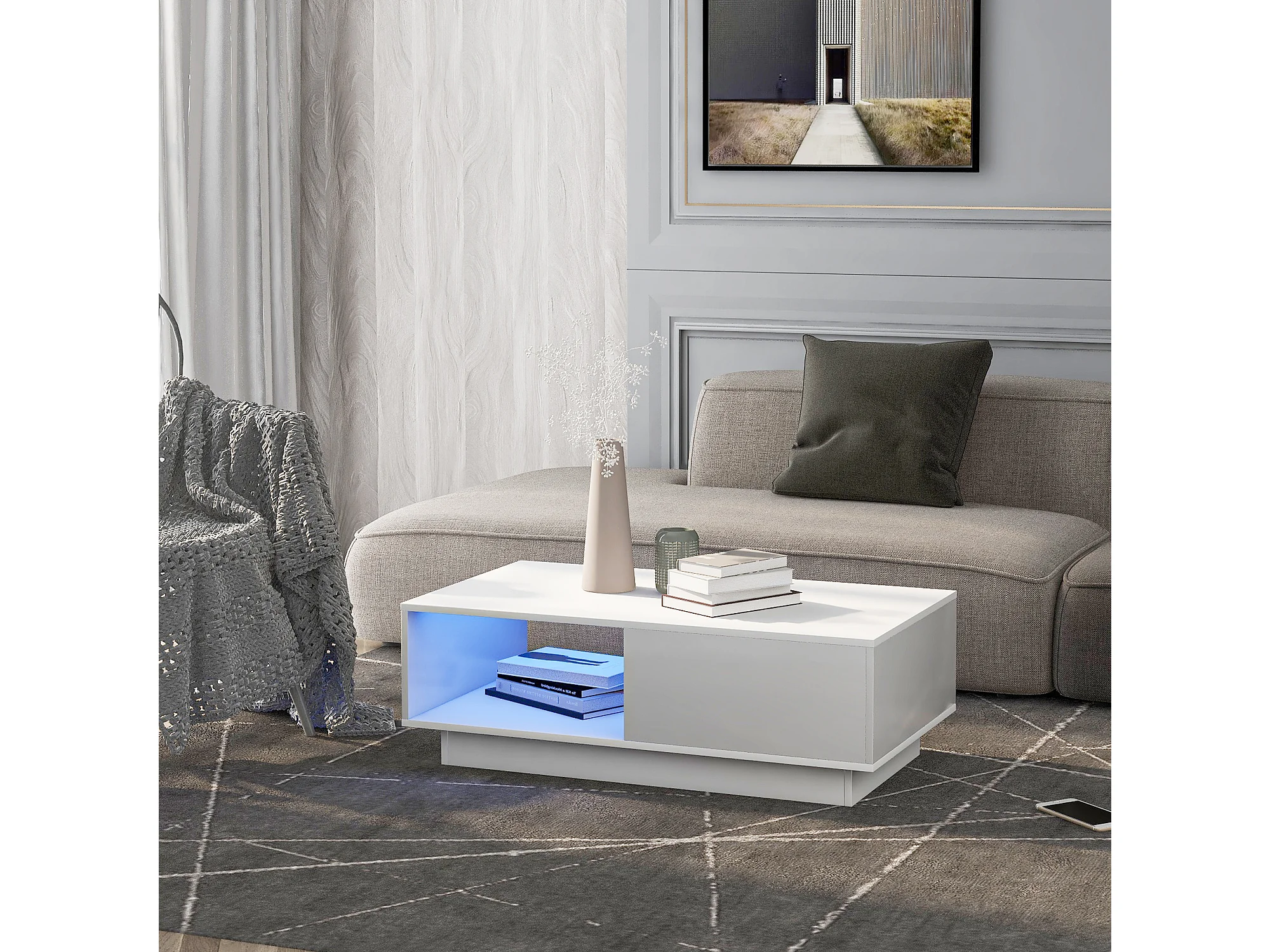 Table basse moderne, table de salon avec 1 tiroir et 1 compartiment, haute brillance, LEDs, bois MDF, blanc