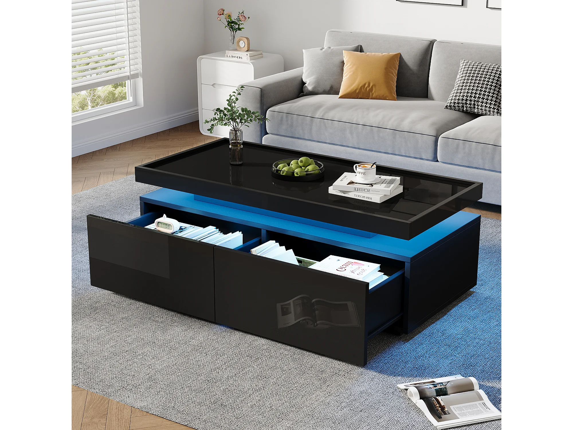 Table basse brillante noire avec 2 tiroirs de rangement et éclairage LED – pour salon