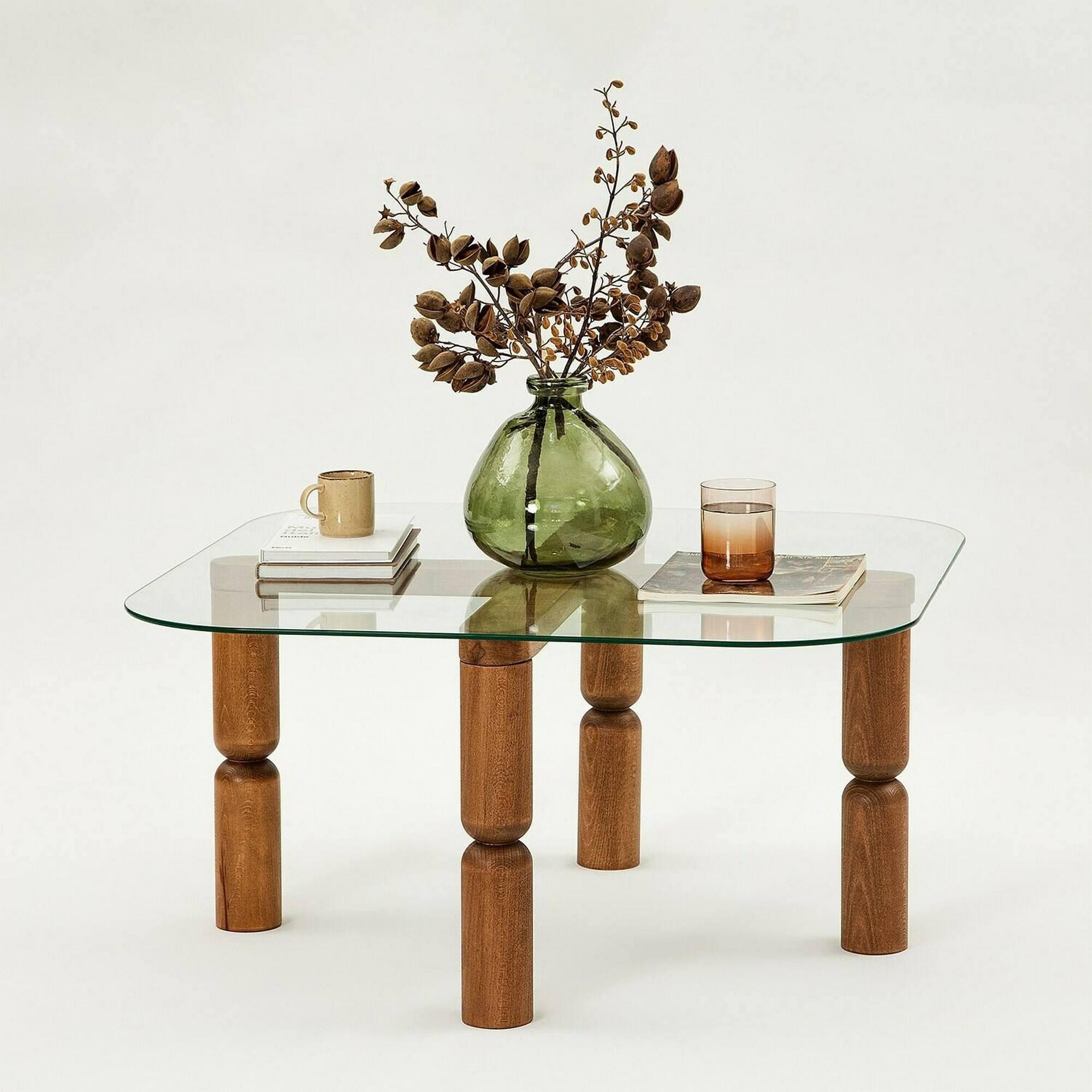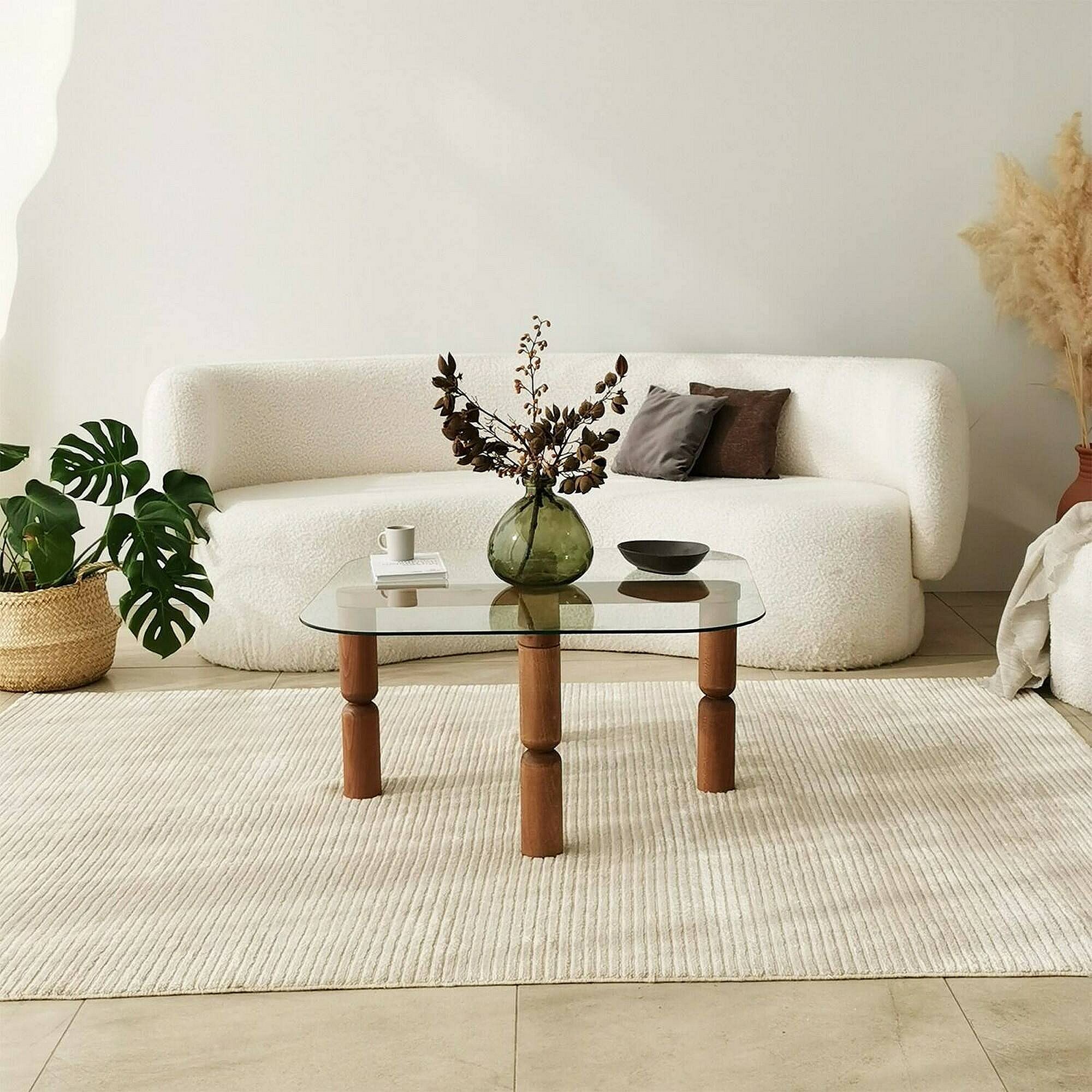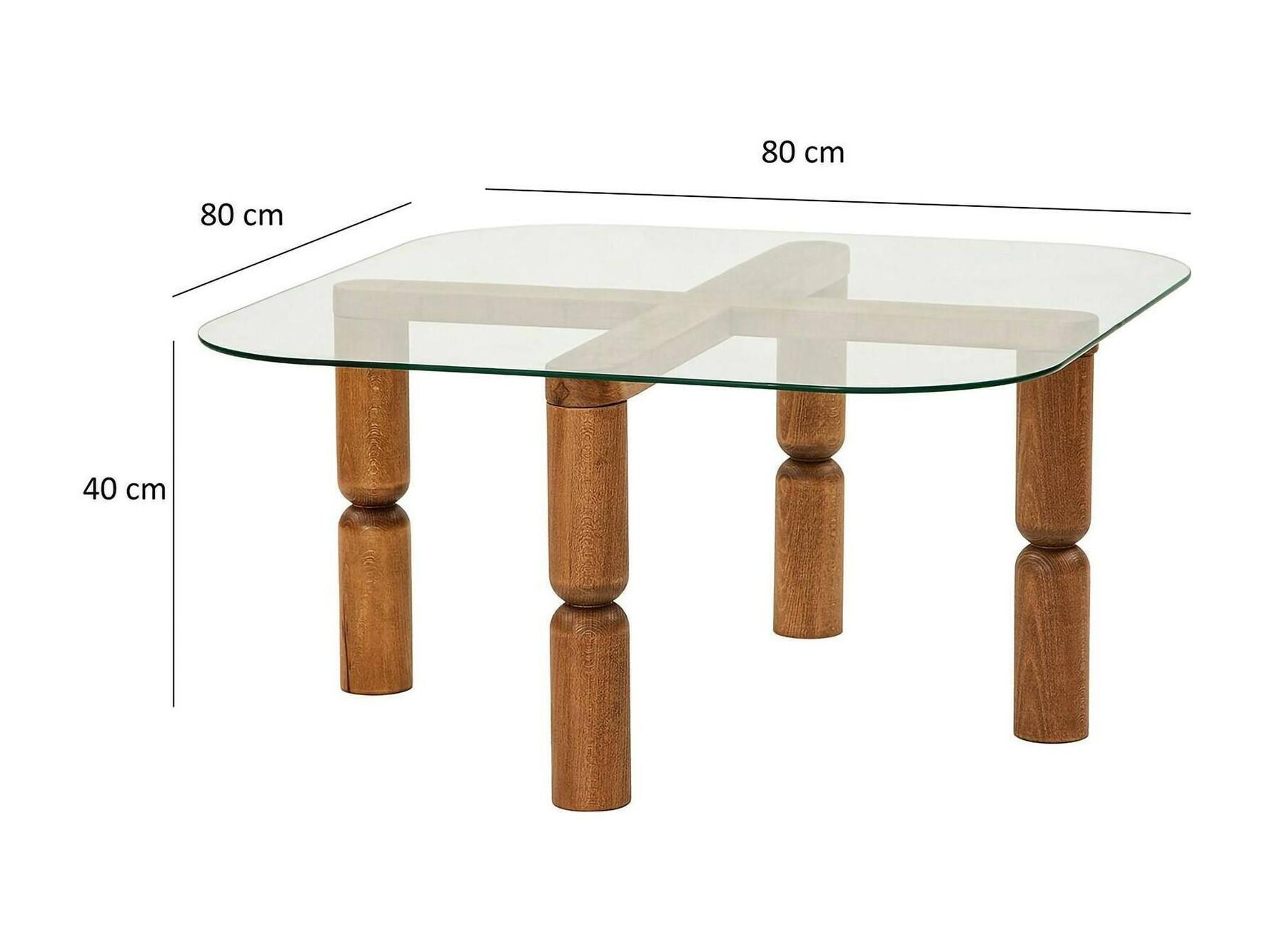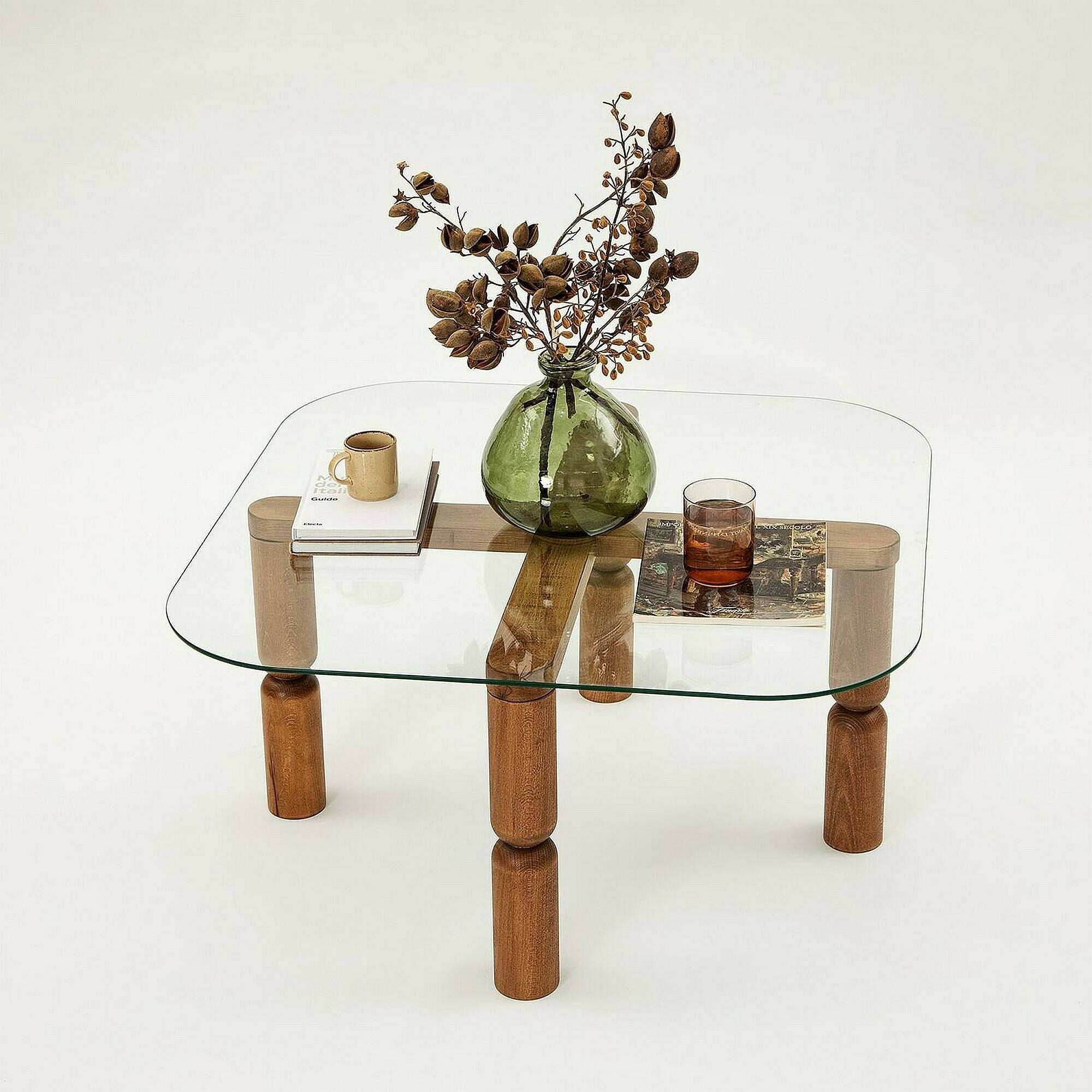 Table basse Psamathe, Table basse, Porte-revues pour canapé, Etagère de salon, 80x80h40 cm, Noyer et Transparent