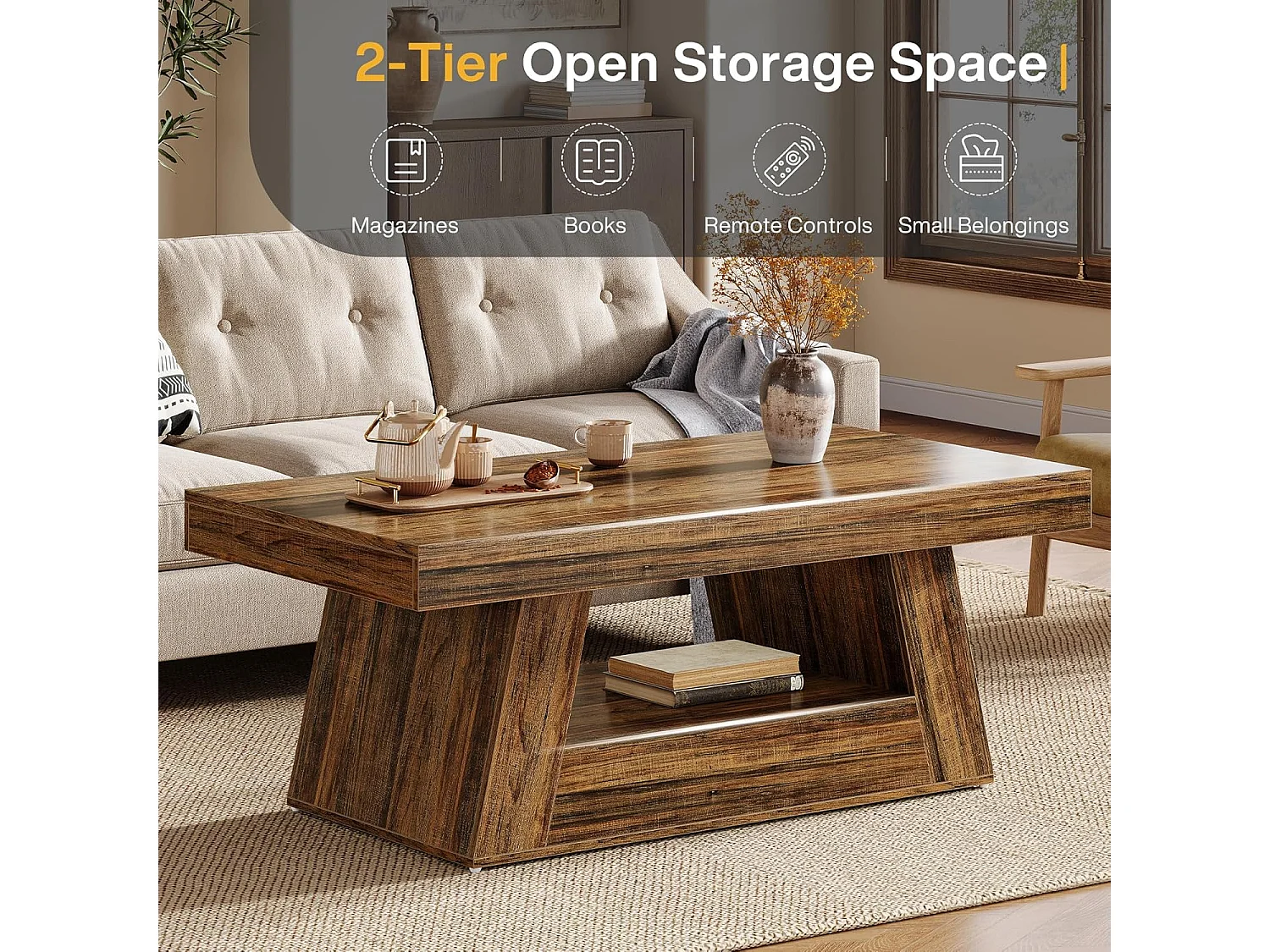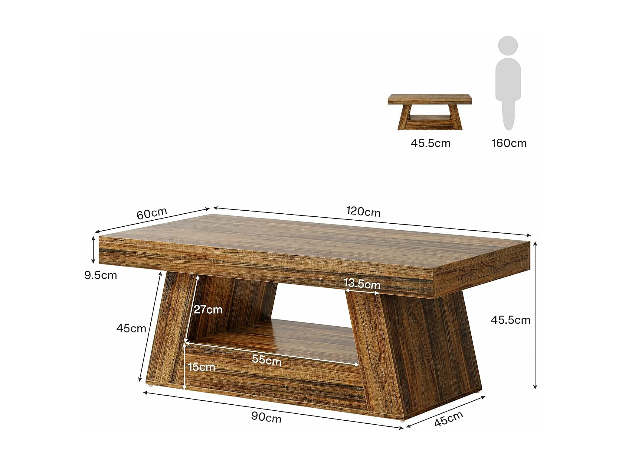 Table basse rectangulaire à 2 niveaux avec rangement - Marron rustique - 120 x 60 cm