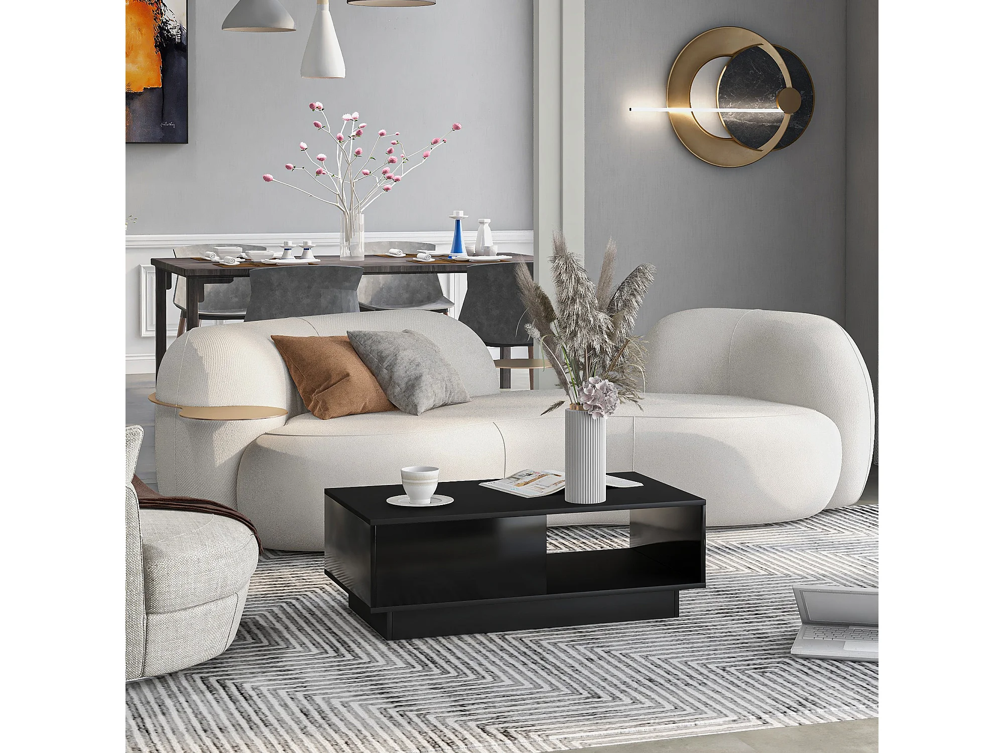 Table basse à deux niveaux LED RGB 16 couleurs surface brillant avec étagère ouverte et tiroir coulissant noir