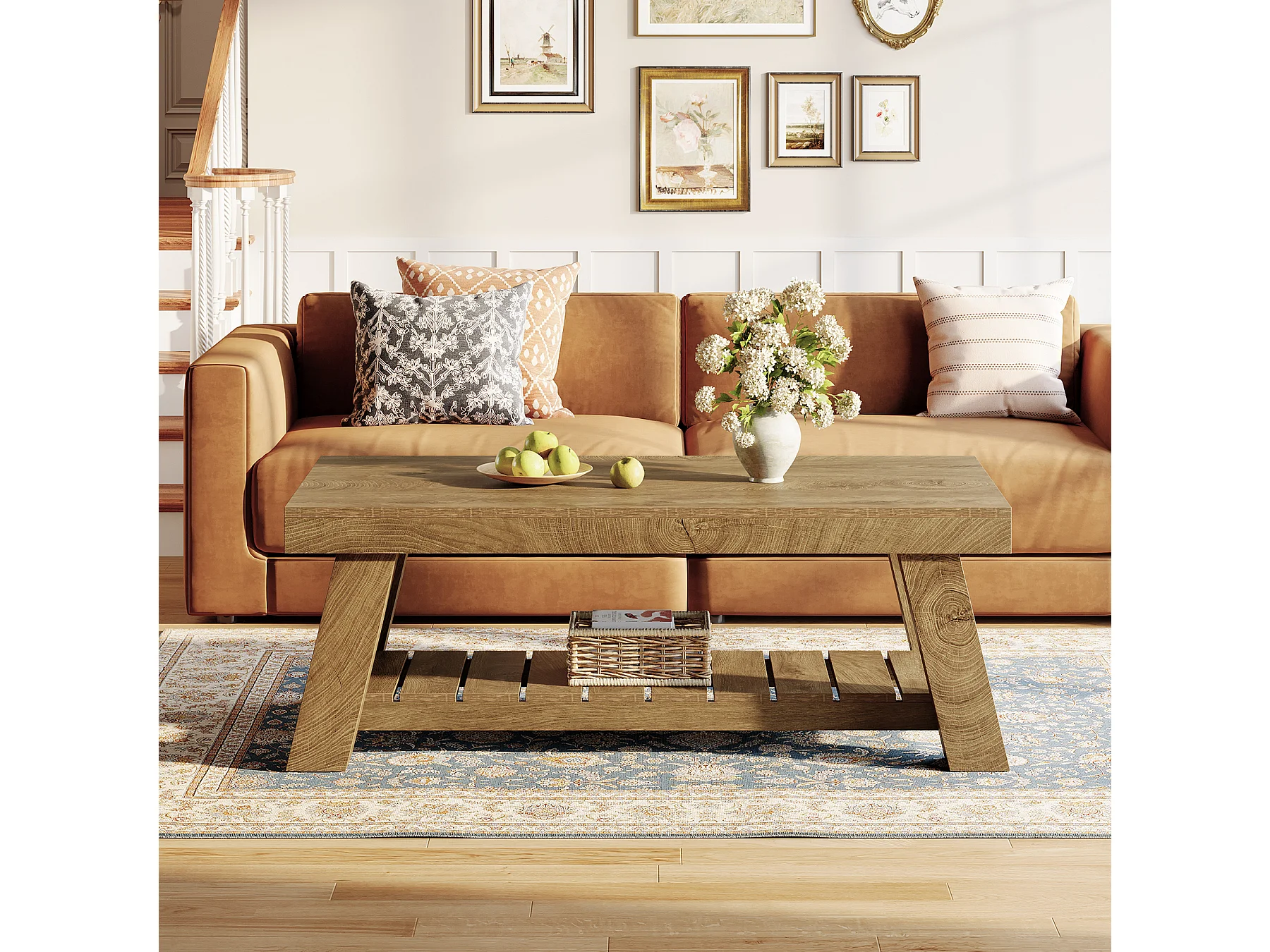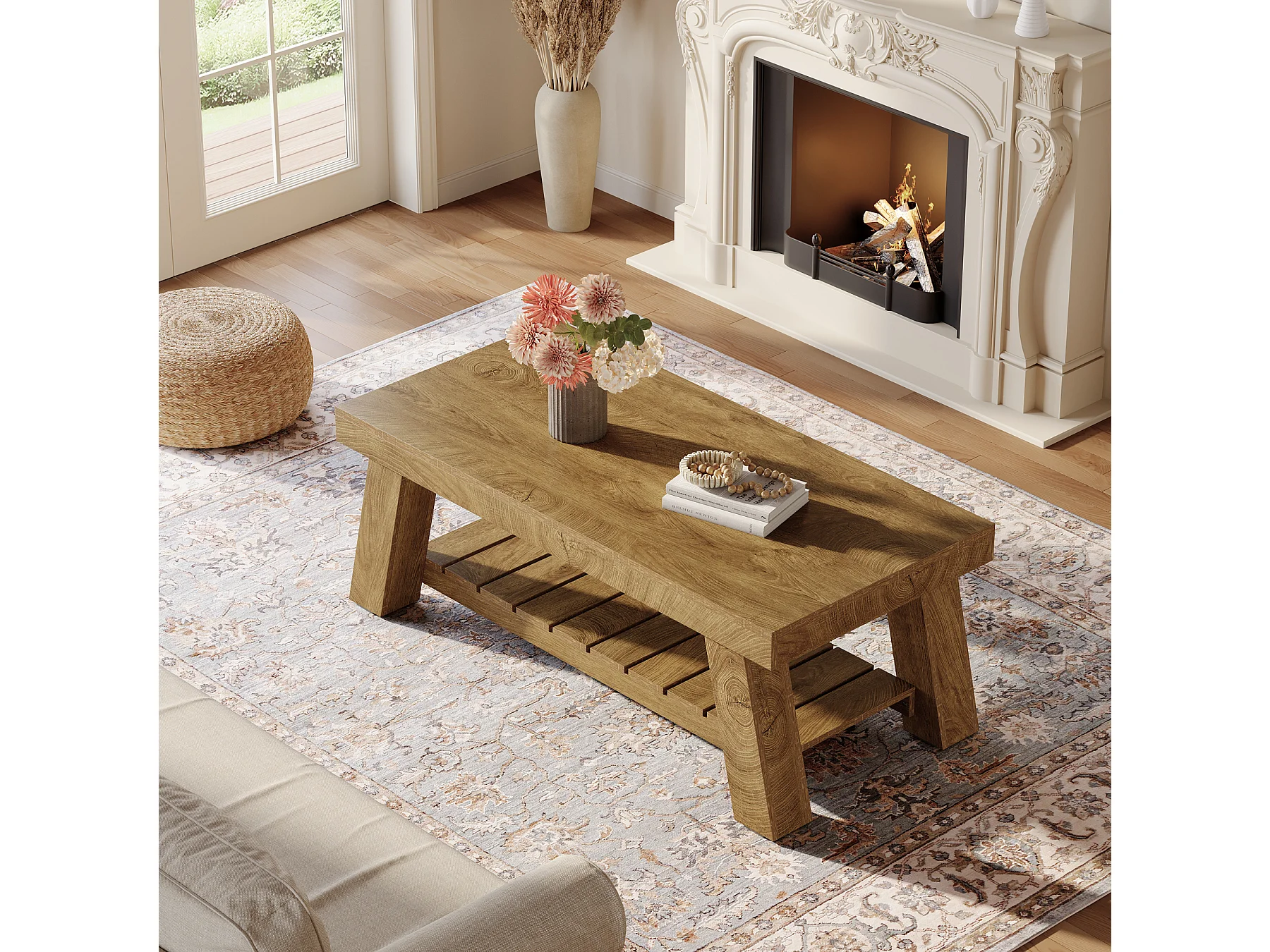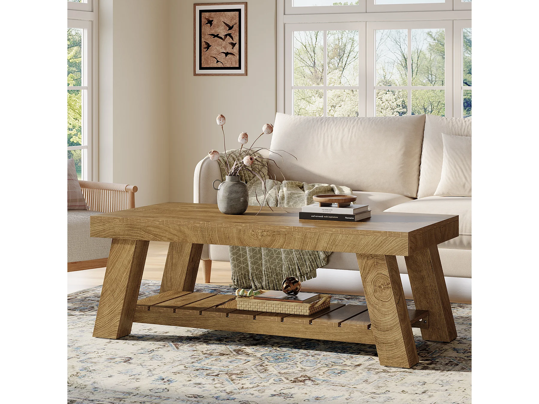 Table basse rectangulaire rustique avec rangement à 2 niveaux, 120 × 60 × 45 cm